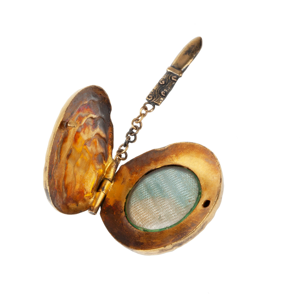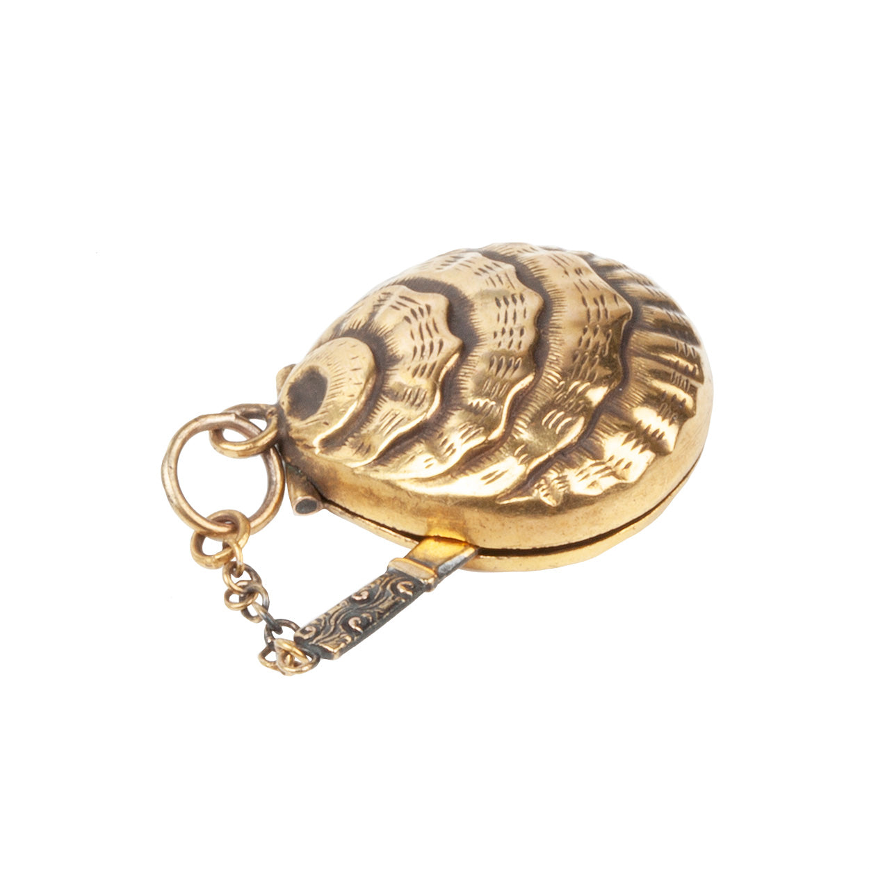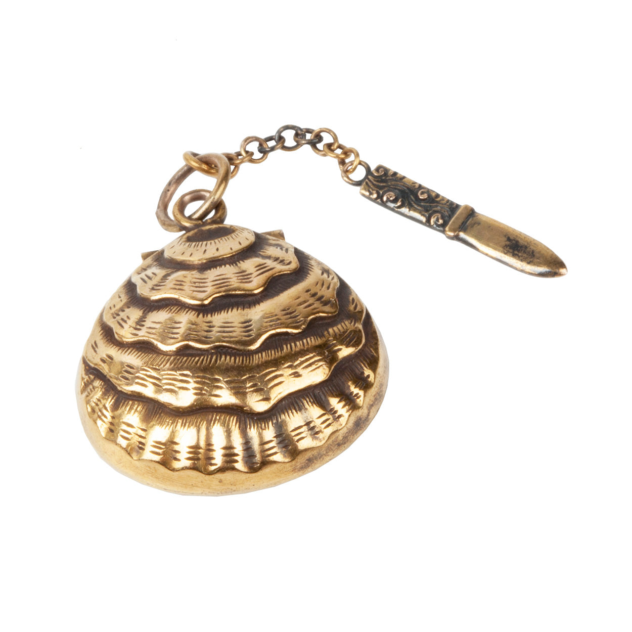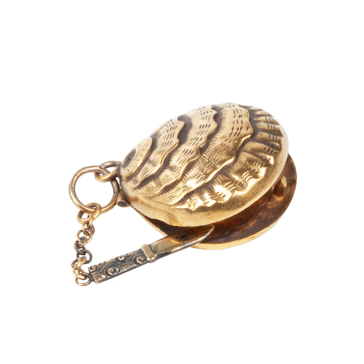 Early Victorian era oyster locket charm, in gold. The oyster locket opens with a tiny oyster knife charm. The original frames and glass are intact and personal images can be placed in the locket compartments. English in origin. Circa 1840.