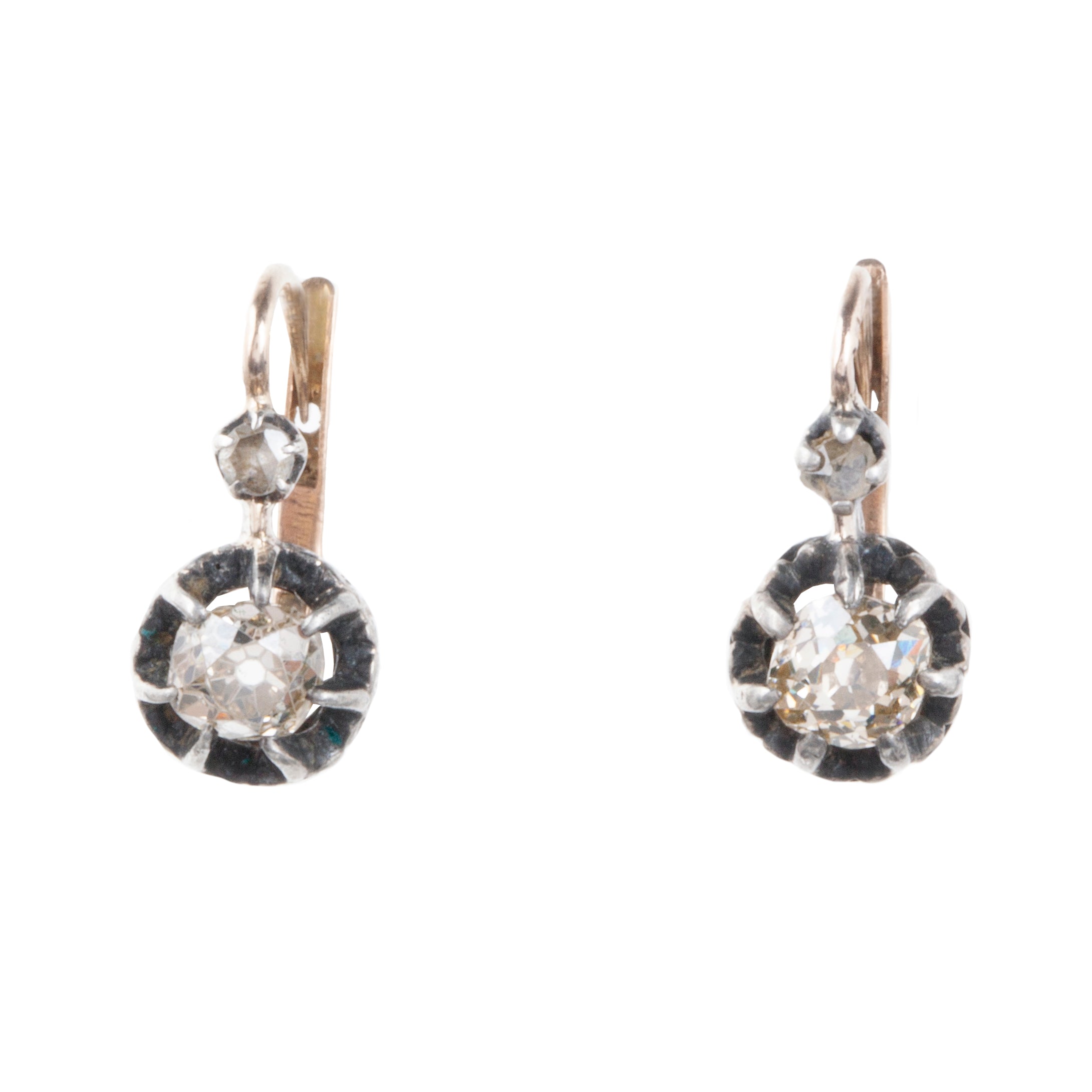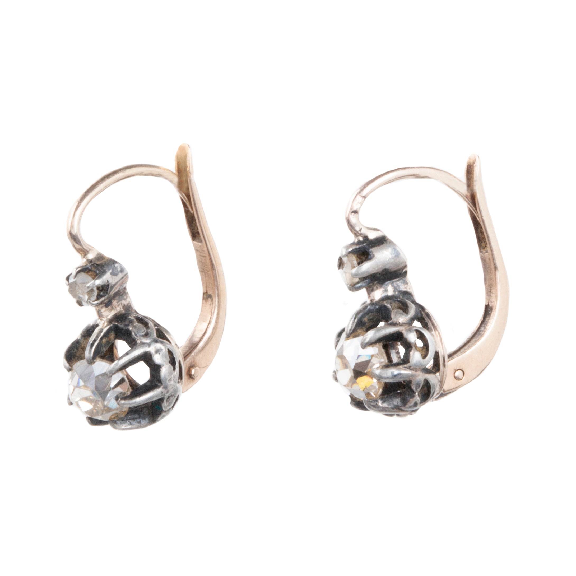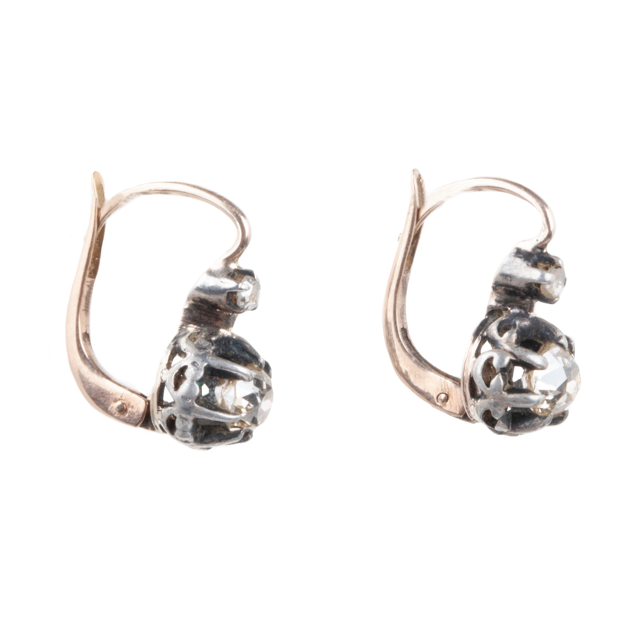Edwardian two stone diamond earrings. Old mine cut diamonds set in silver on gold. English in origin. Circa 1900. Austro Hungarian In origin.