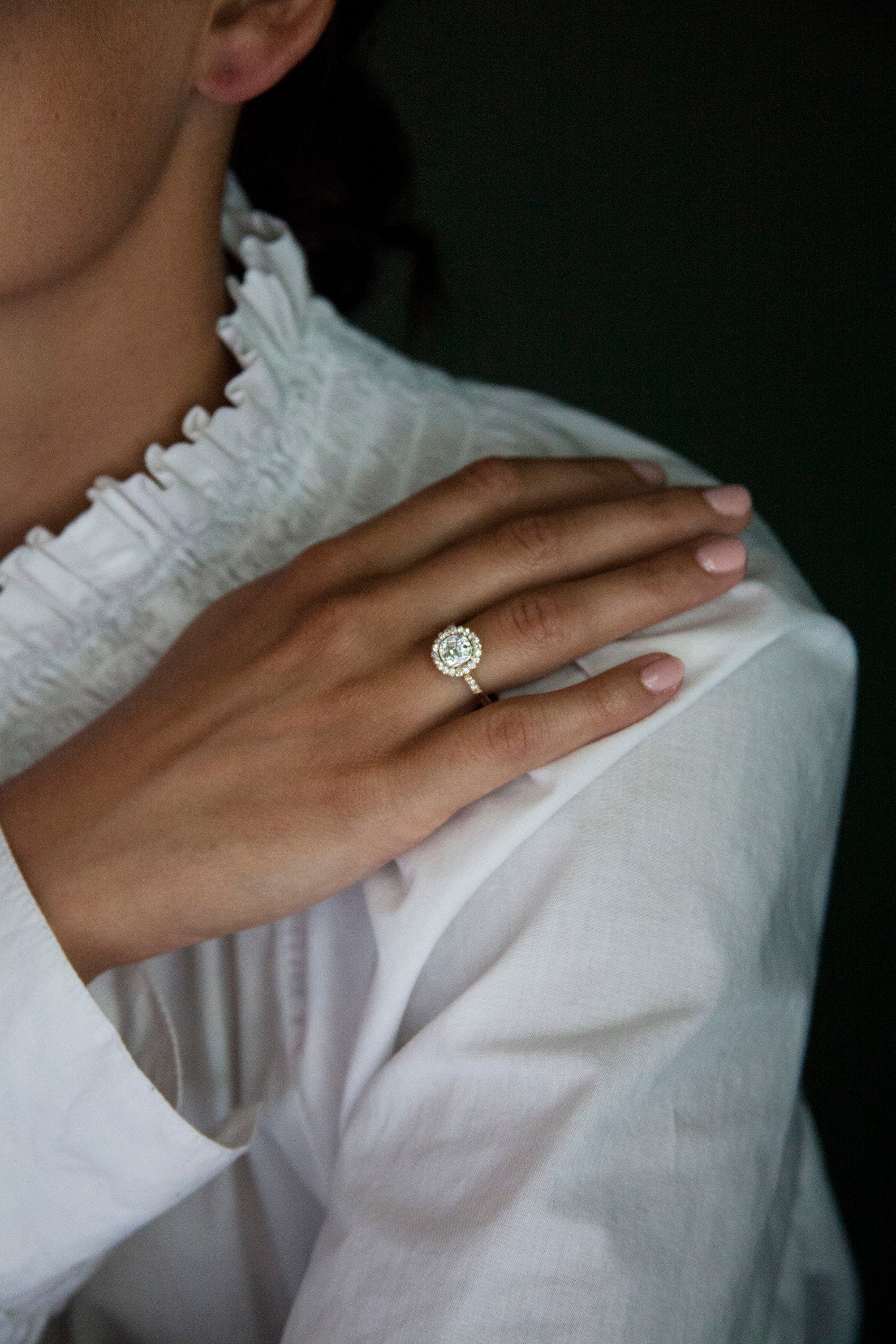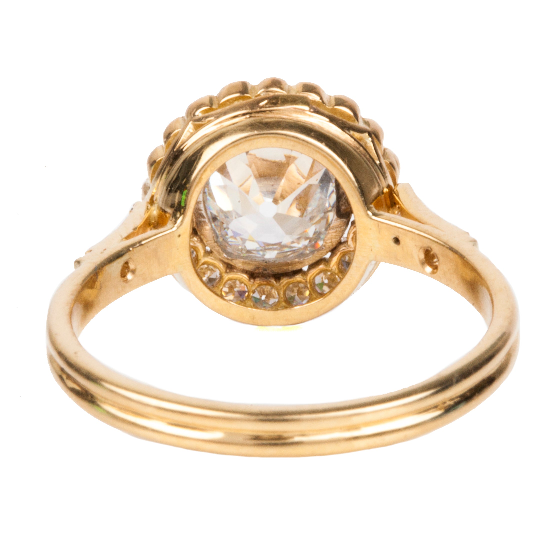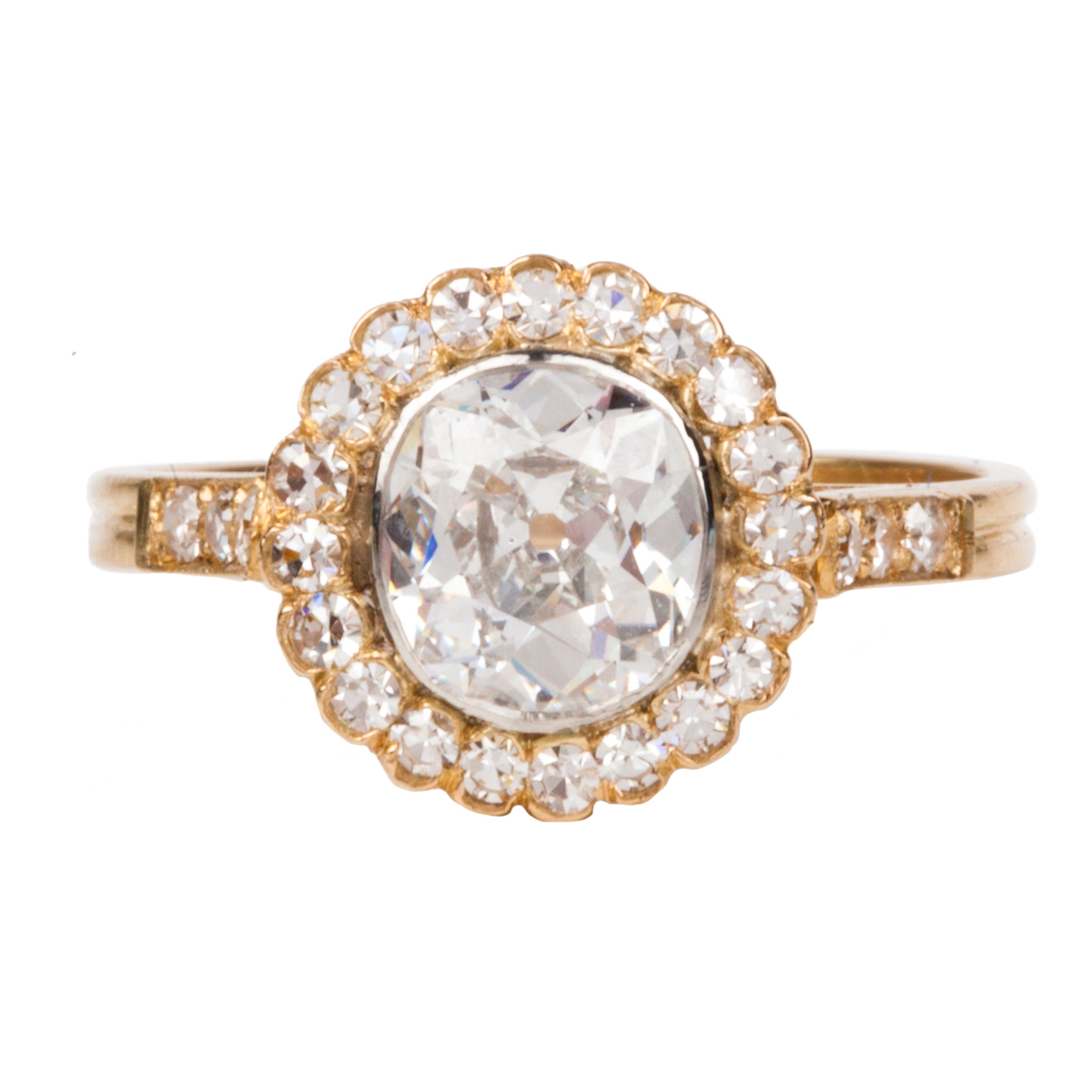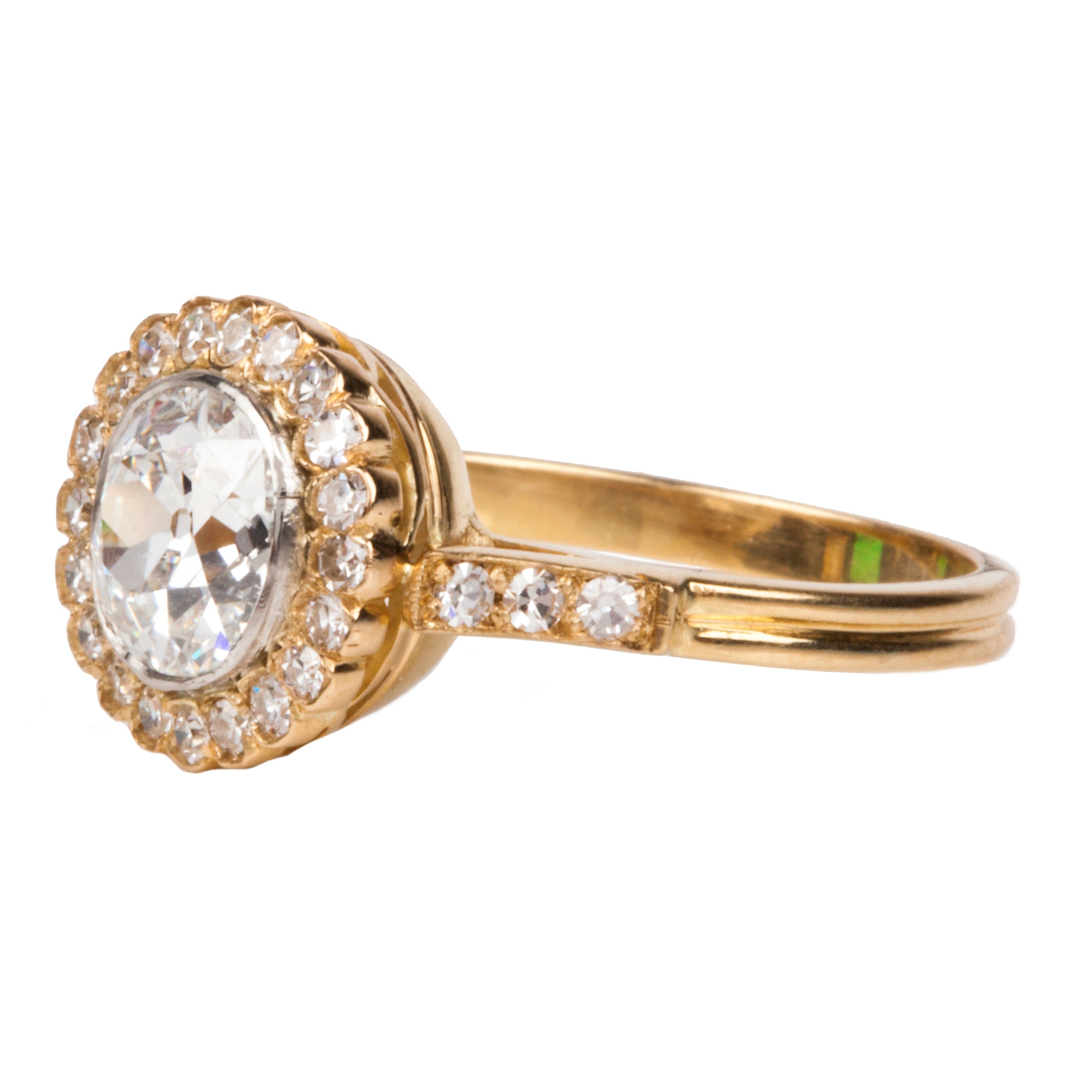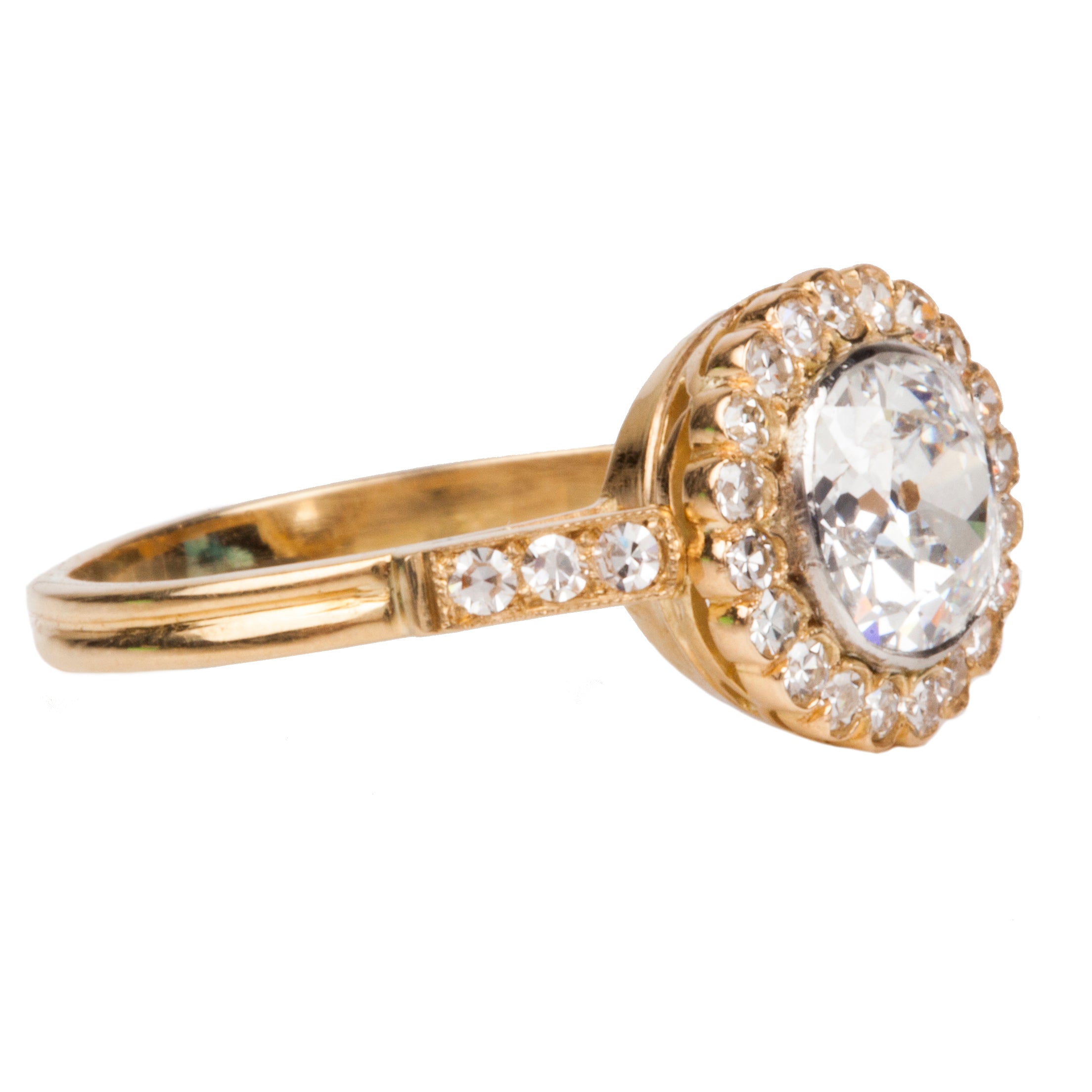 Cluster diamond ring centering on a 1.04 carat old mine cut diamond GIA certified to be F in color and VS1 in clarity. Surrounded by 20 round single cut diamonds with 6 additional diamonds on shoulders. Approximate total carat weight of 1.3 carats. 18K yellow gold and platinum setting.