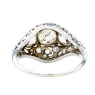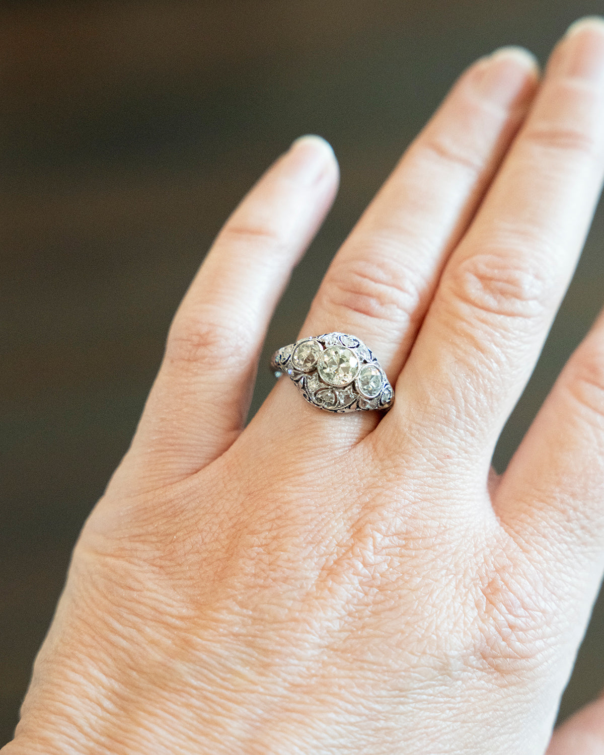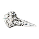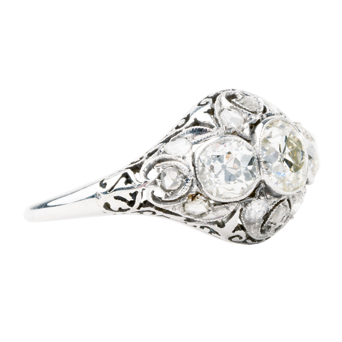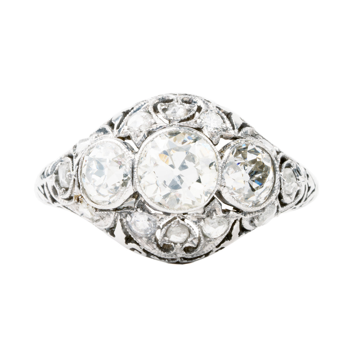 Edwardian era filigree old mine cut diamond ring. Three diamonds set in a beautifully pierced platinum setting. Continental European origin. Circa 1910.