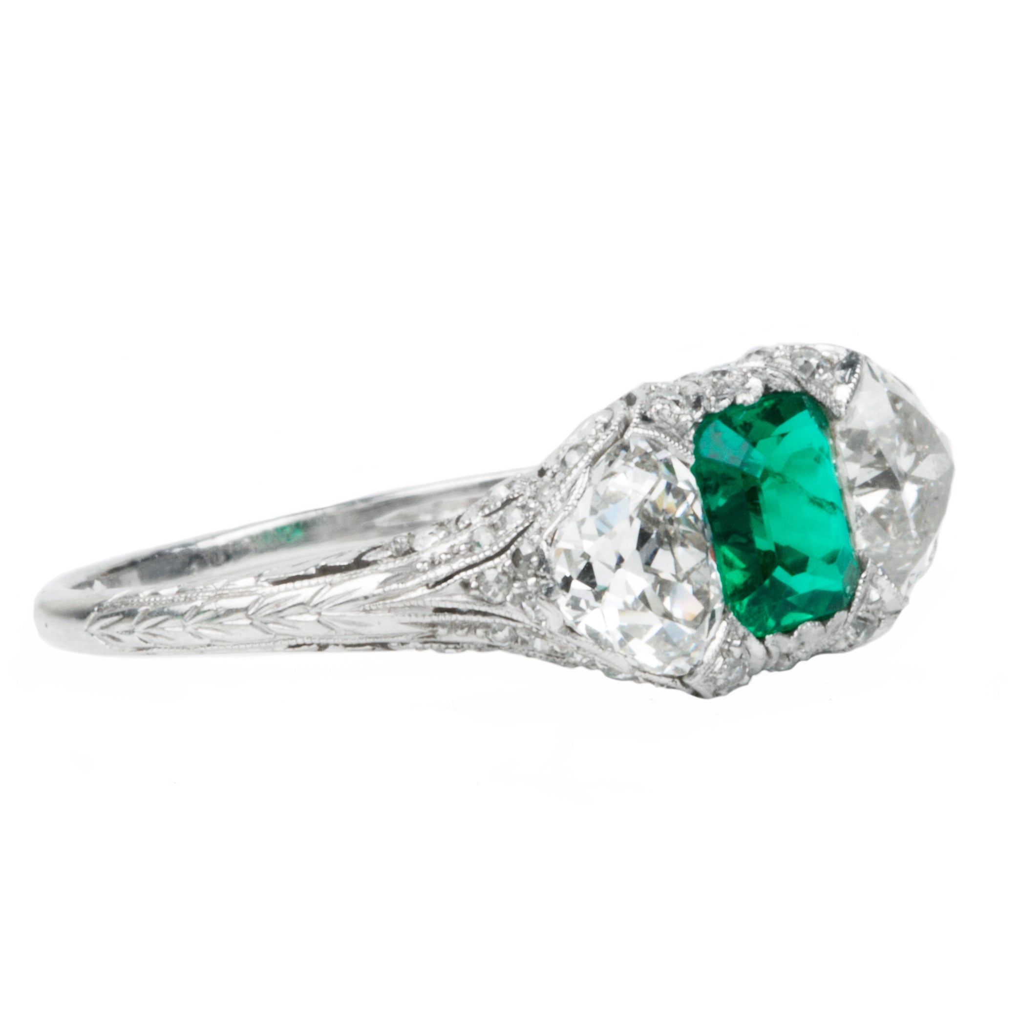Edwardian era diamond and emerald ring with exquisite filigree Setting. The central Emerald is approximately 0.85 carats. The two side diamonds are unusual calf cut stones and approximately 1.55 carats in total diamond weight. There are many additional single cut diamonds set into the filigree setting, approximately 0.45 total carat weight.