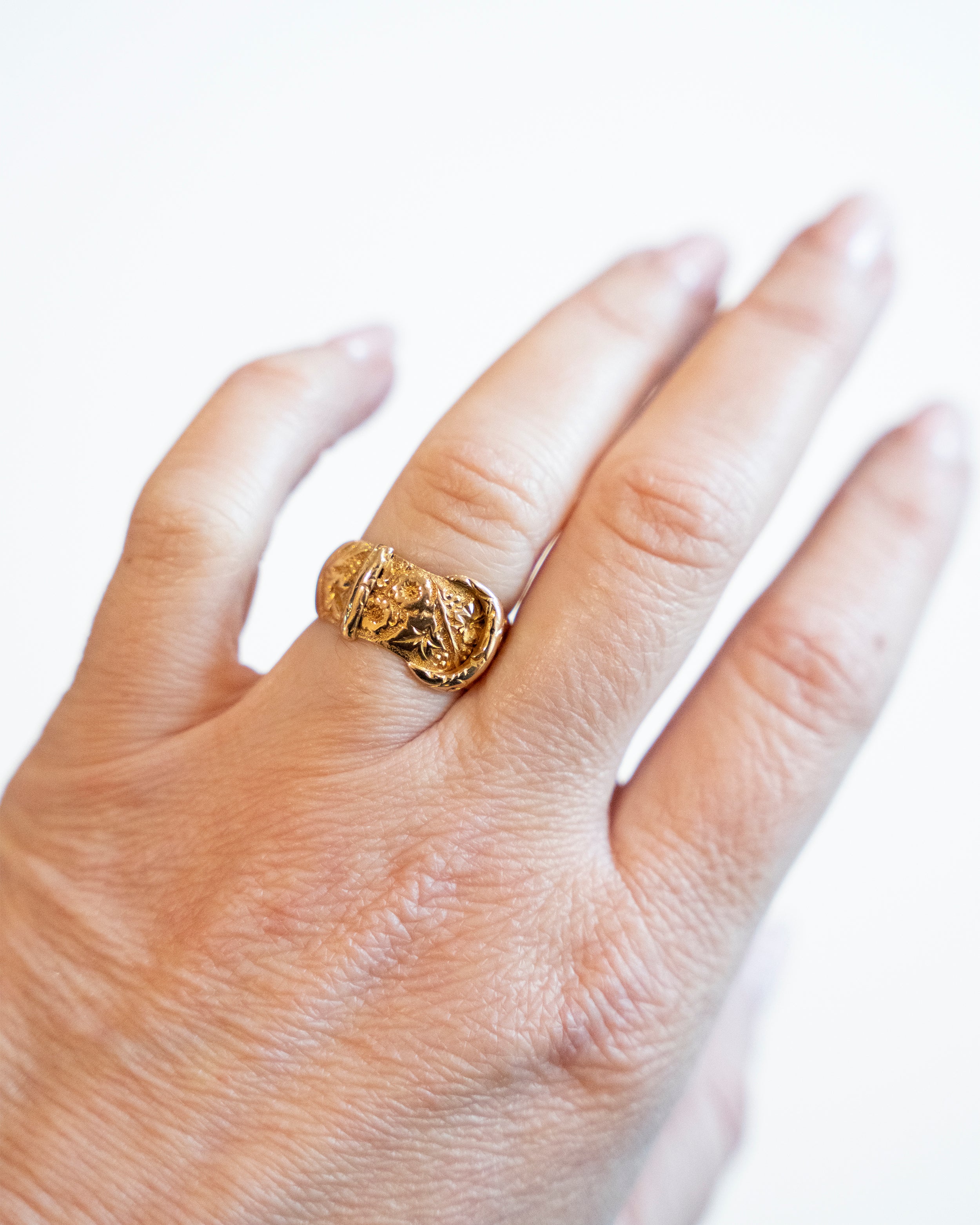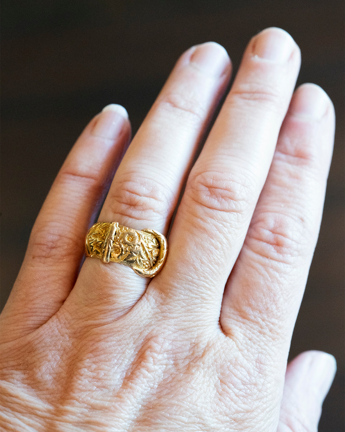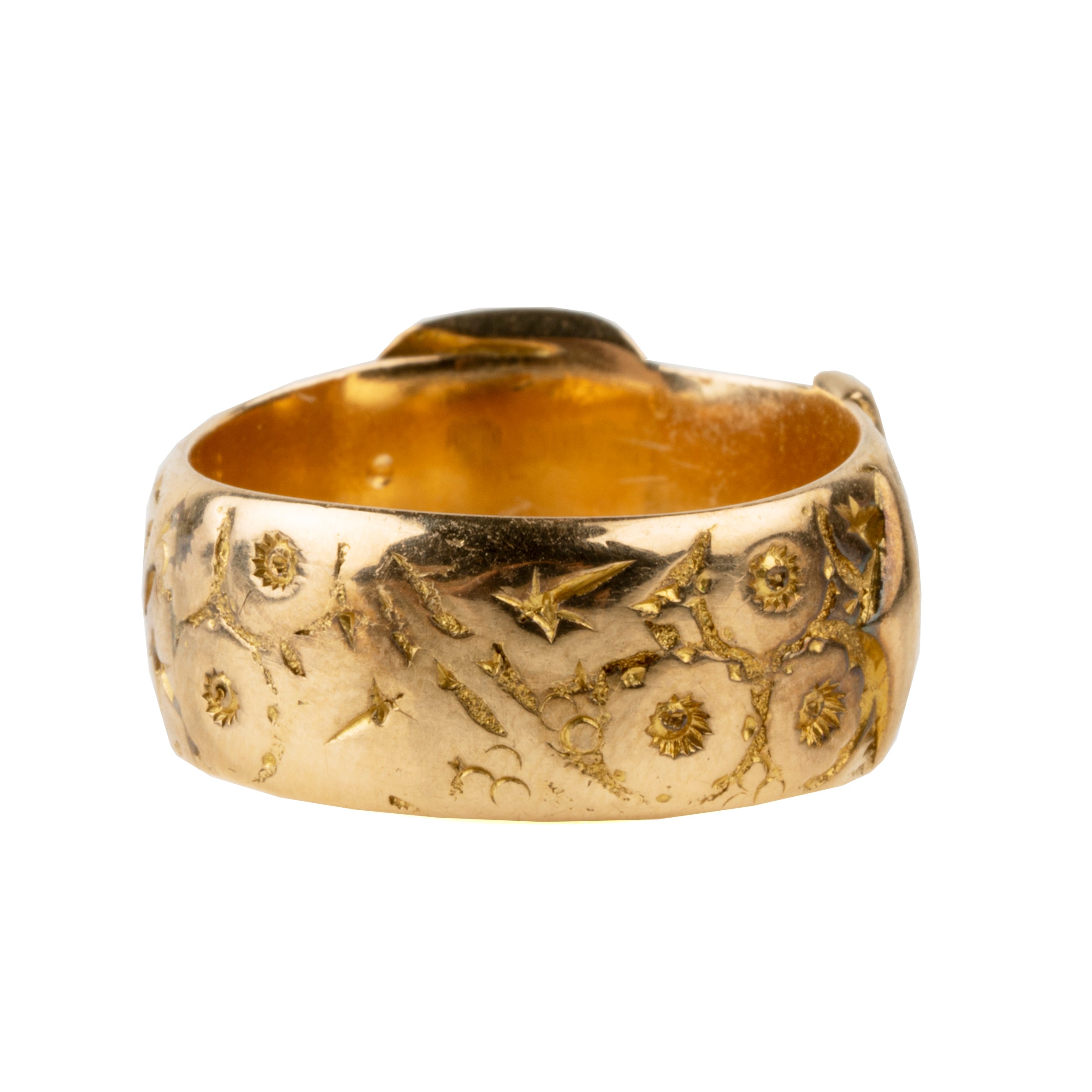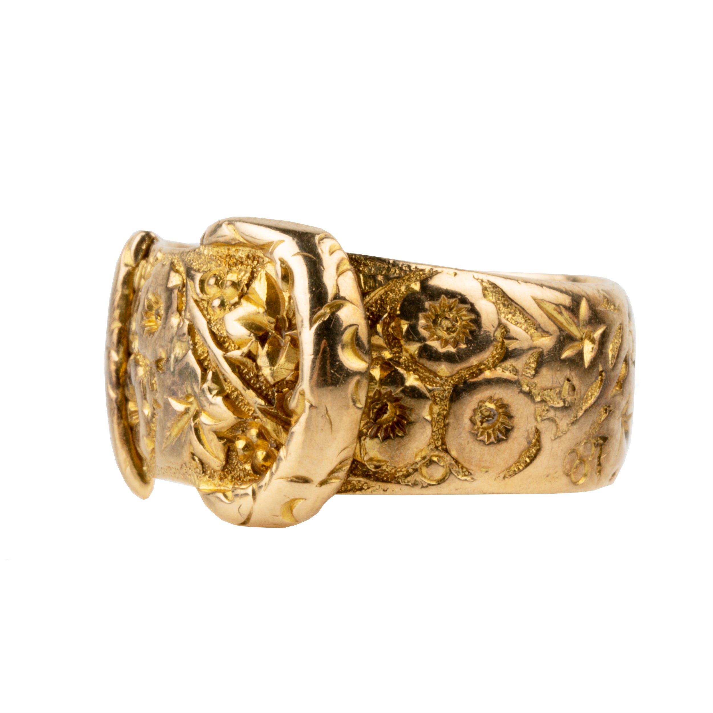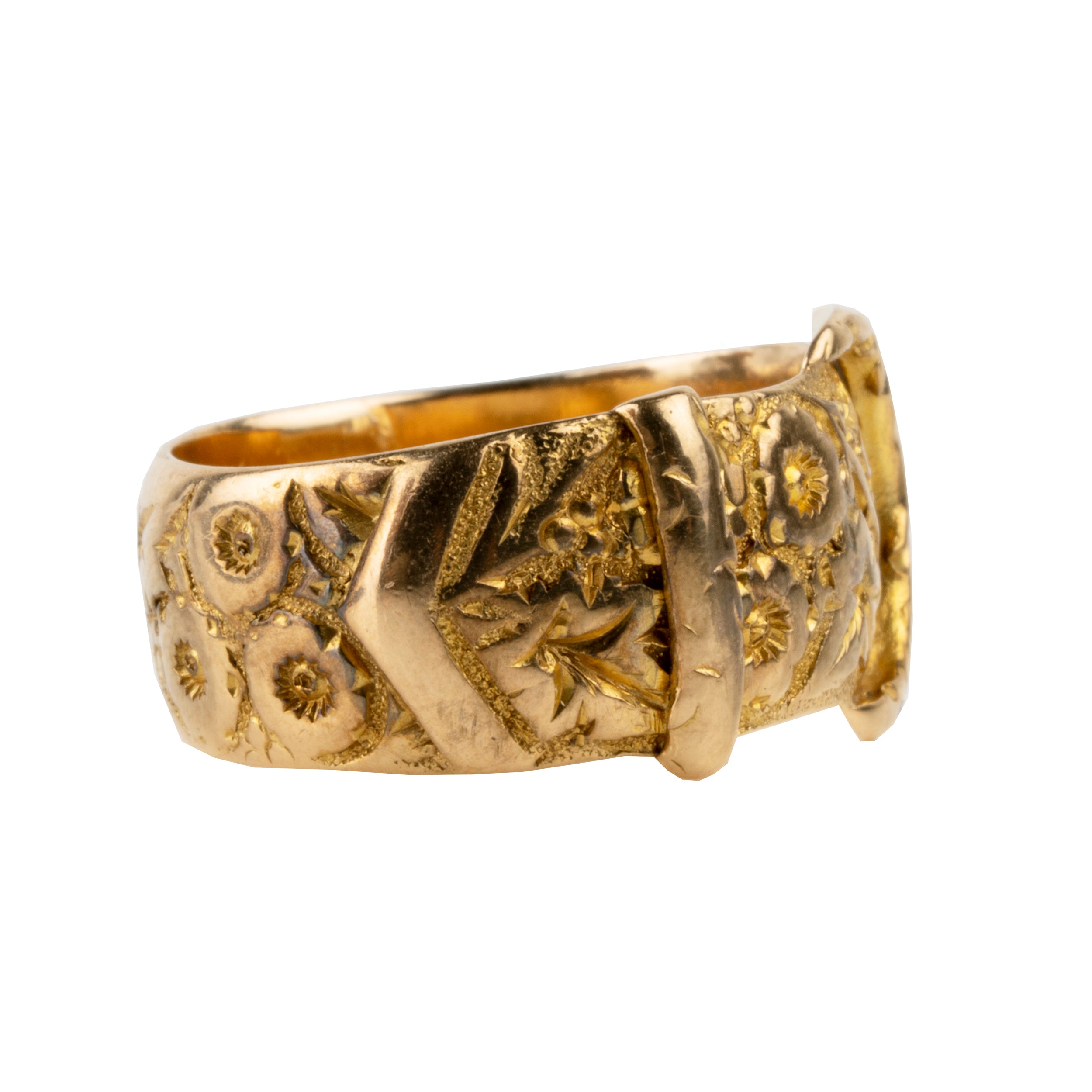 Edwardian era gold wide buckle band ring, in 18k gold. Engraved floral decorations. Birmingham hallmarks. English in origin. Circa 1913.