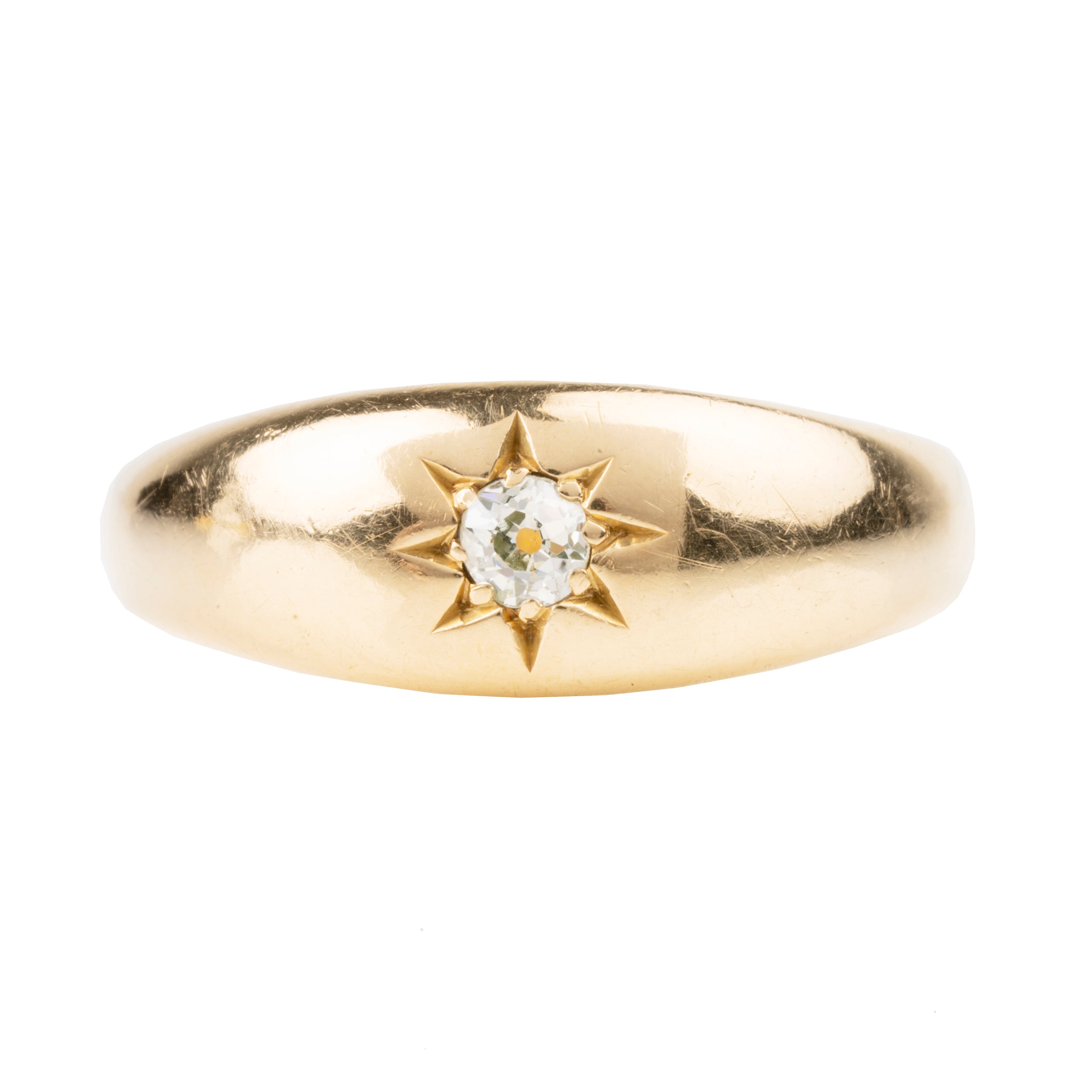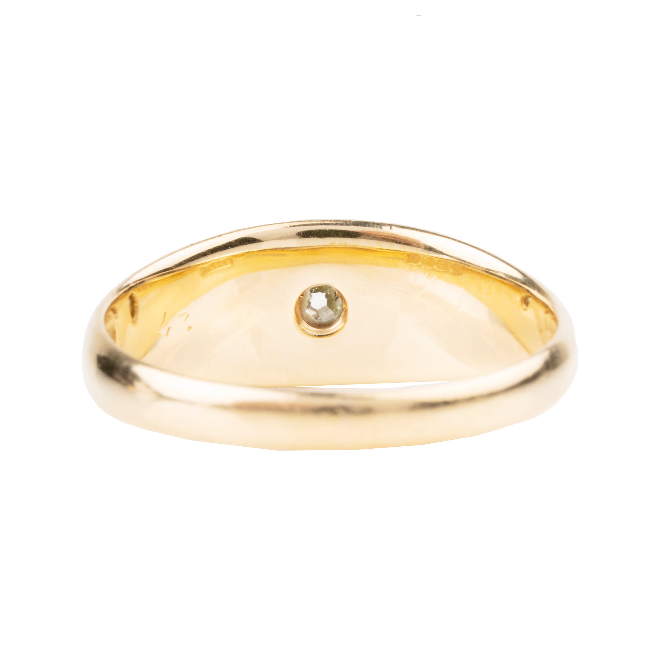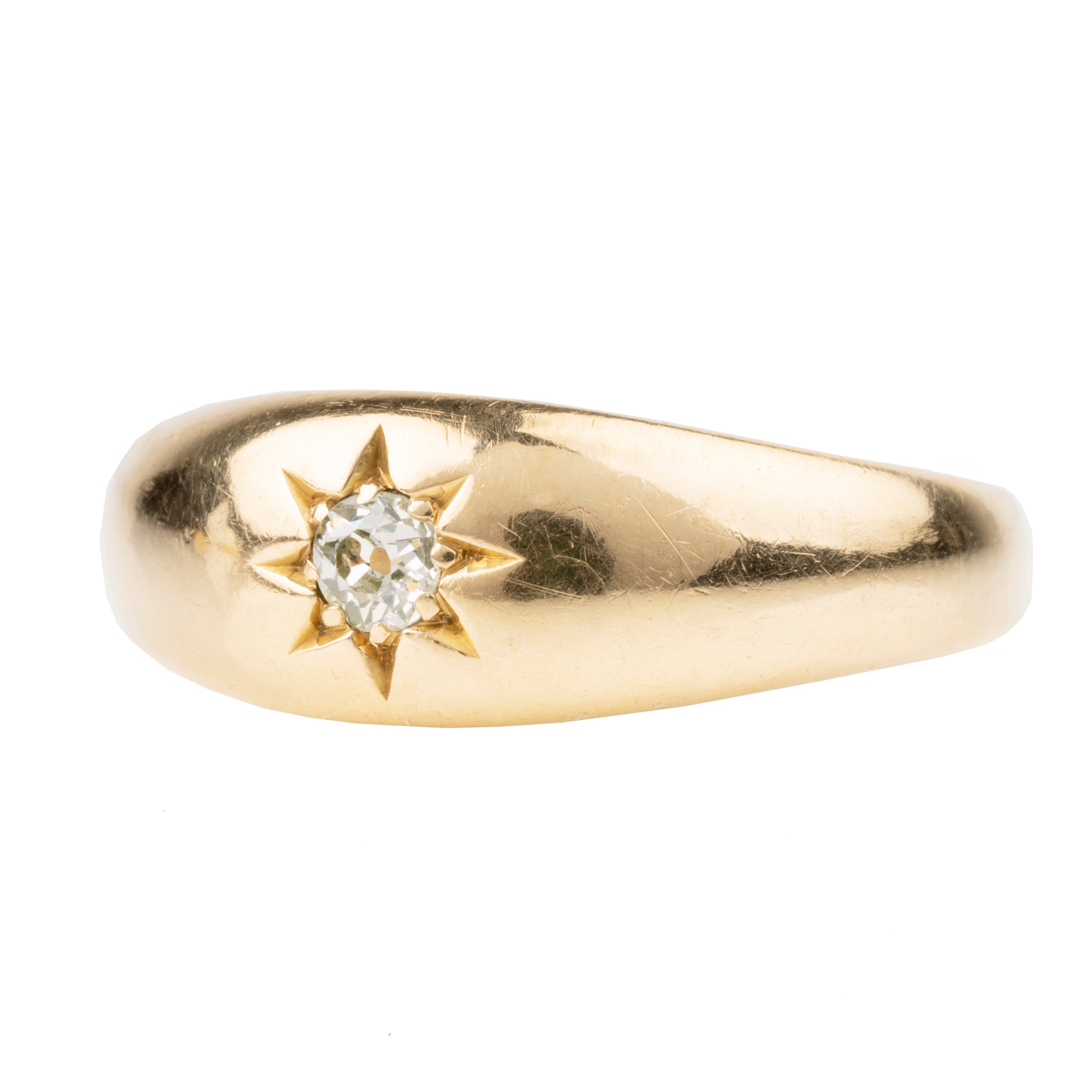 Edwardian era flush set old mine cut diamond ring, in 18k gold. English in origin. Birmingham hallmarks. Circa 1913.