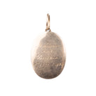 Edwardian mother of pearl and diamond set initial pendant, in 15k gold. The oval-shaped pendant has a mother-of-pearl panel with a diamond set 'A' initial in oxidized silver. On verso, engraved "Maimie and Binkie 17, April 1909". English in origin.