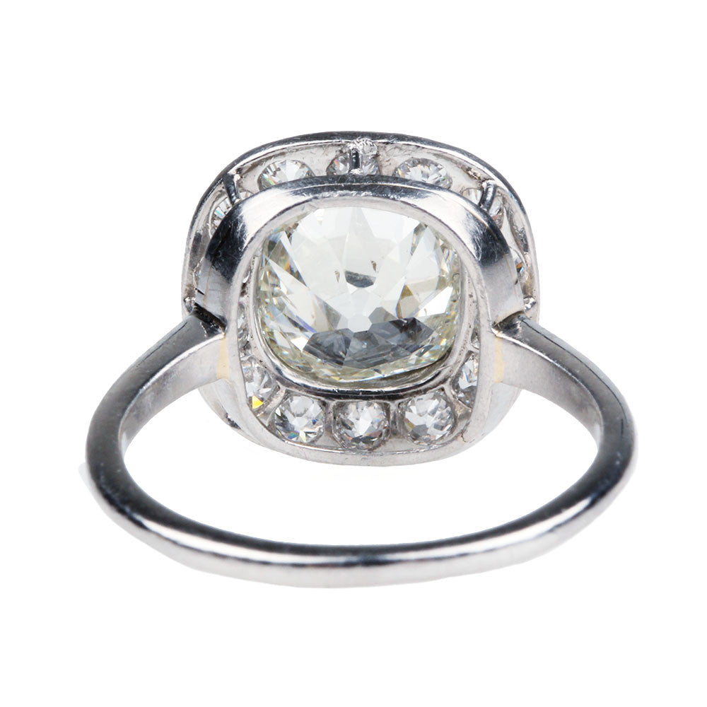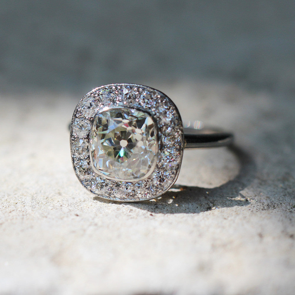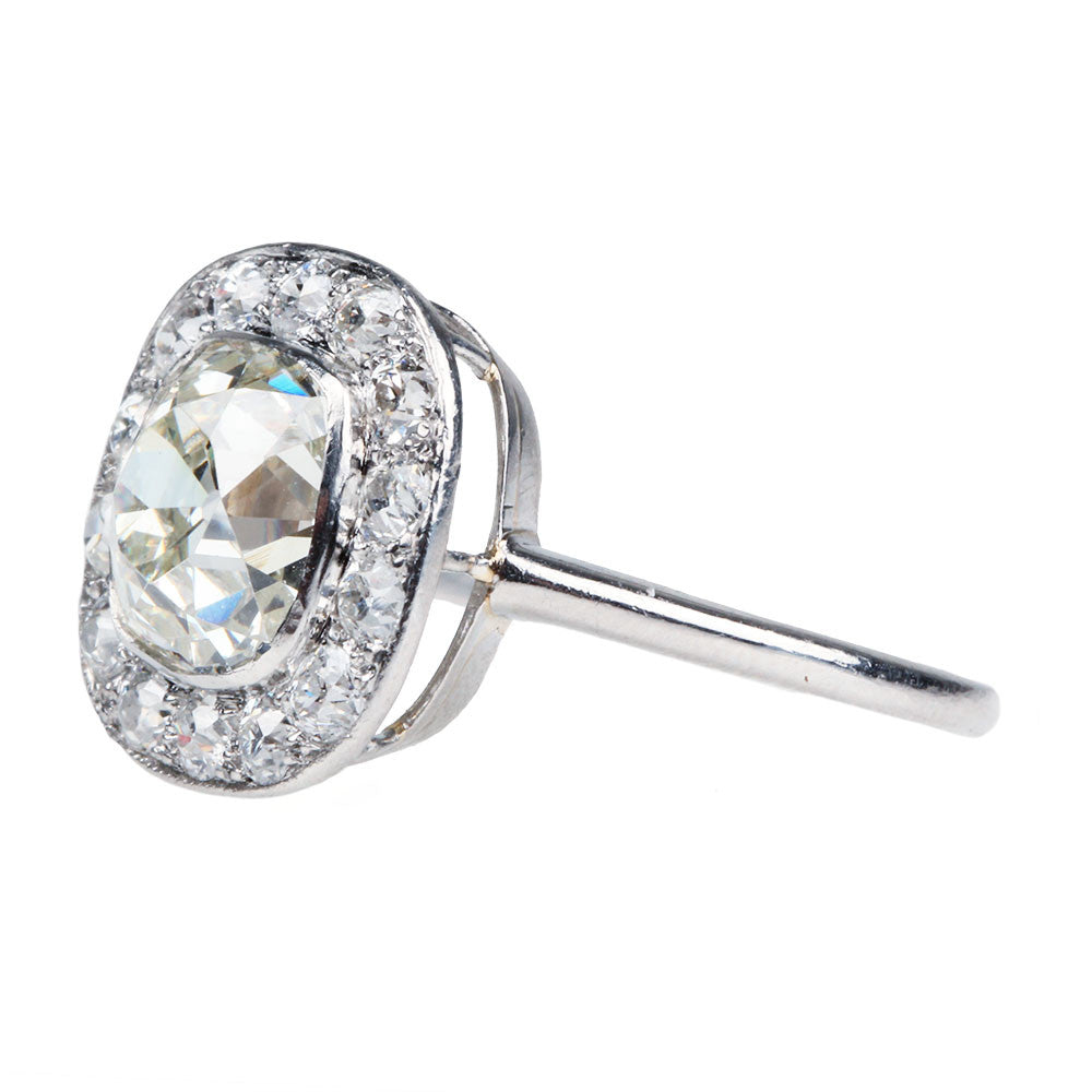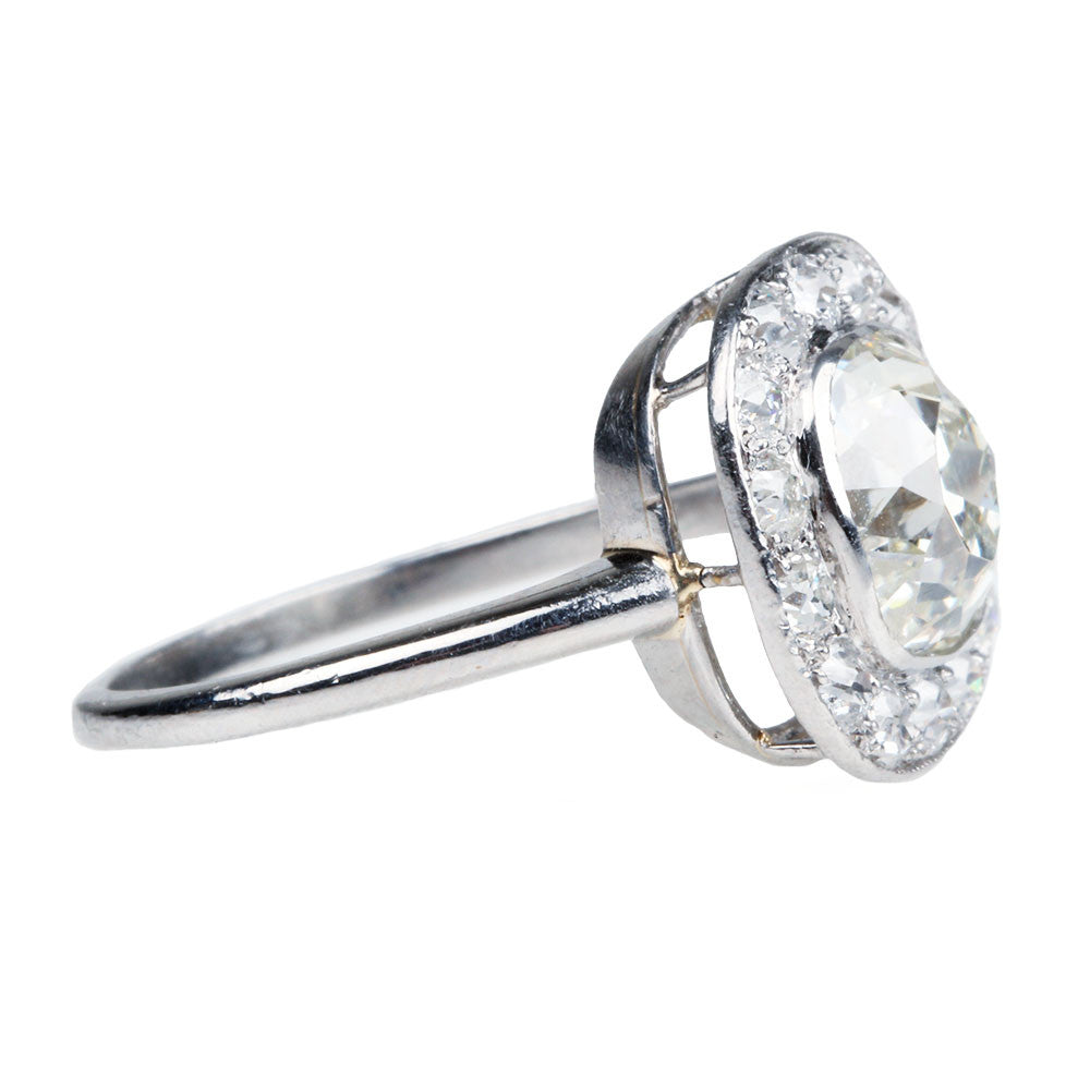 Edwardian old mine cut diamond cluster ring, in platinum. 1.98 carat center stone, - K color, SI2 in clarity. 14 old cut diamonds surround, approximately 0.42 carats in total diamond weight, I- color, SI2 - VS2 in clarity. English in origin, circa 1910.