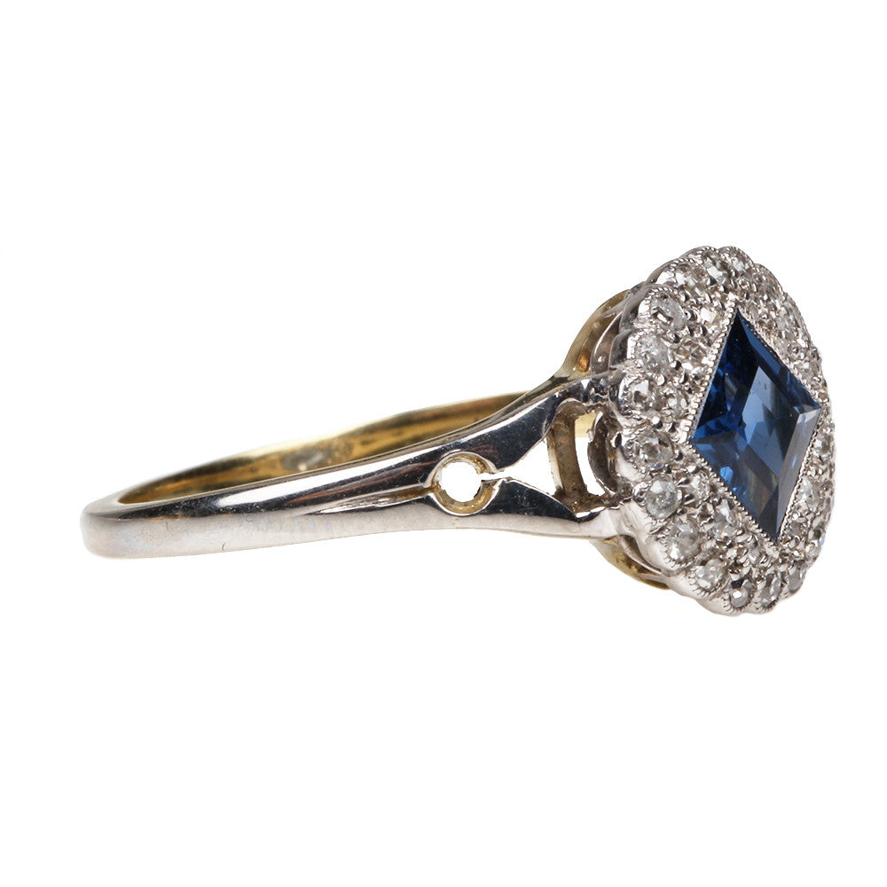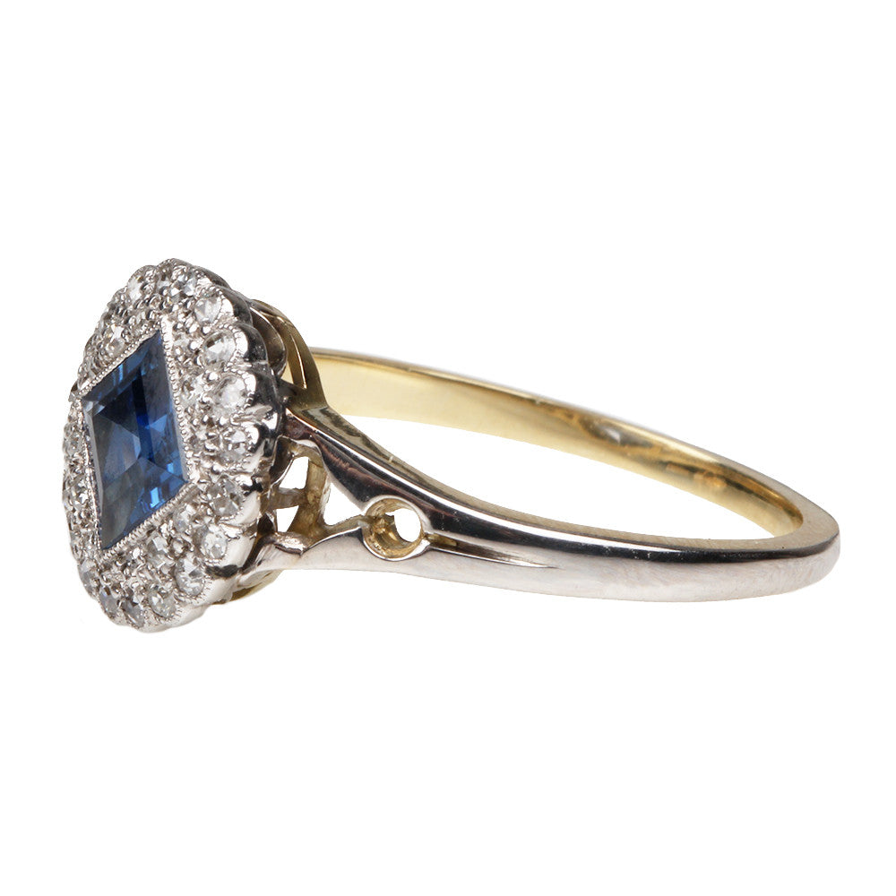 Edwardian sapphire and diamond cluster ring. In platinum on 18k gold, with key hole details. English in origin. Circa 1910.