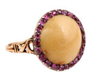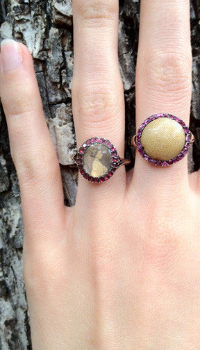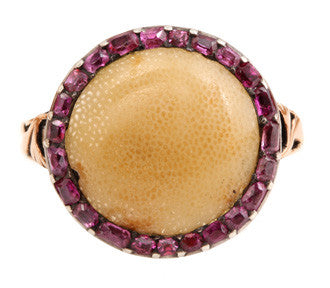 Mid 18th century English fossilized palm surrounded by garnets and set in 10k gold.