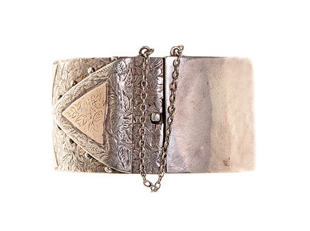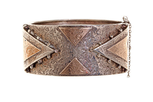 English sterling bangle with rose gold details. Beautiful hand engraved details. Circa 1880's. See our Field Guide to learn more about late 19th century English Sterling.