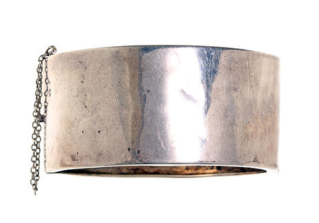 Hinged at side with push-button closure and security chain. 1.25 wide. Inner circumference measures approximately 7.25.