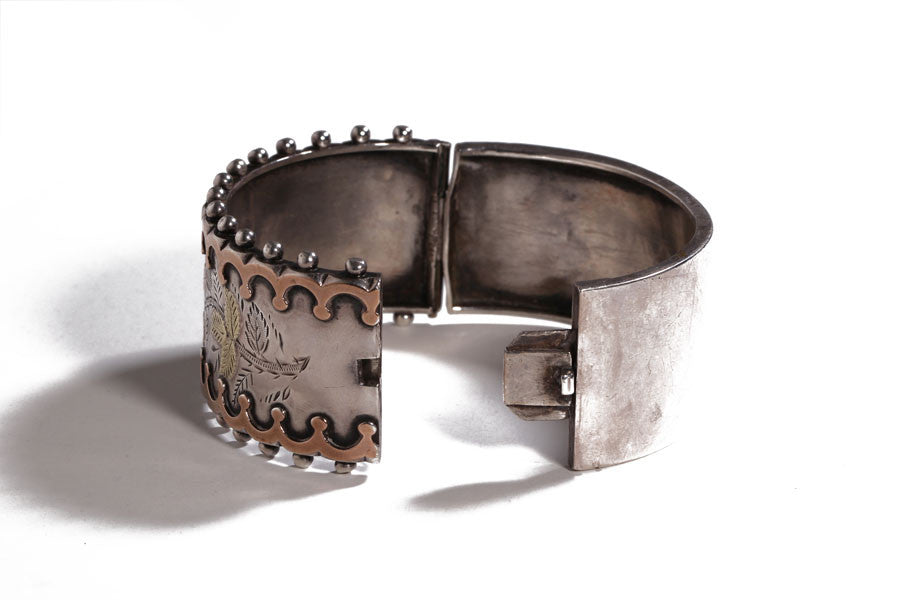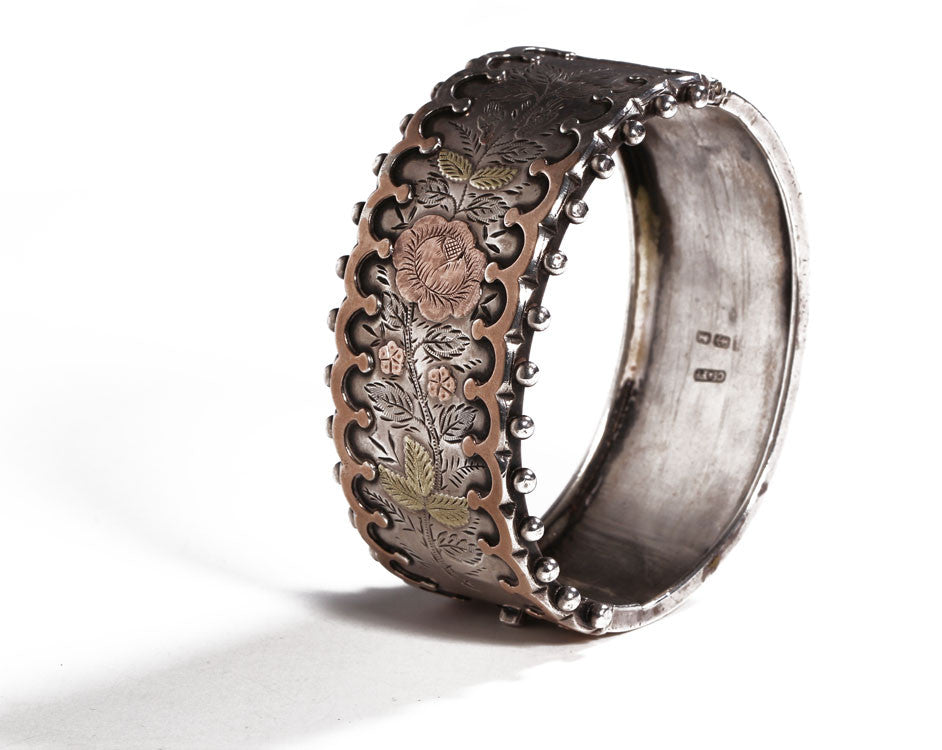 English sterling bangle with beautifully engraved multi colored gold roses a Victorian symbol love and beauty.