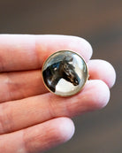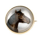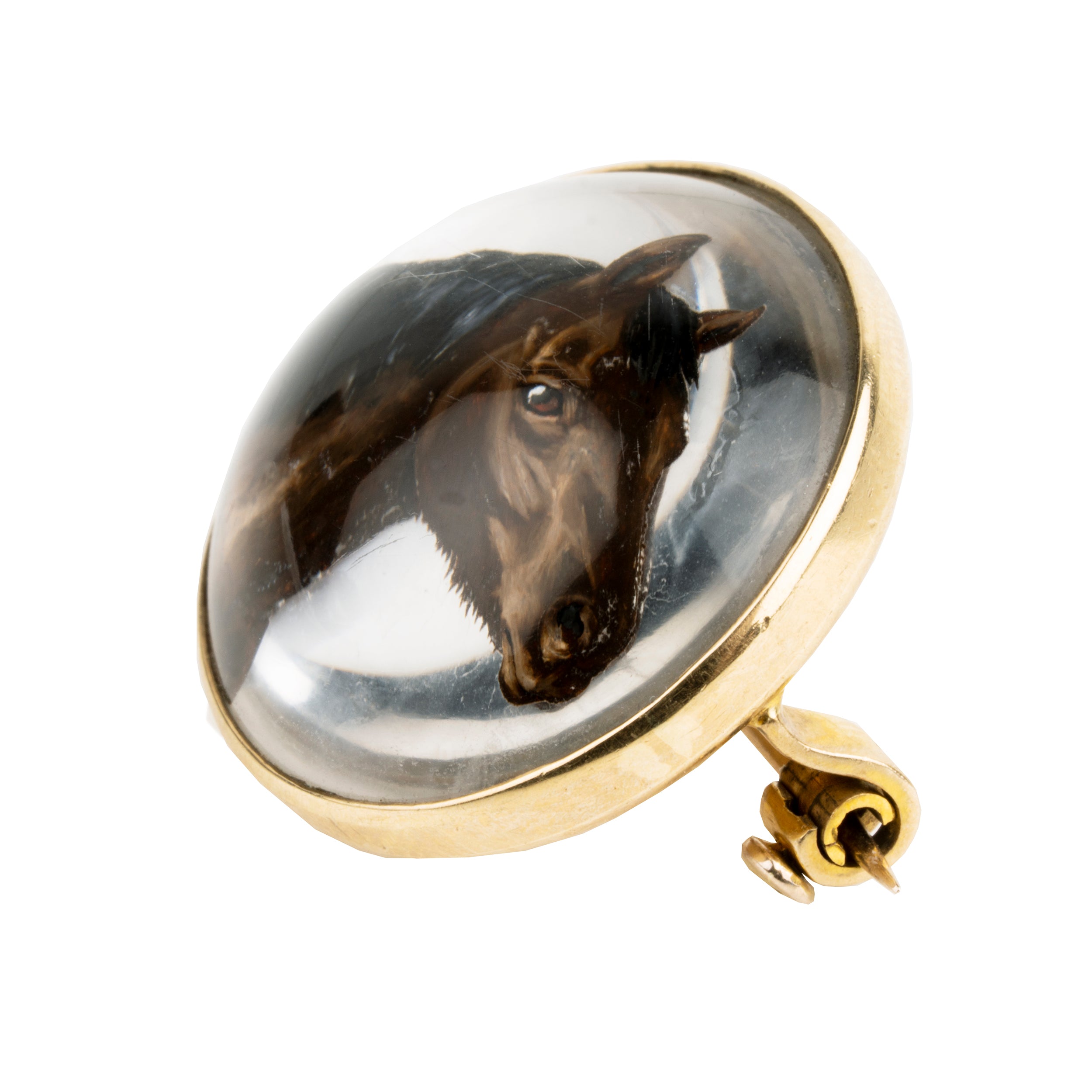 Beautifully carved and painted Essex crystal pendant. A depiction of a brown horse or pony in bright crystal. Found in London, Circa 1900 in 9k gold.