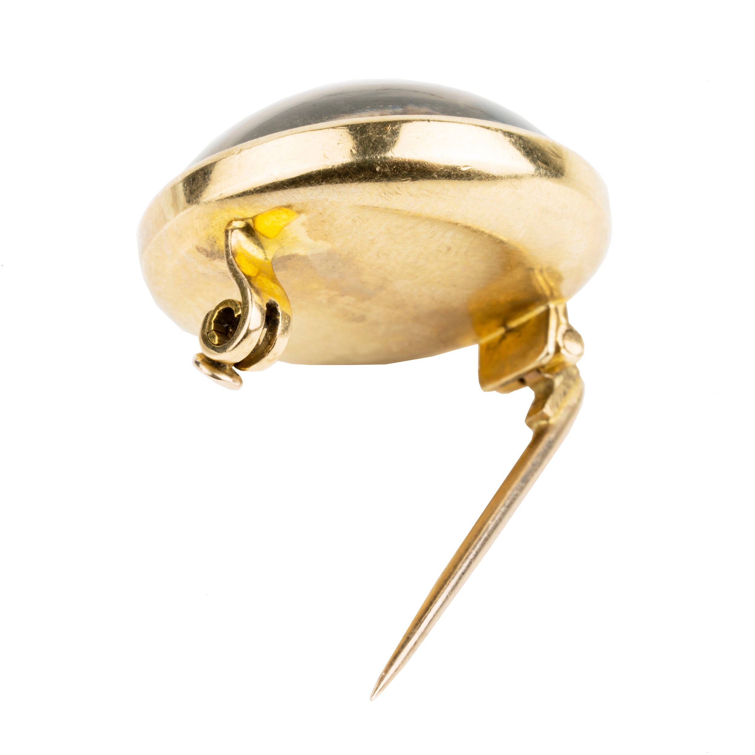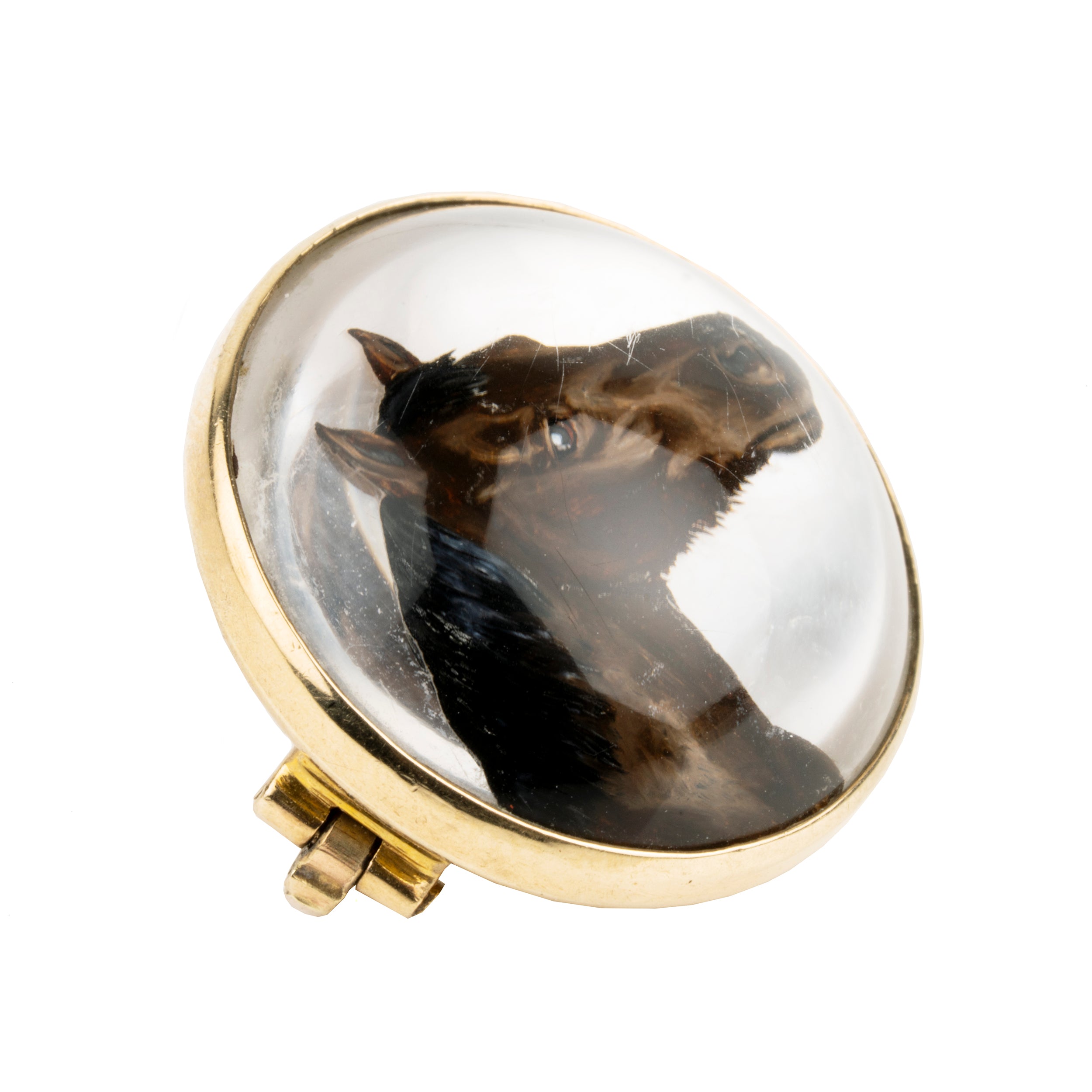 Essex crystal, sometimes referred to as a reverse intaglio, was popularized in the Victorian era and into the Edwardian era. The reverse intaglio was made from rock crystal cabochons that had been carved on the flat backside, where an image was carved in reverse and hand-painted. A tiny work of art.