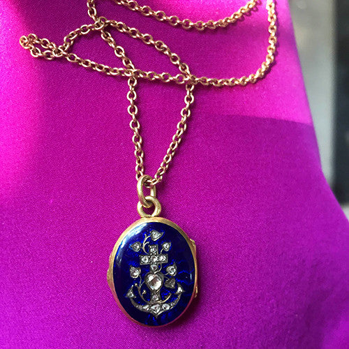 Napoleon III period locket in blue enamel and rose cut diamonds, 18k gold. " Faith Hope and Charity" Circa 1860, French in Origin. On an antique 18" English Rolo link chain in 9k Gold.