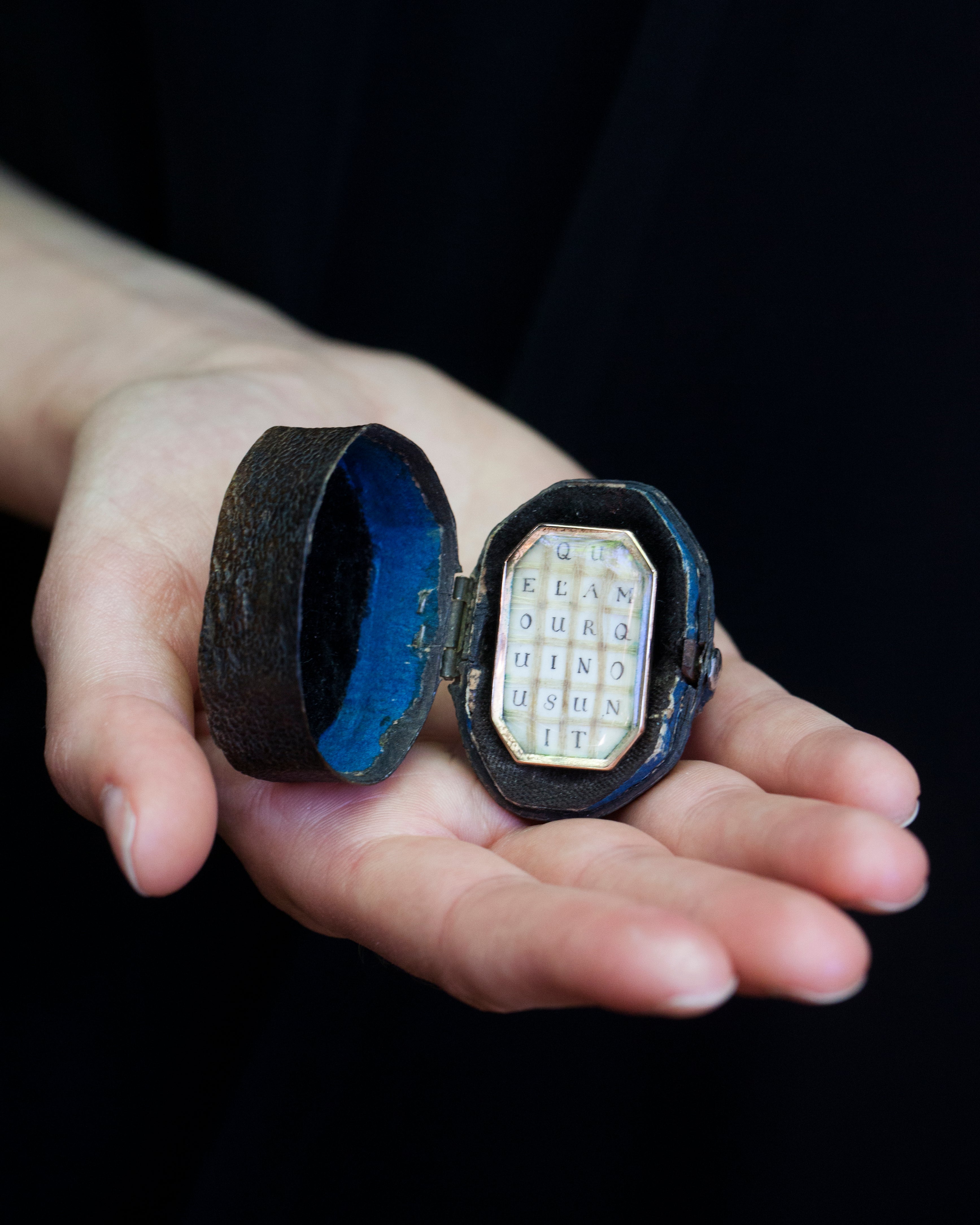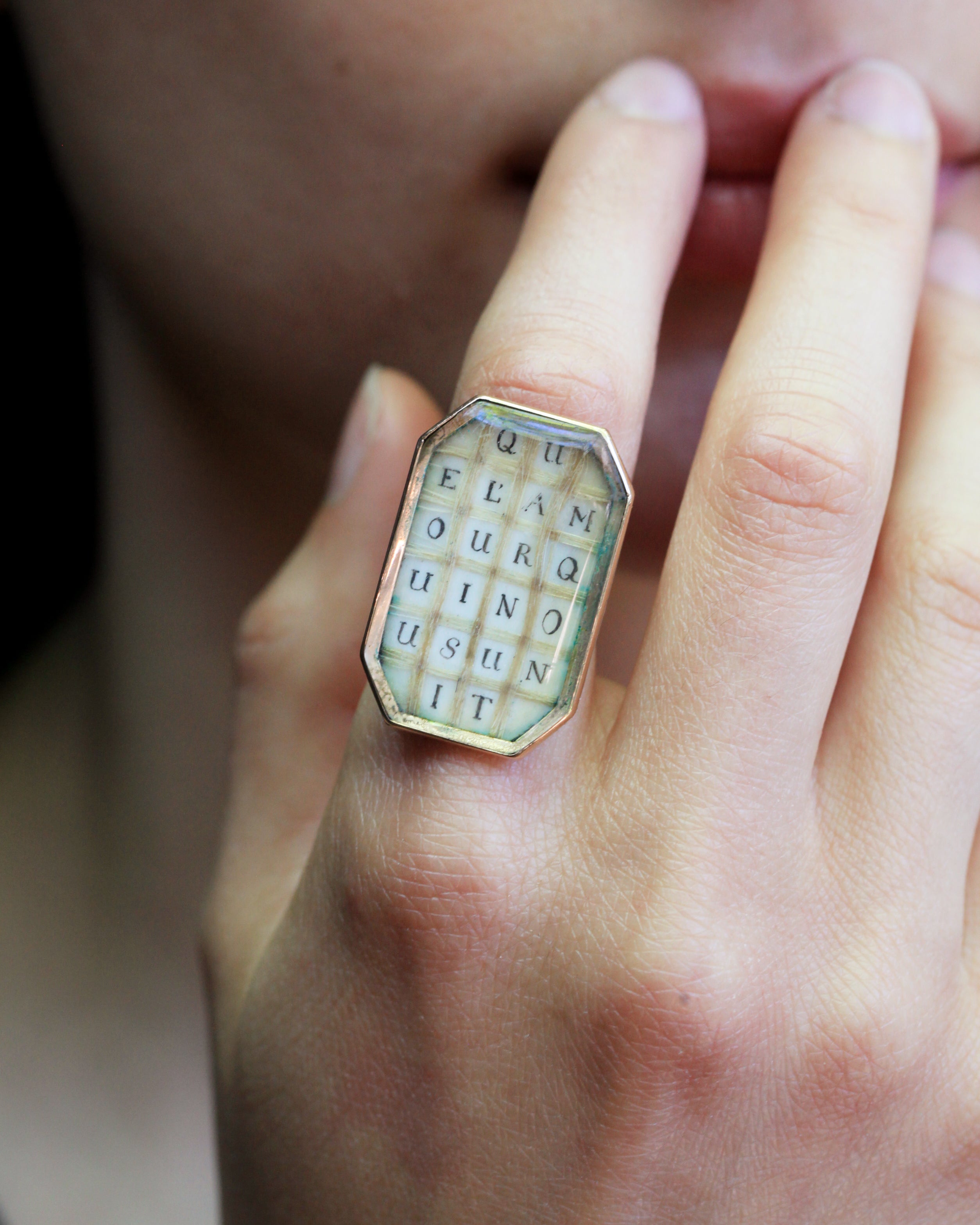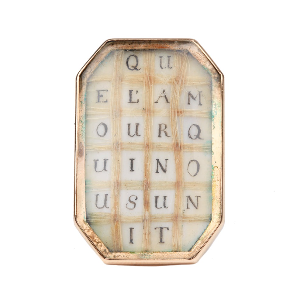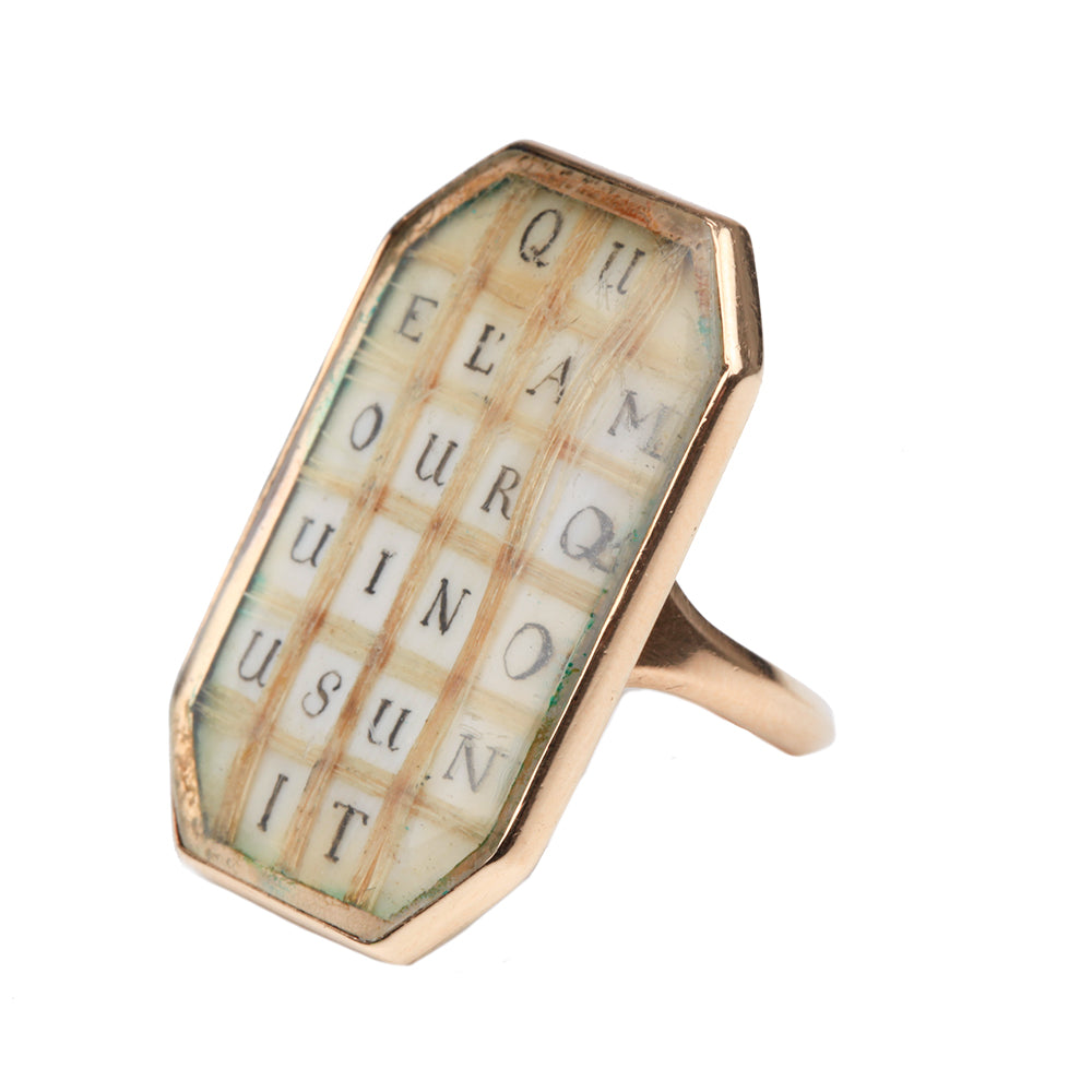 - French 18th Century hair ring, rose gold. Woven blonde hair and letters spelling "Que Lamour Qui Nous Unit" which is translated into "The love that unites us" . French in origin. Circa 1780. Comes in original fitted ring box.