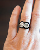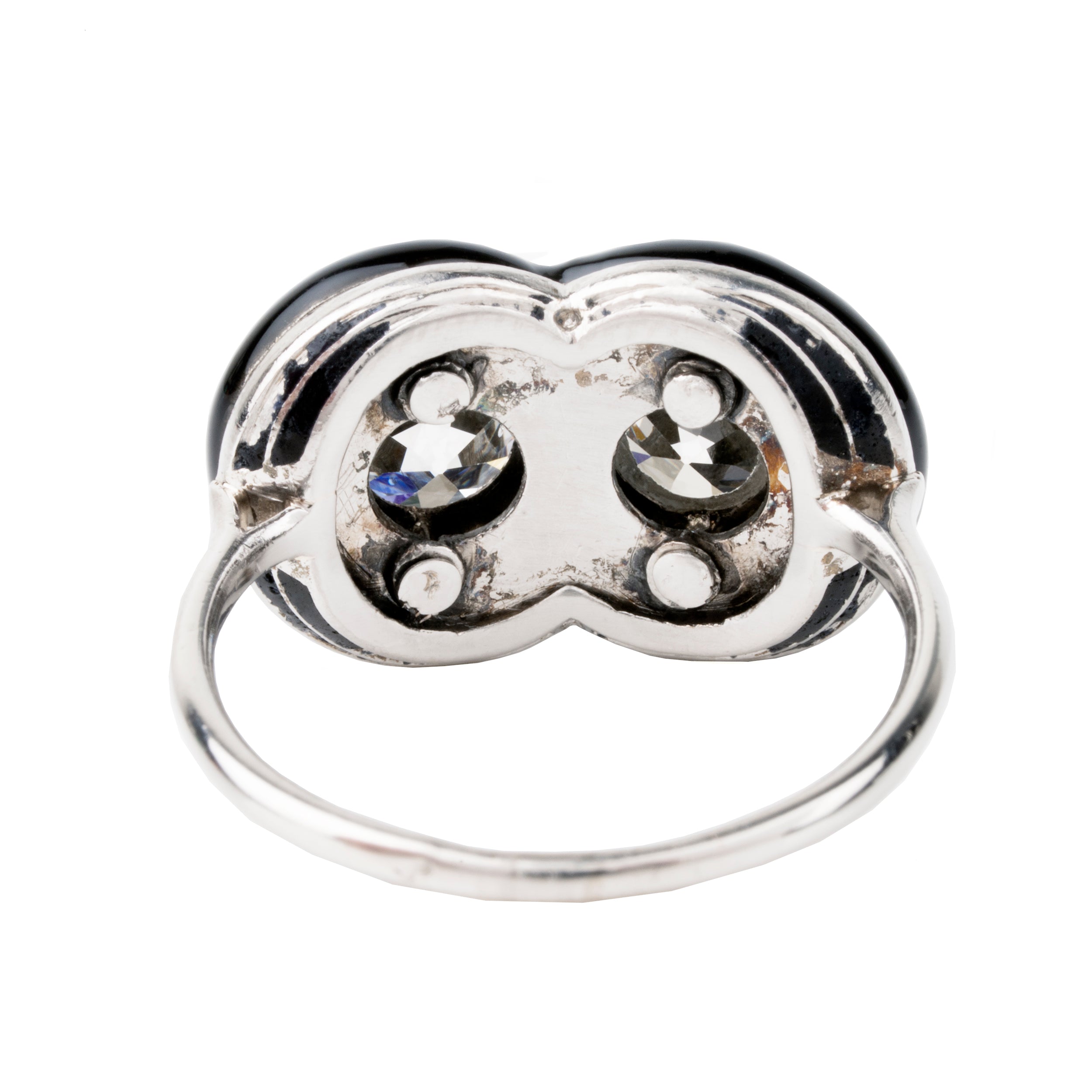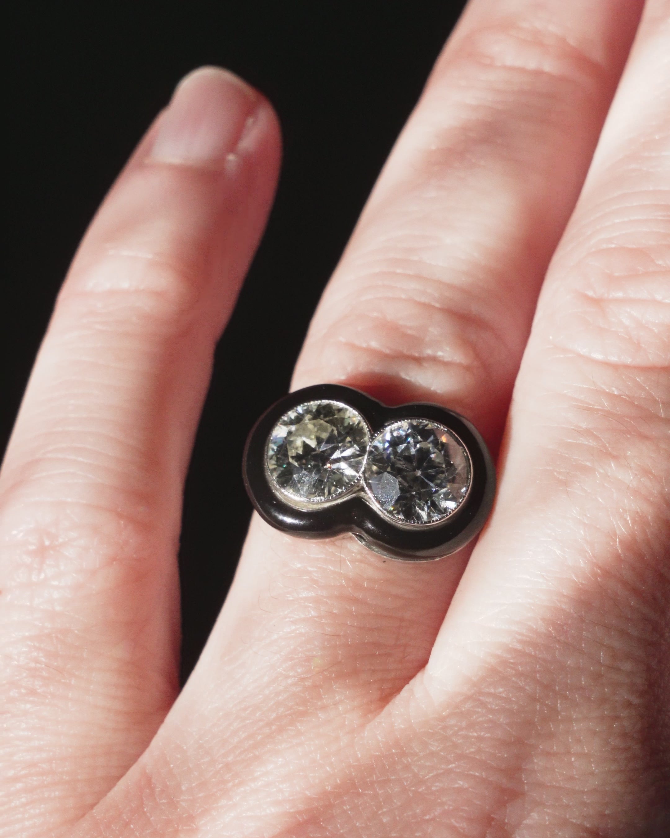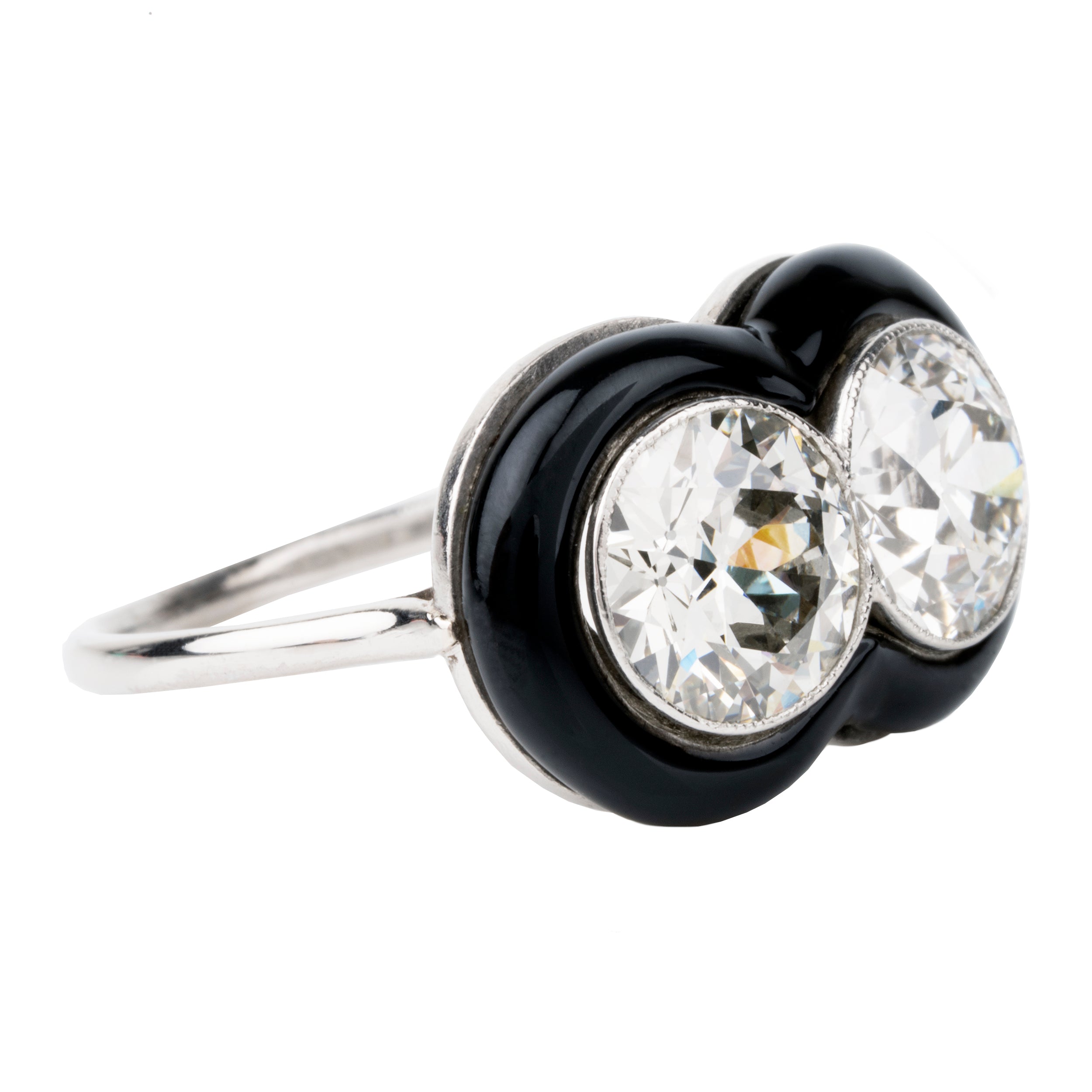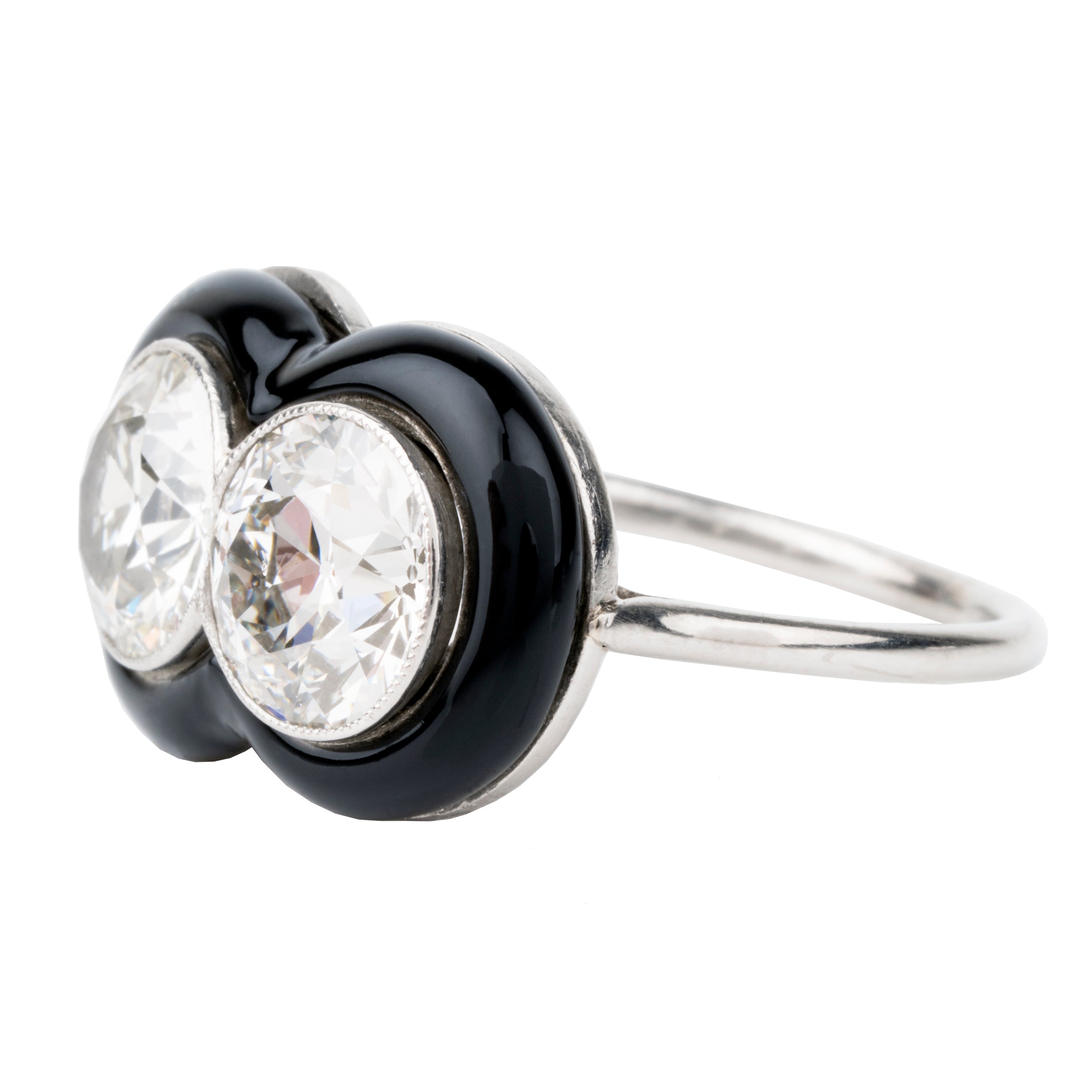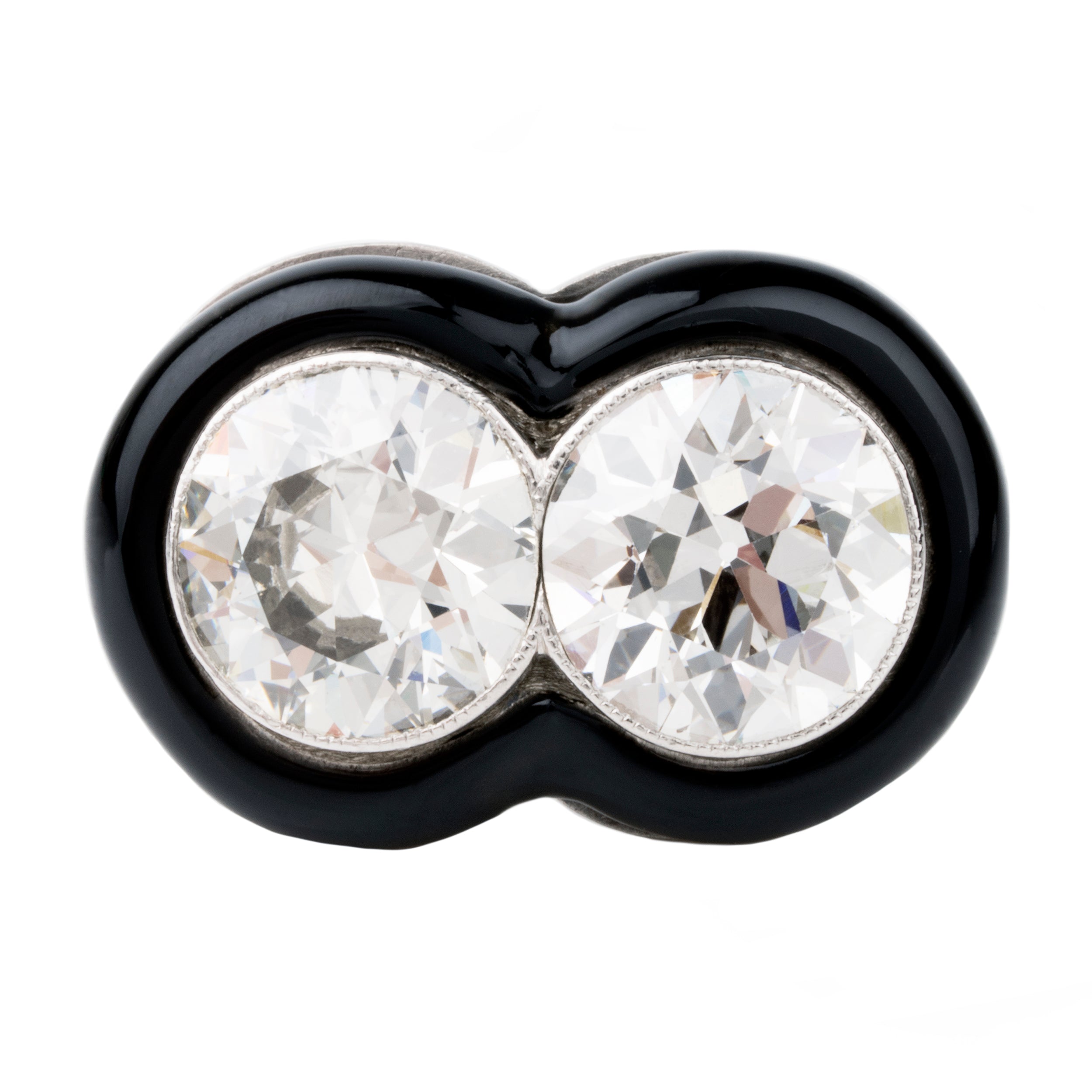 Striking early 20th Century twin stone ring. Two old European cut diamonds are bezel set in platinum surrounded by black enamel. with a simple round band. The diamonds are pproximately 2.80 carats in total diamond weight, with an estimated quality of H-I color and VS in clarity. French in origin. Circa 1925.