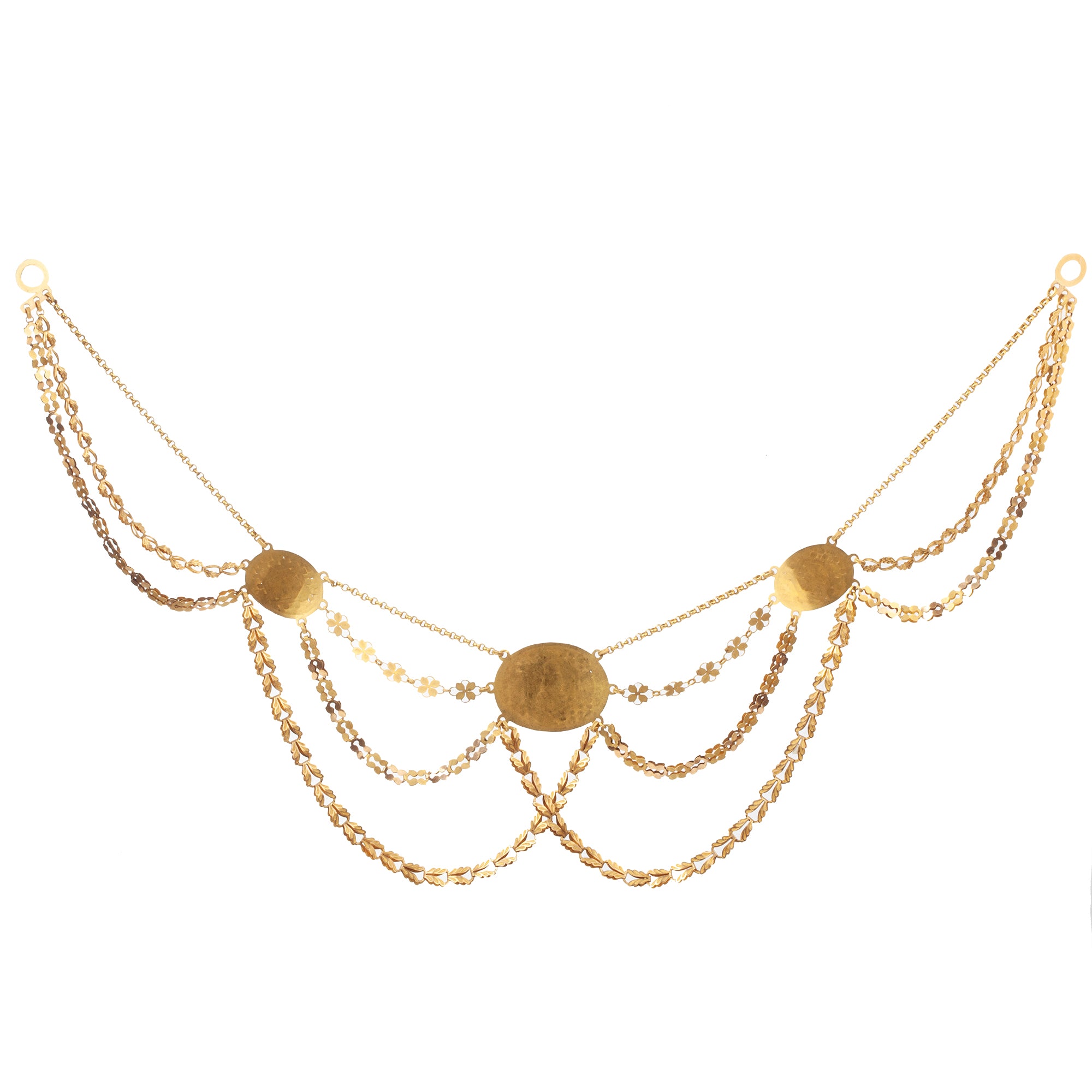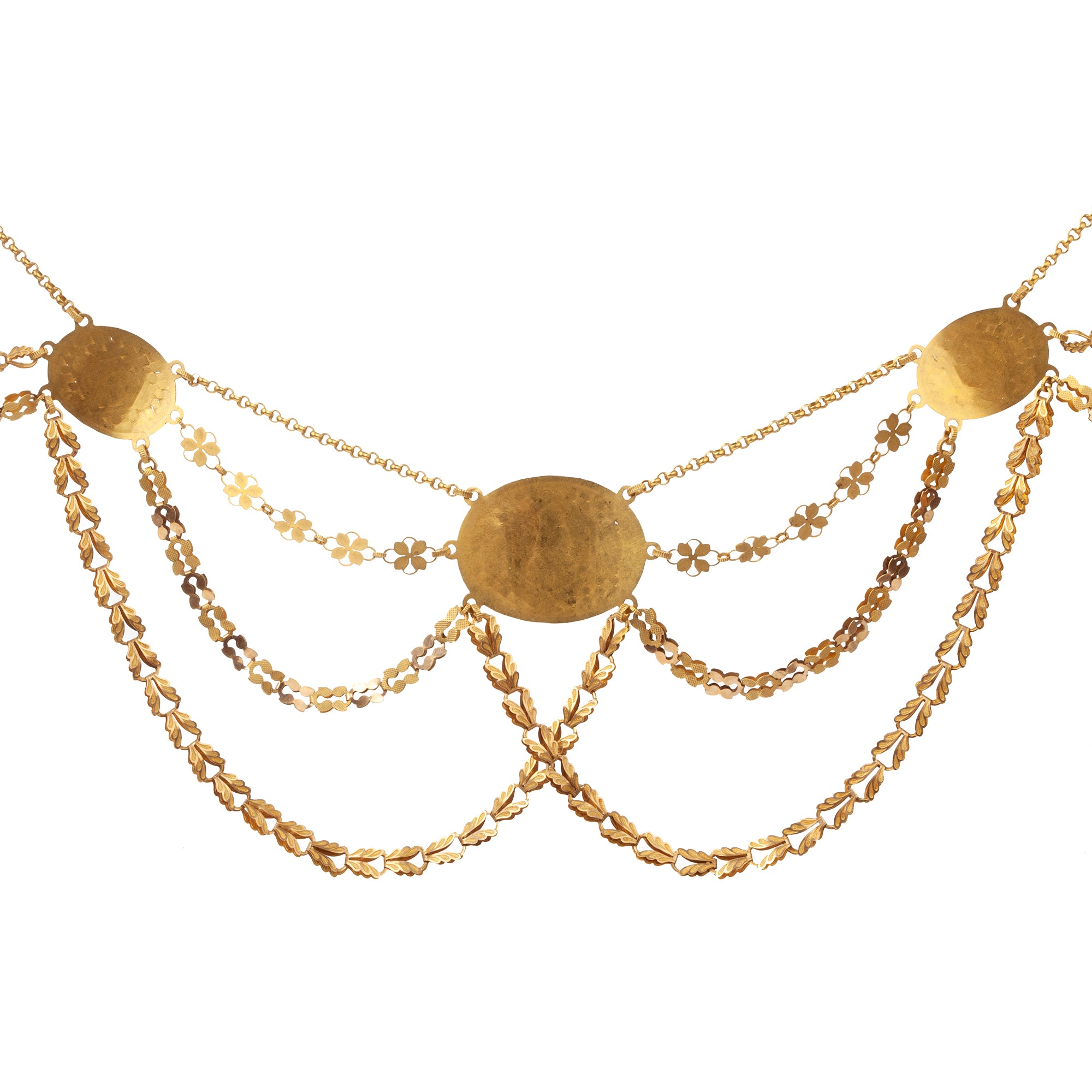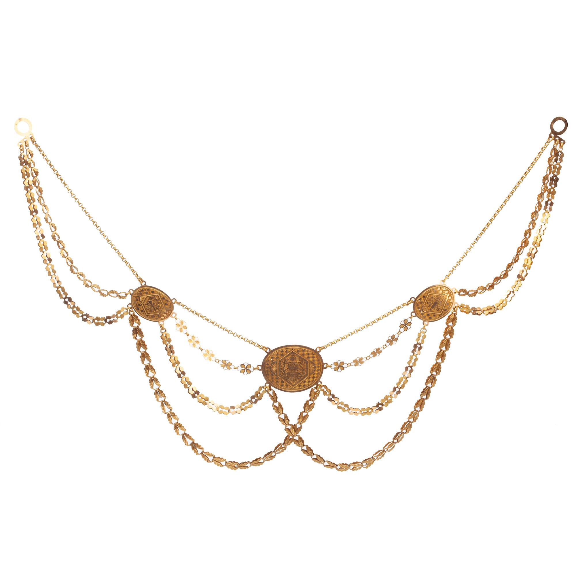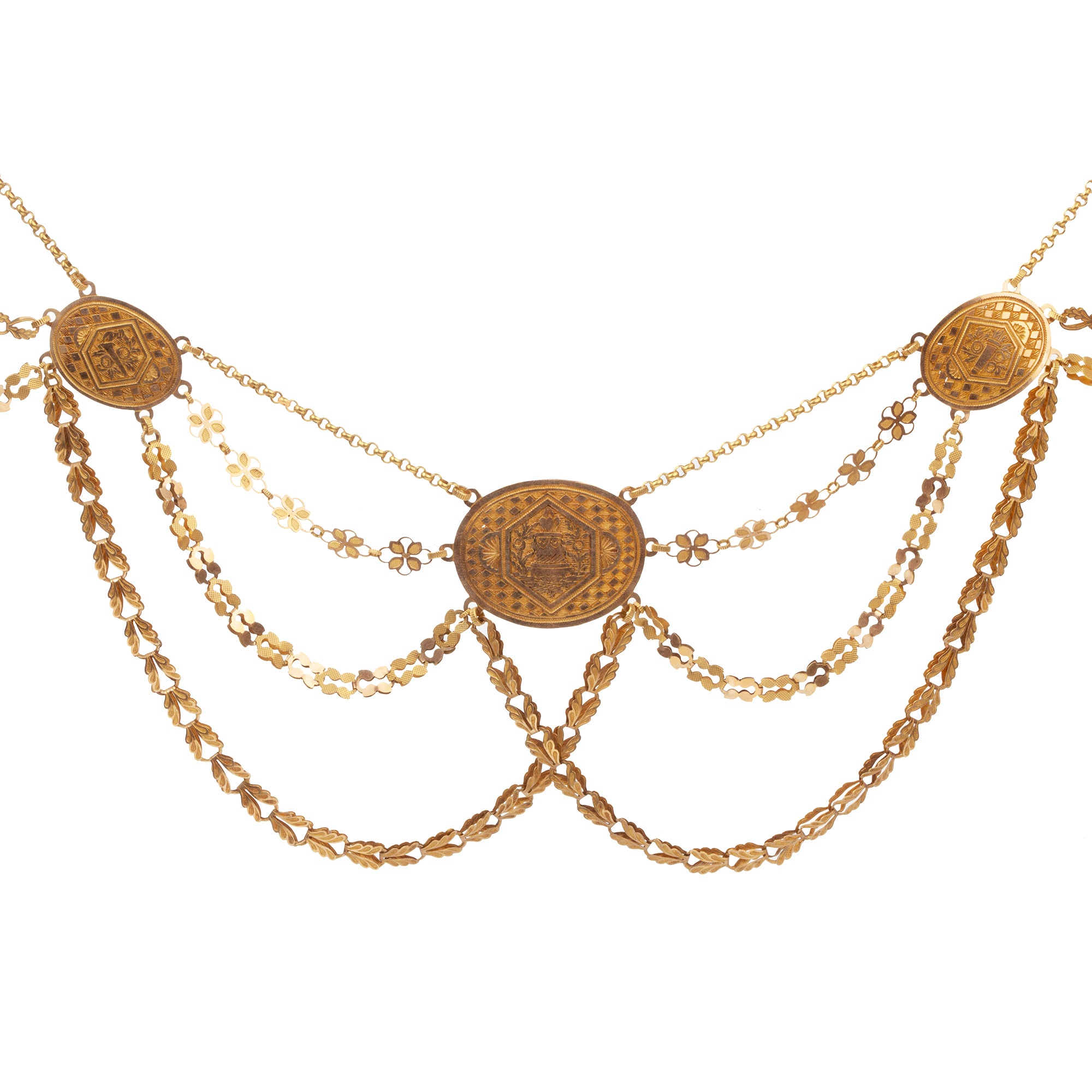 Early 19th Century swag collar necklace. Quintessential Empire design dating to the Napoleon era. Original ribbon fittings. Hallmarks indicate early 19th century French origin. Circa 1810.