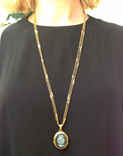 Unusual Carved hard stone 'Man in the Moon' cameo locket. Mid 19th Century French hallmarks in 18k gold. Locket is hanging on a long Victorian era gilded chain. Worn doubled full length measures 58 inches.