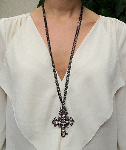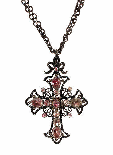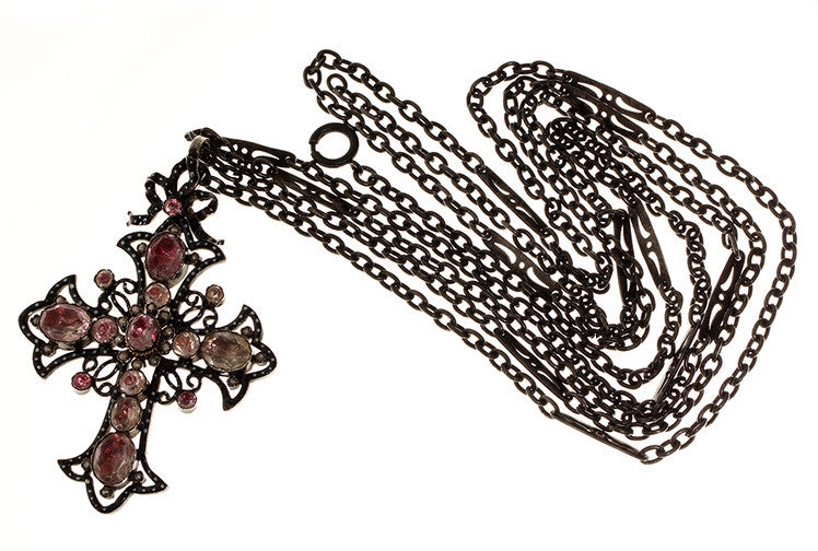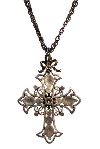 Striking Georgian era paste cross circa 1750/80. Black and white enamel dot detail around the edges of the piece looks like an actual ribbon. It is beautiful. Most likely French in origin. To learn more about Georgian paste jewels see our Field Guide.