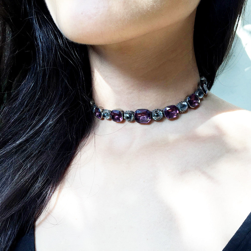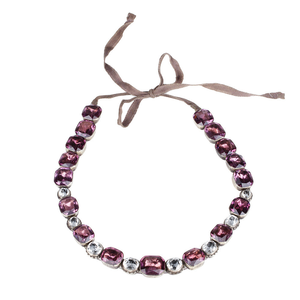 Georgian amethyst and white paste rivière necklace. Silver foiled back settings strung on silk ribbon. English in origin. Circa 1800.