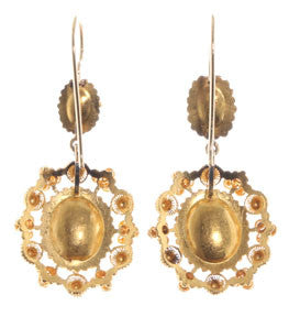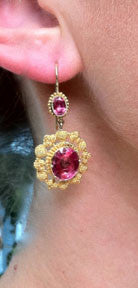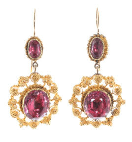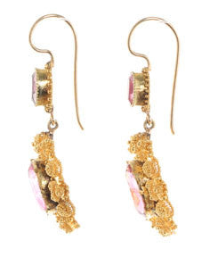 Fine cannetille earrings circa 1820/30 in 18k gold and quartz crystal stones with bright flashing pink foil.