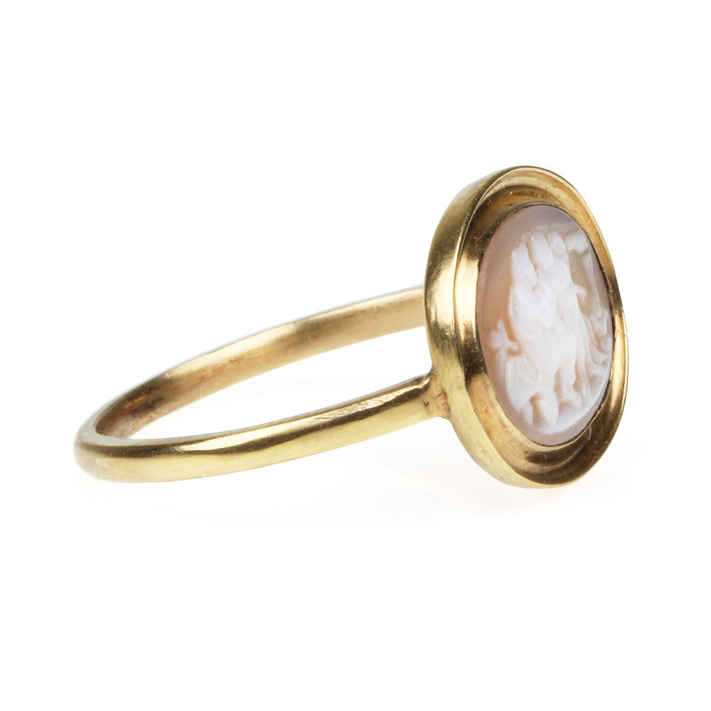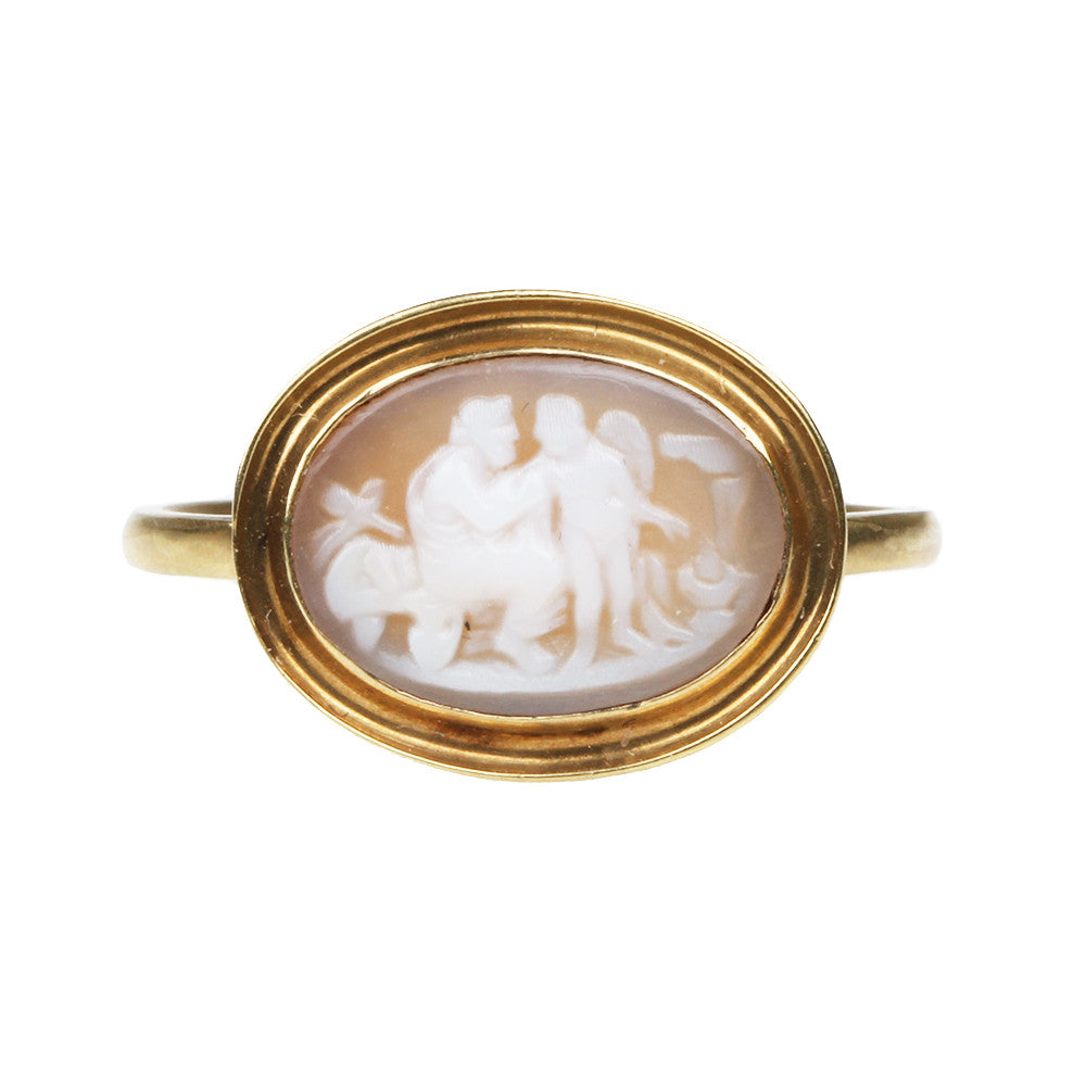 Georgian carved shell cameo ring in 18k gold, circa 1830. The ring depicts a classical scene of mythological characters.