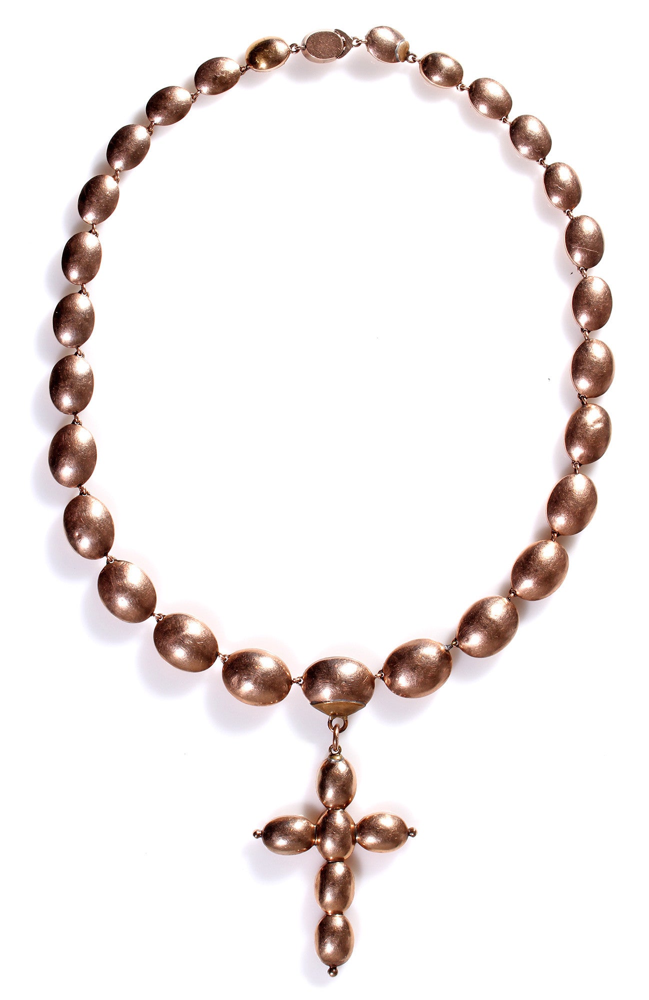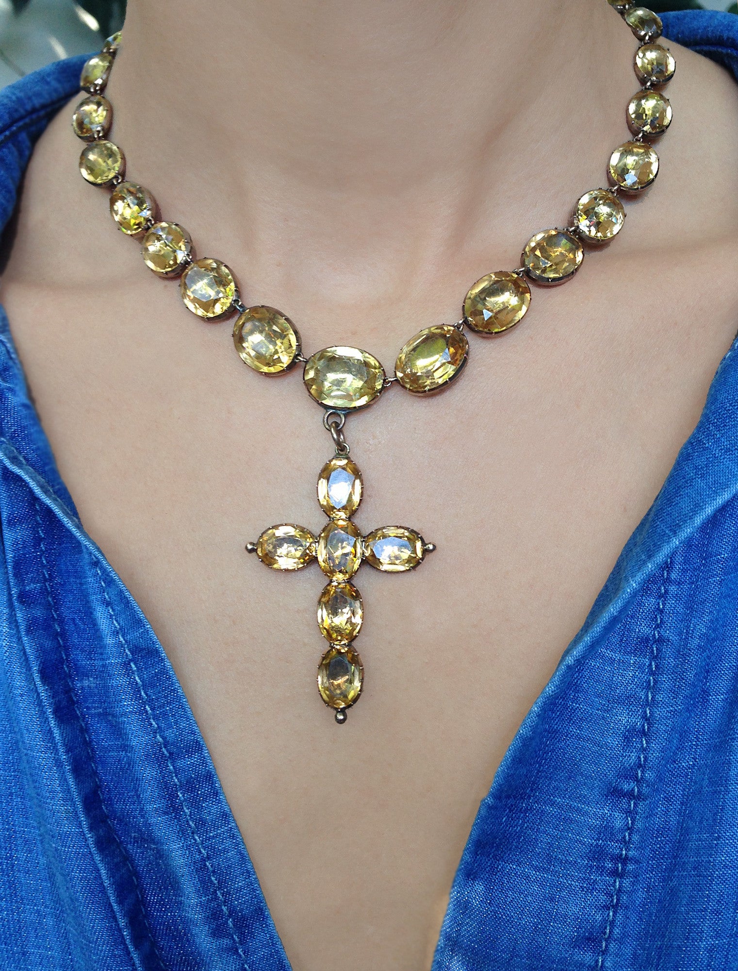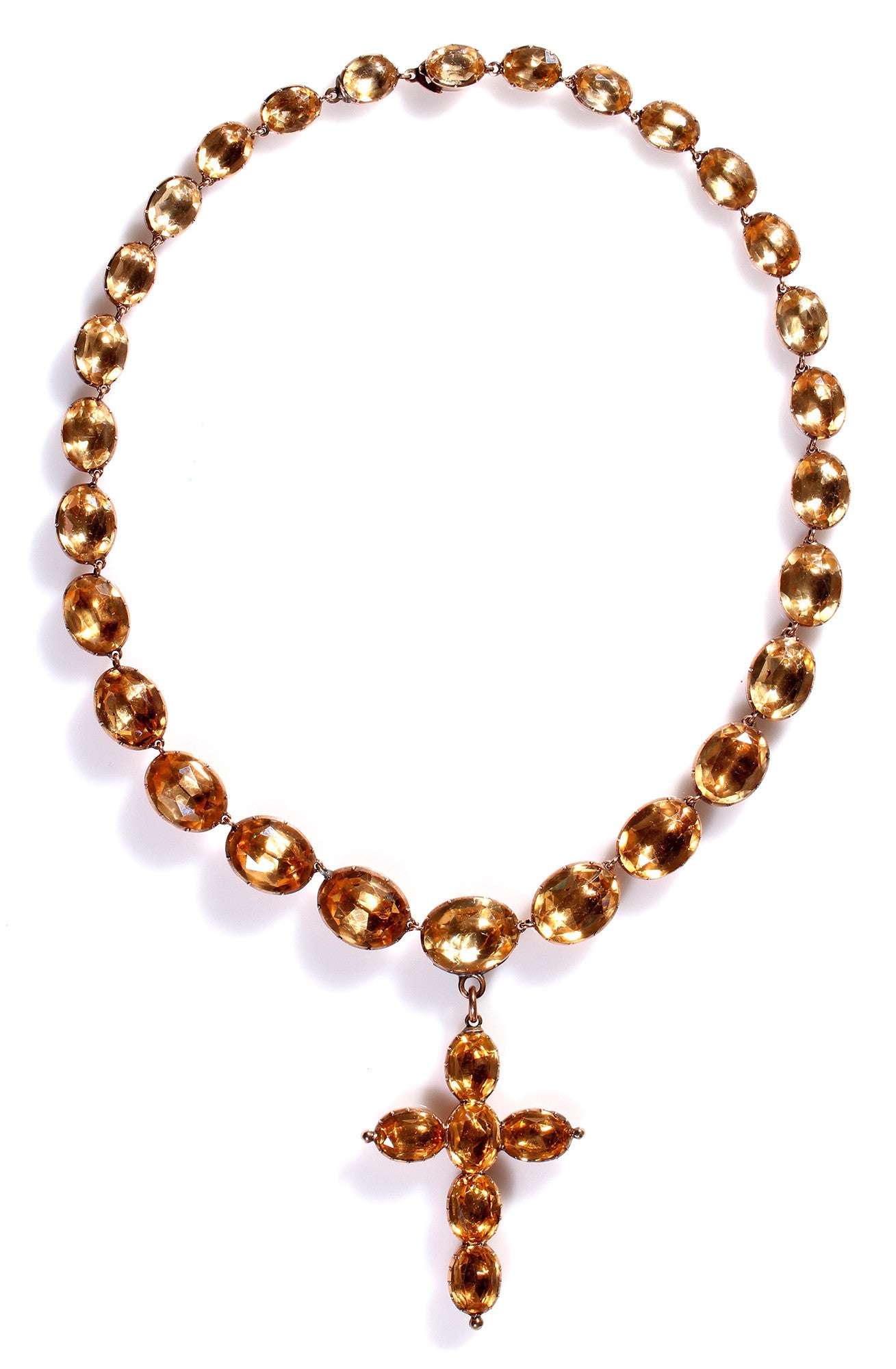 Rare 18th Century Georgian paste necklace with soft topaz colored foiled paste stones set in close set collets. Wearable length with original clasp. Found with original cross pendant. Pendant could be removed and a hook added to be more easily convertible. Scarce and beautiful. Very good antique condition. The pendant hoop shows a reinforcement from antiquity. Necklace measures 16". Cross measures 2" long x 1.5" wide.