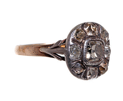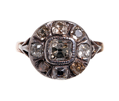 Old Mine Cut cluster ring with silver mount and 18k gold shank. Set in a period appropriate closed foiled back setting.