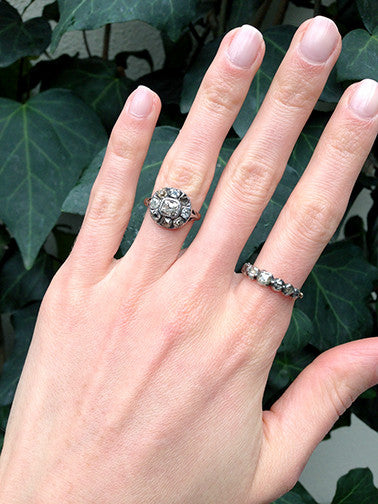 Size 6 can be sized. Shown on model with our Old Cut Diamond Band sold in-store only. Please call shop to inquire.
