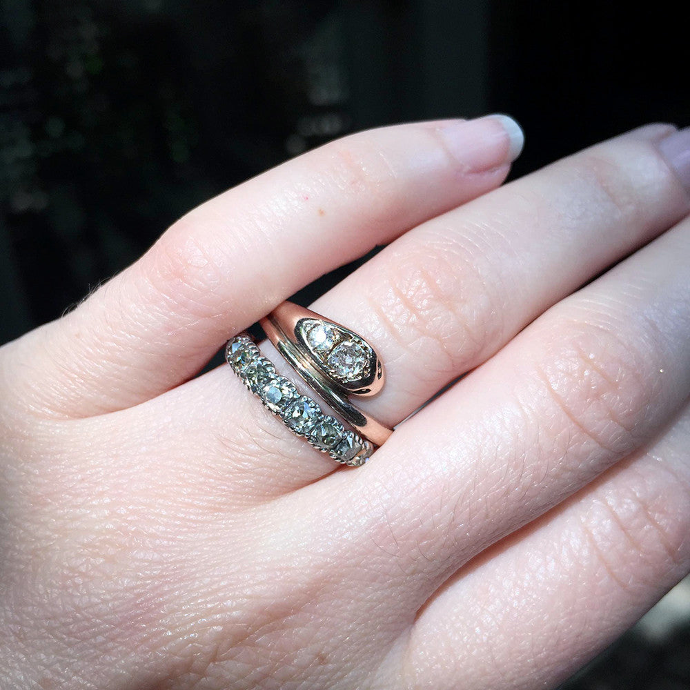 Georgian era old mine cut diamond half-hoop band. Diamonds set in silver domed closed back setting on a gold shank. English in origin, Circa 1810.