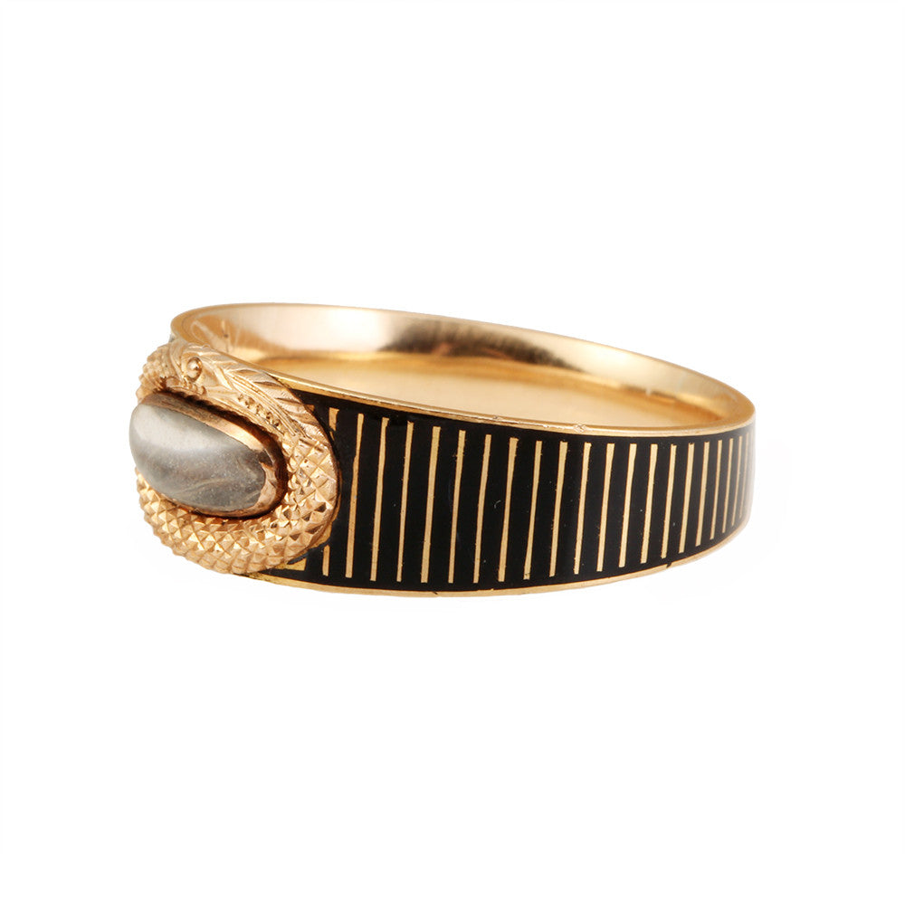 Georgian enamel mourning ring with stripe detail and orobouros snake with hair behind the crystal, Circa 1820. English in Origin.
