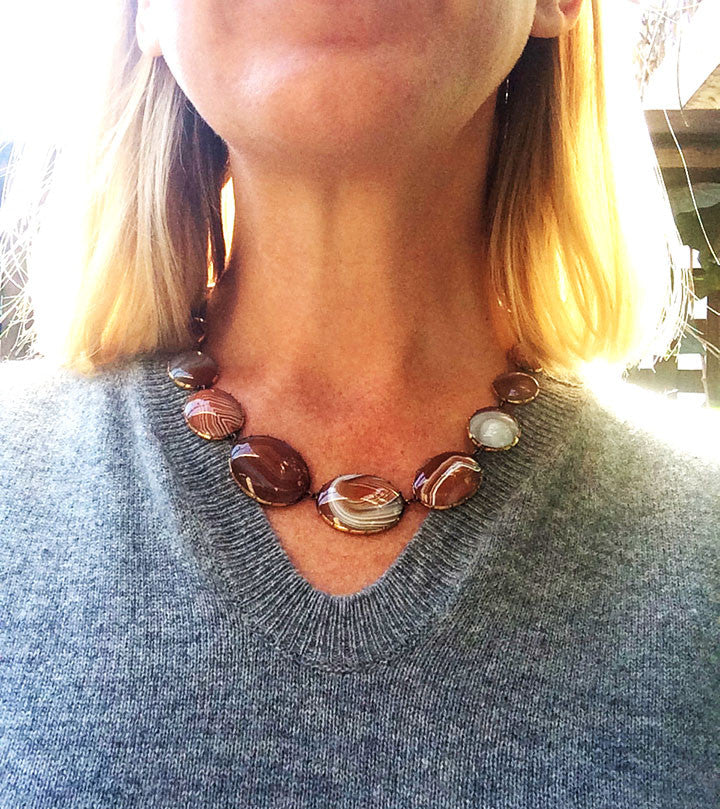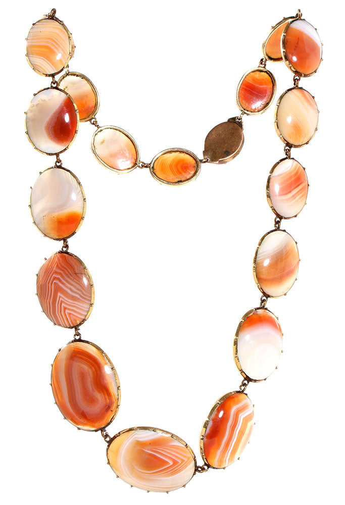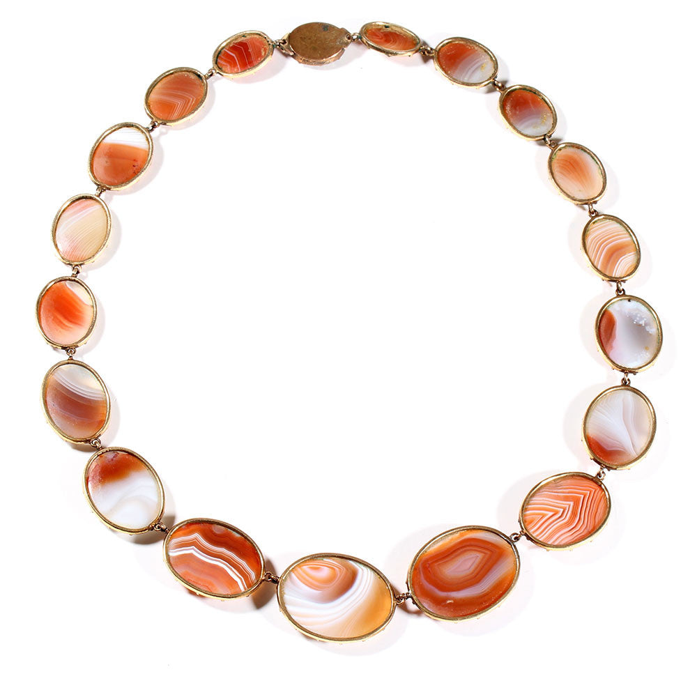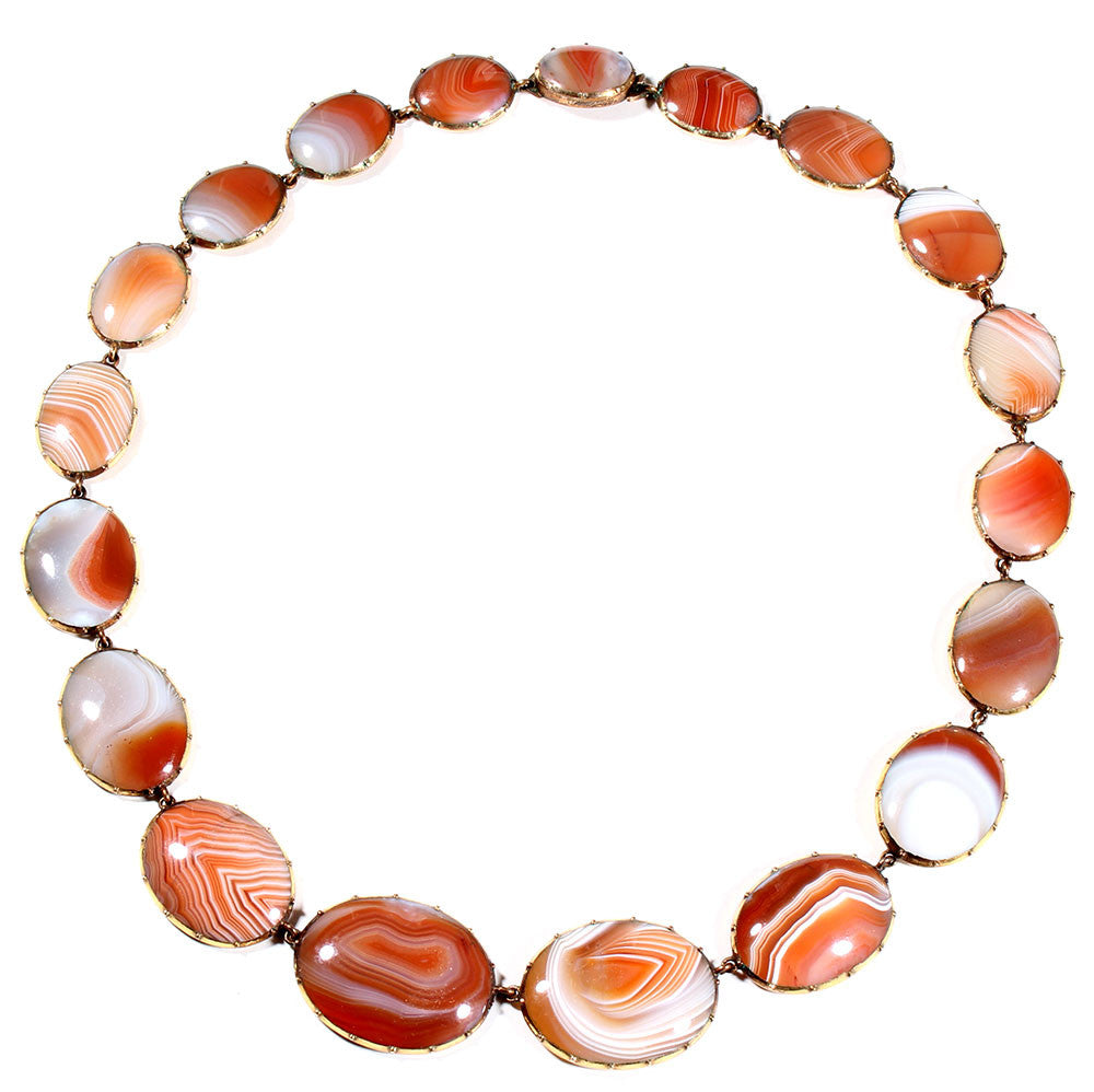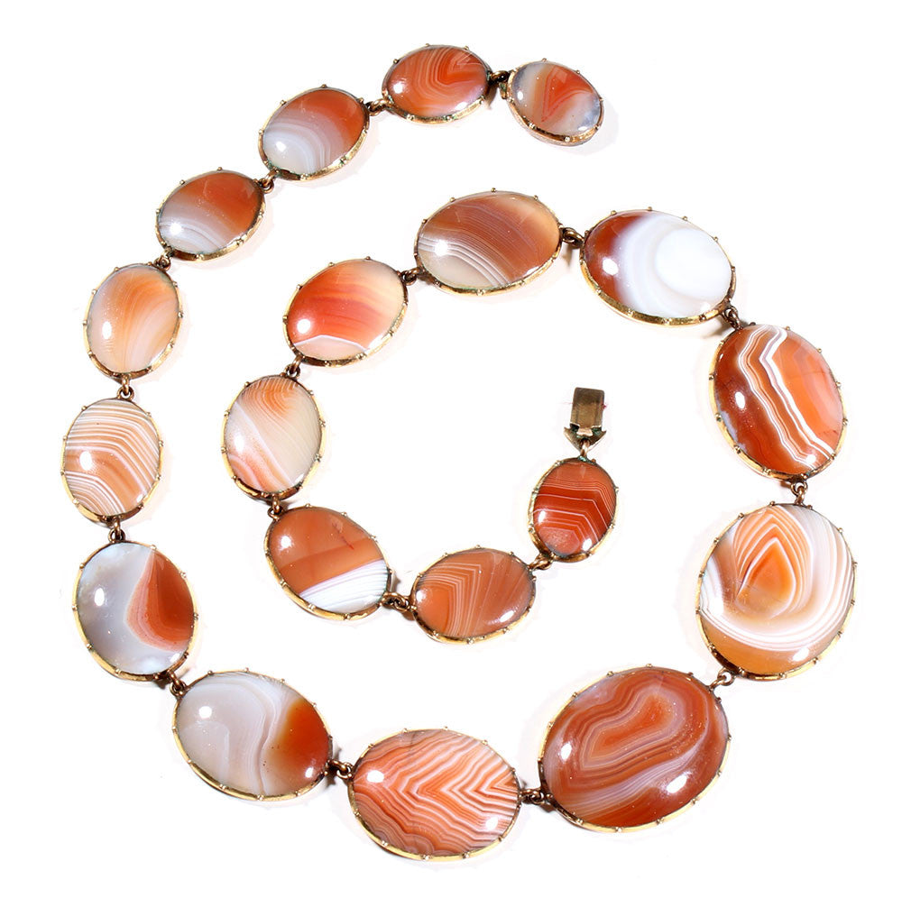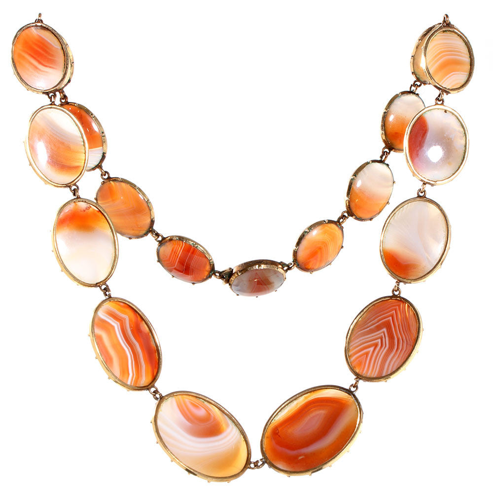 Early 19th Century agate necklace set in gilt metal. English in origin, this necklace dates to 1800-1830. The nicely matched and graduated agate stones are set in cut down collet settings. Each stone is sliced thin allowing light to pass through the beautifully banded natural agate patterns. A very nice long length for a necklace from this period.