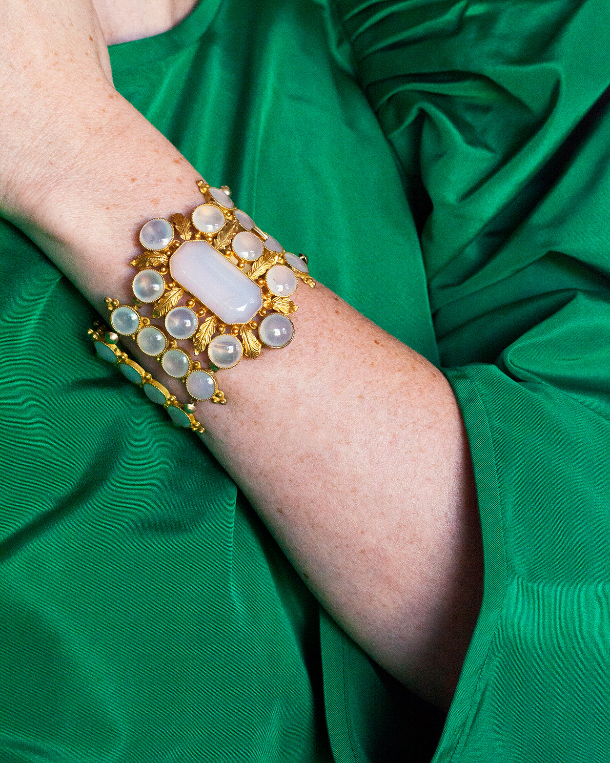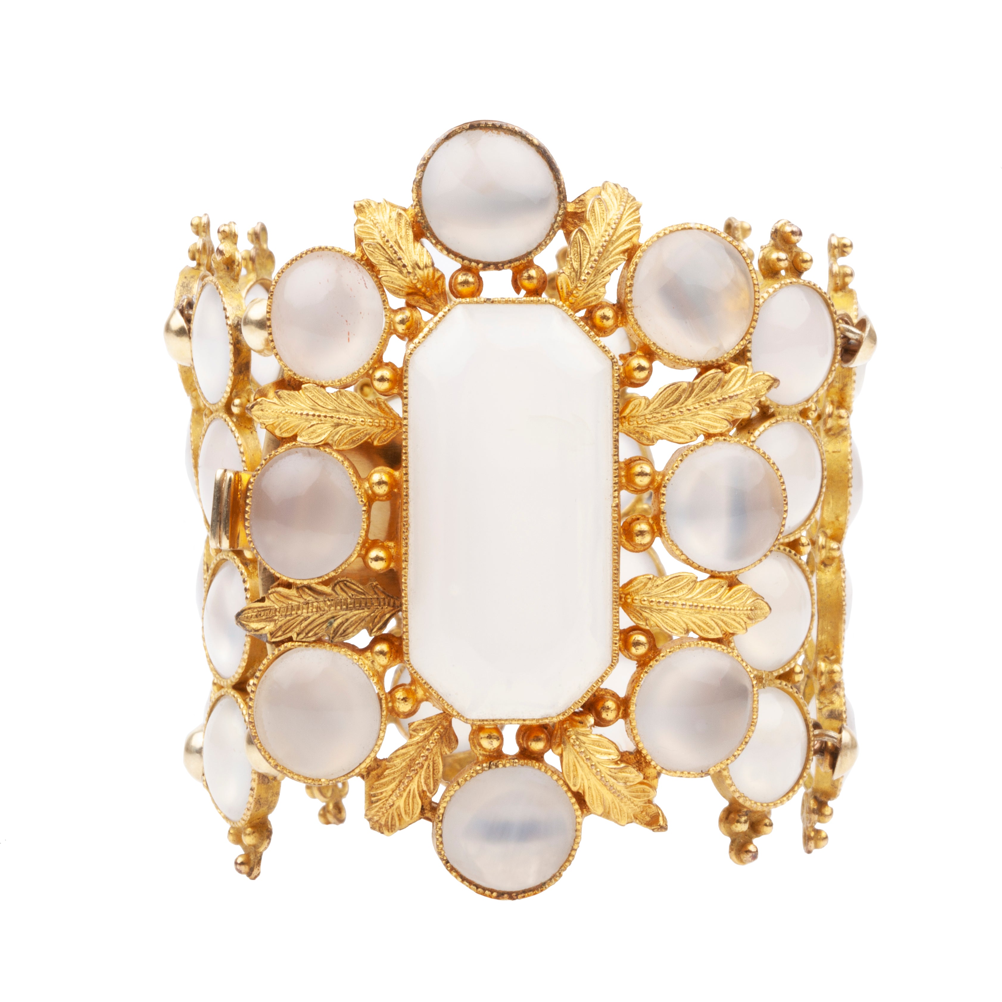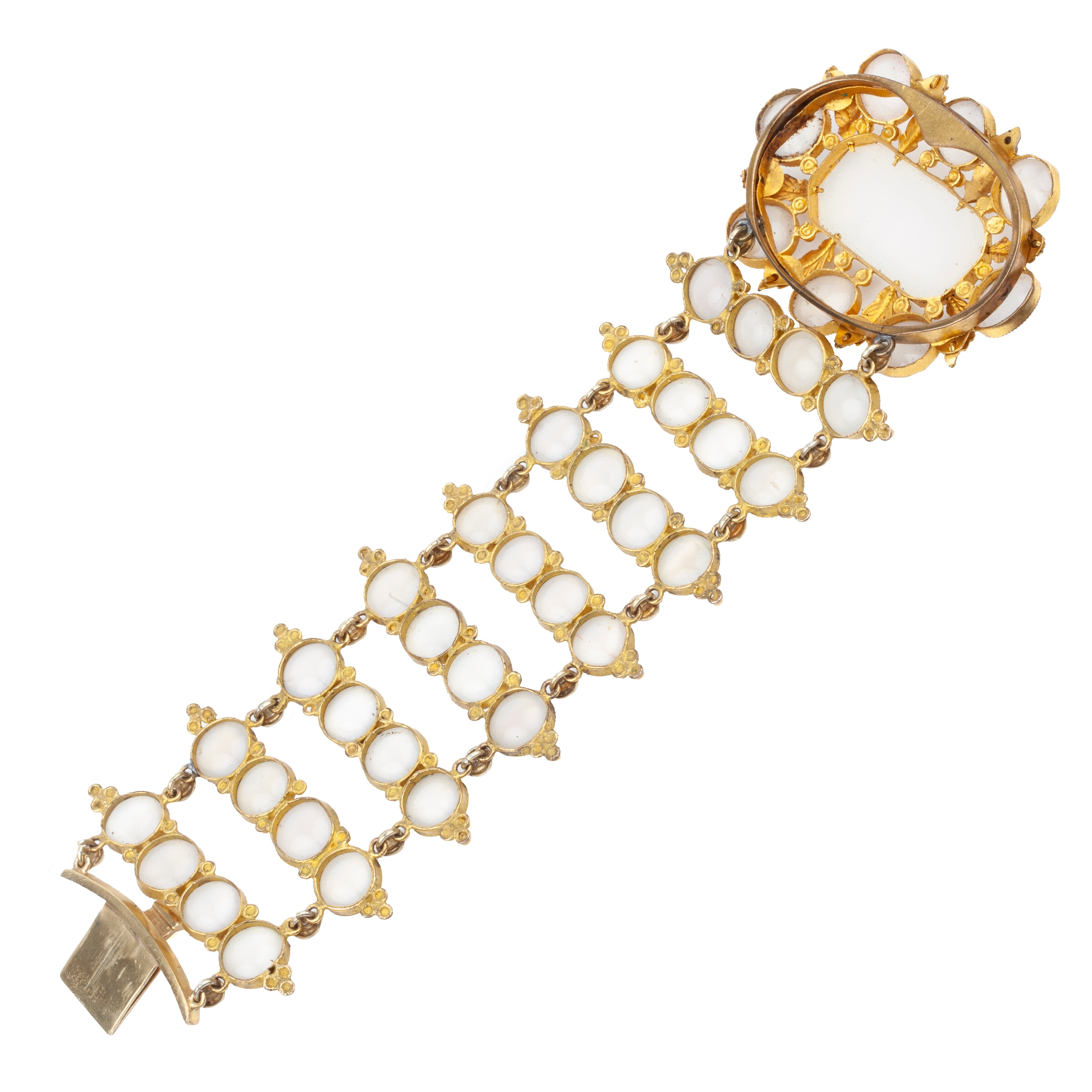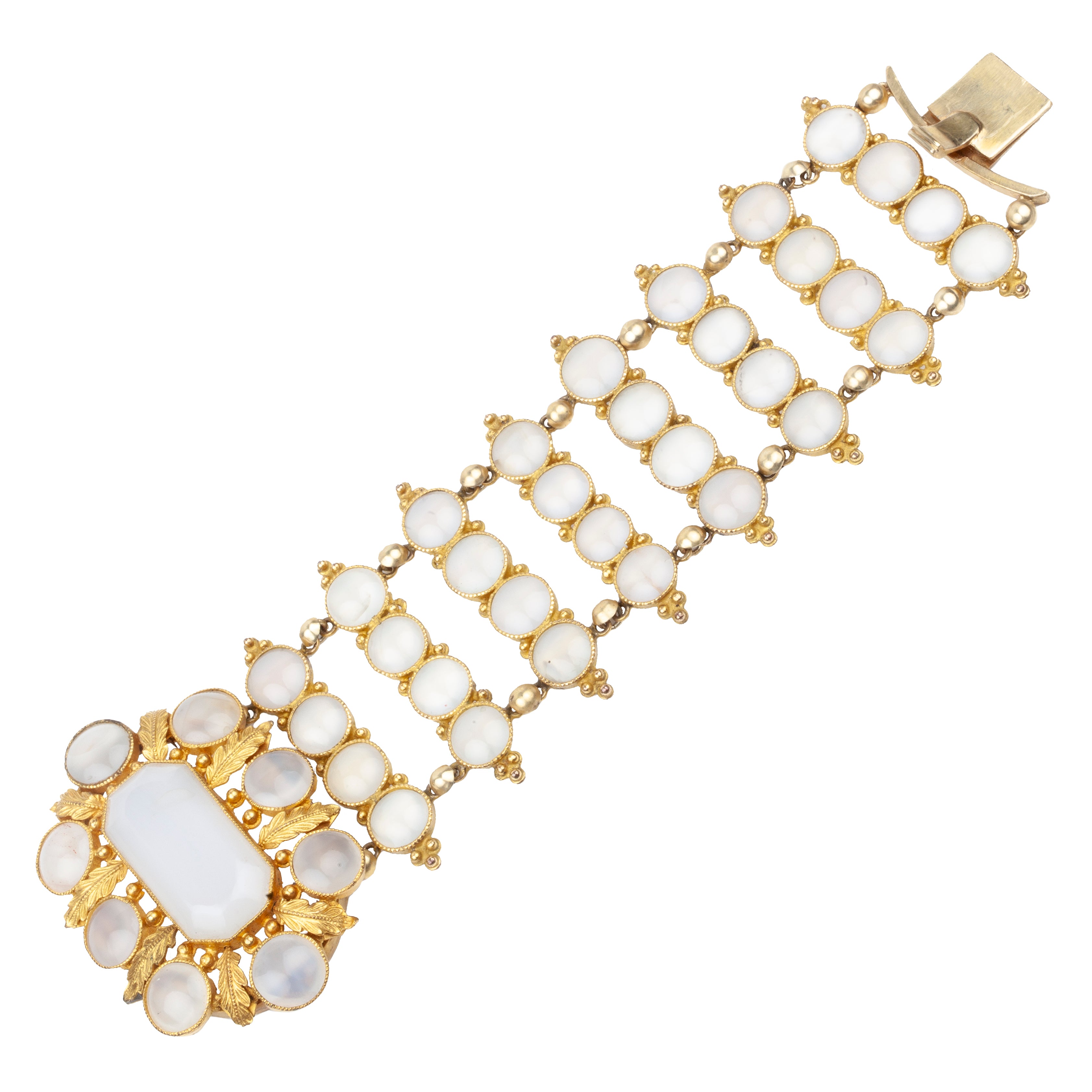 Early 19th century gemstone bracelet with chalcedony cabochons set ornate in a gilt metal setting. English in Origin. Circa 1830.