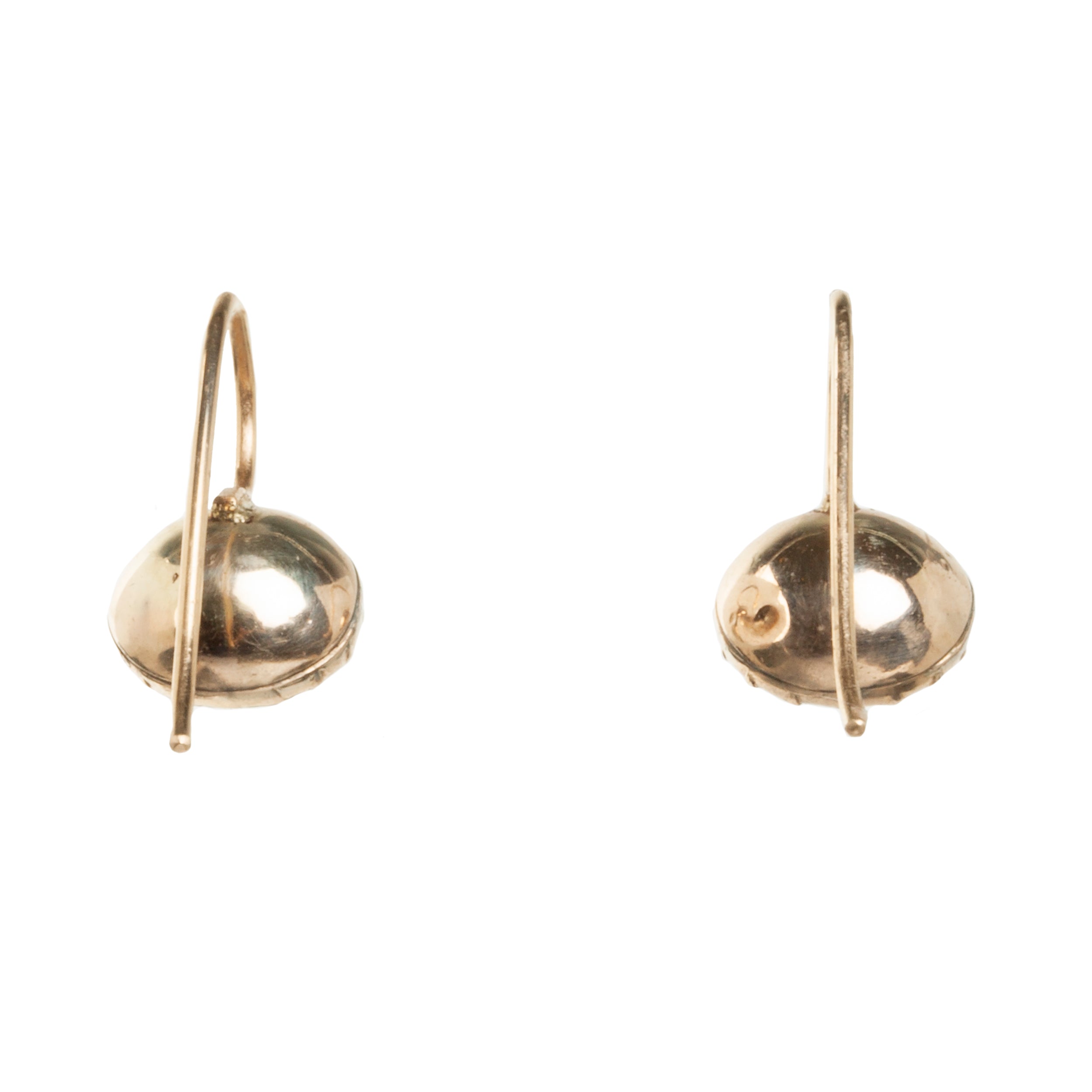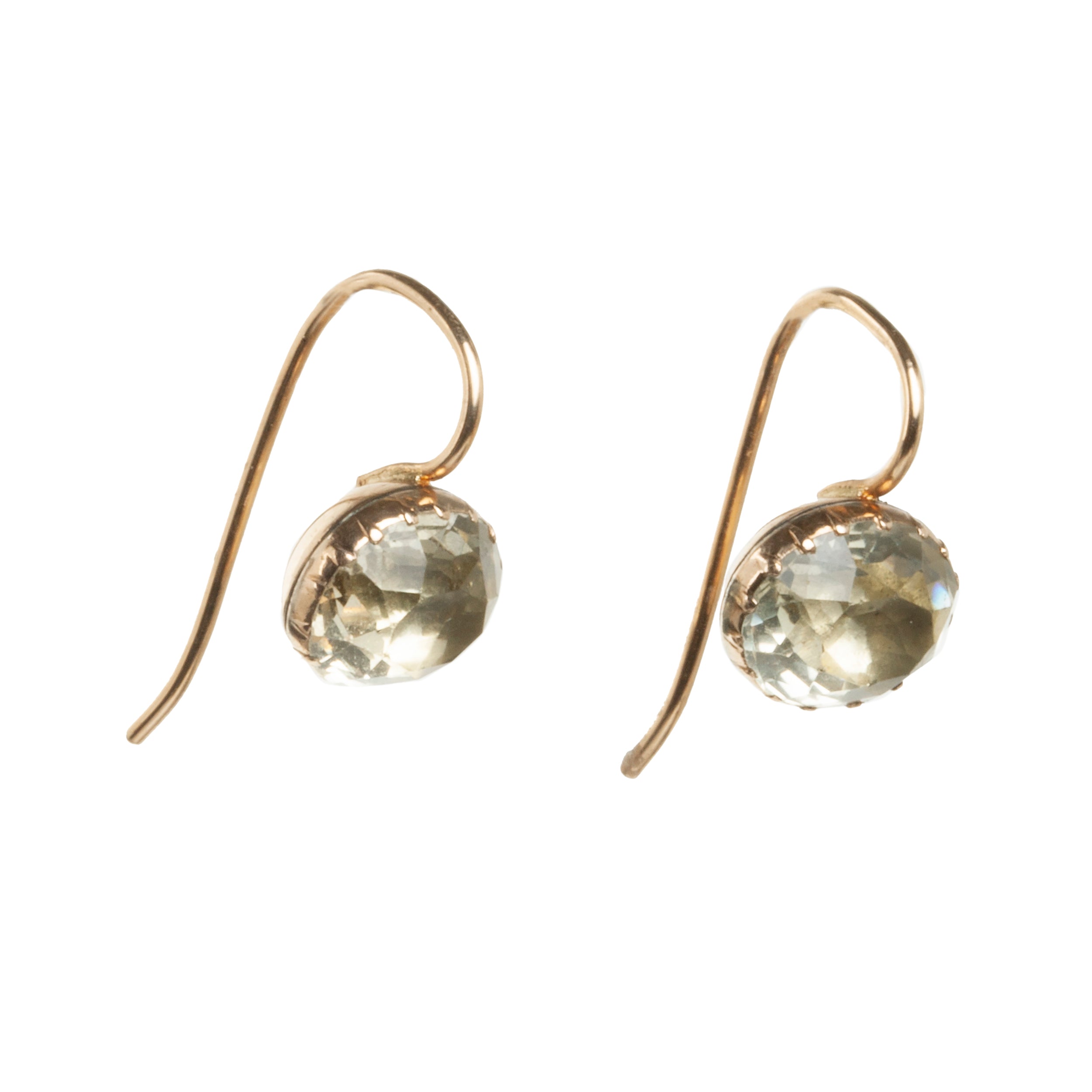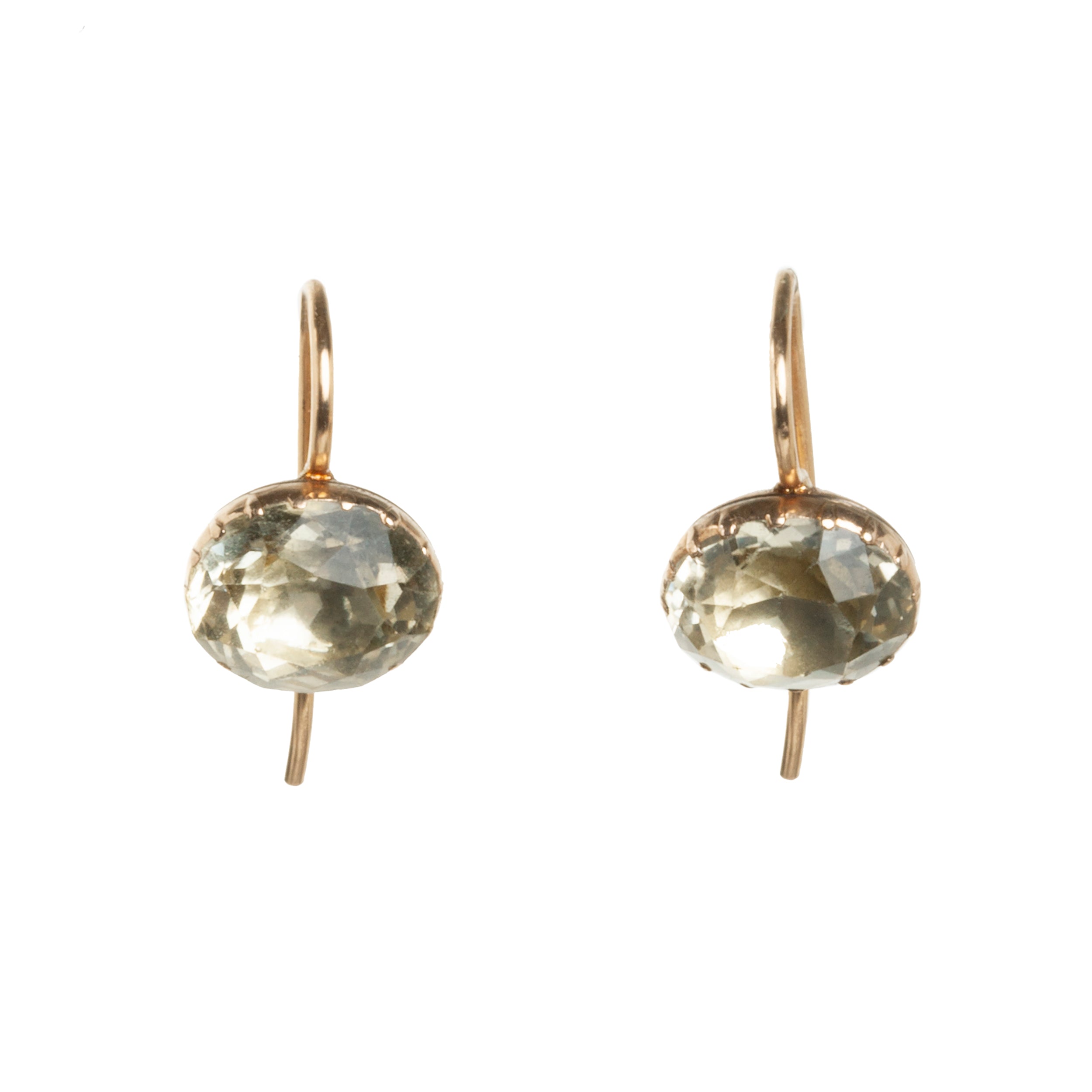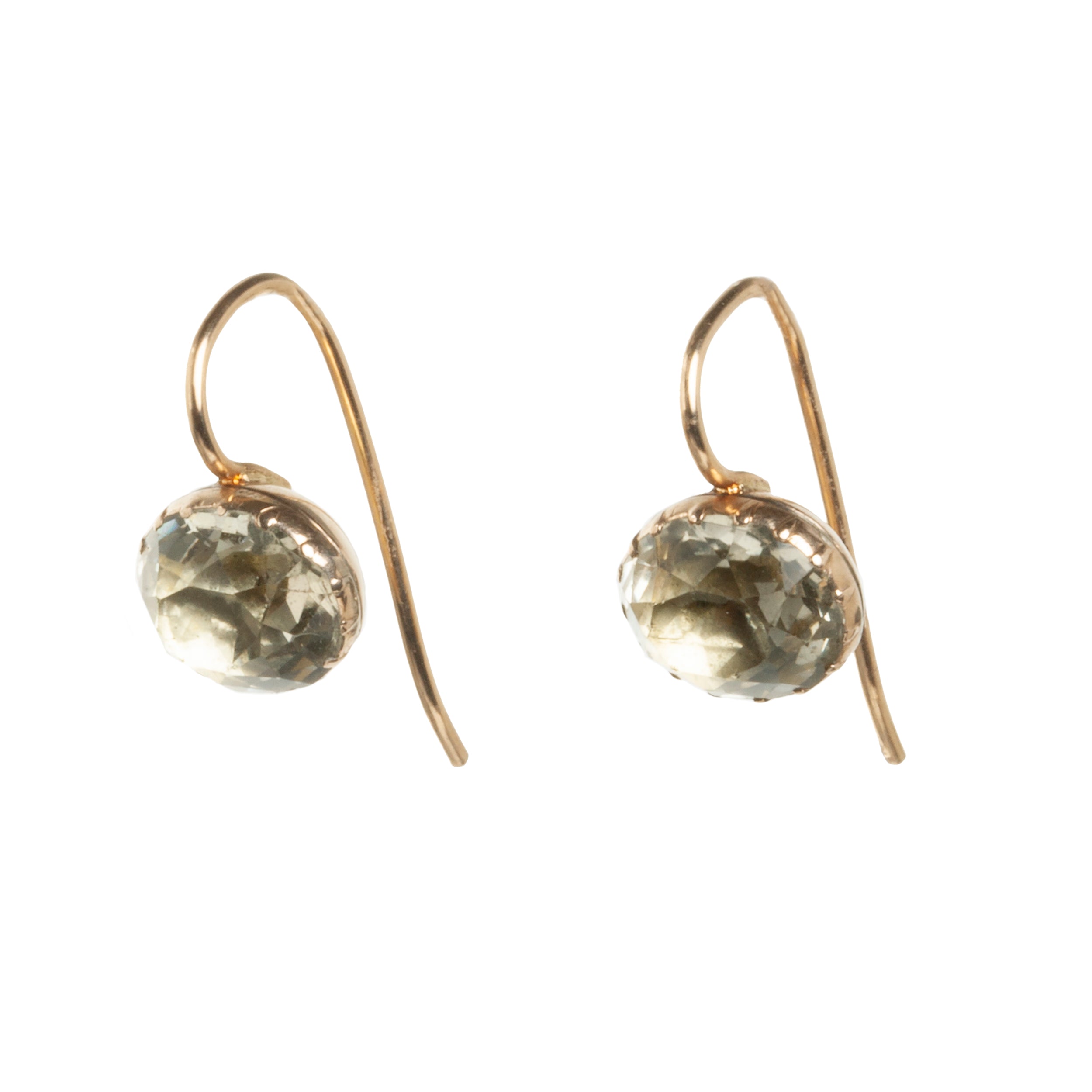 Georgian era oval shaped chrysoberyl earrings, in 18k gold. What were once beautiful Georgian era buttons or cufflinks are now perfect everyday earrings. English in origin. Circa 1820.
