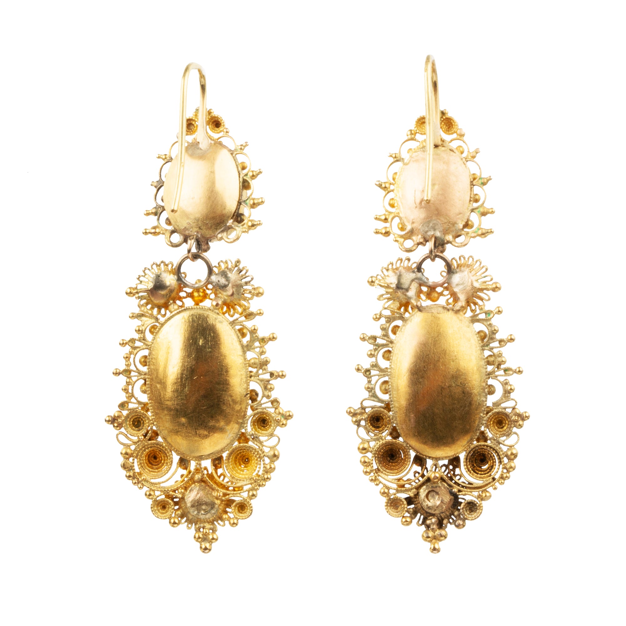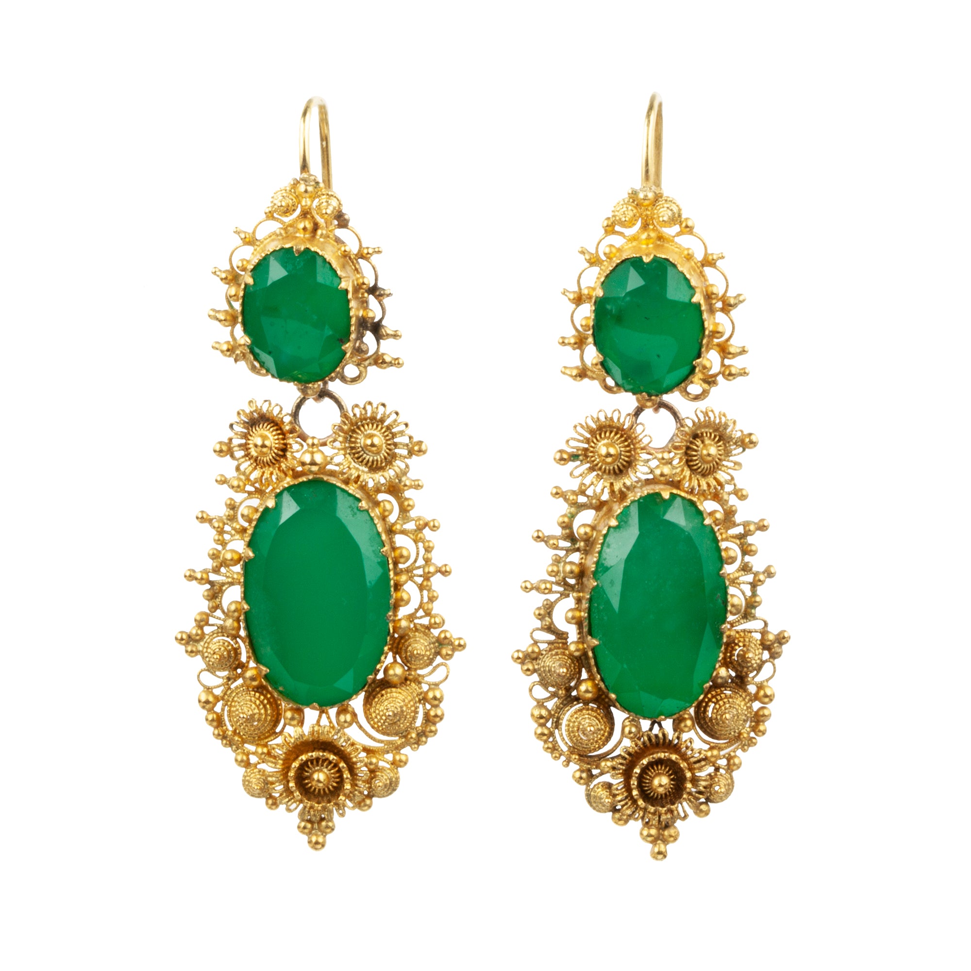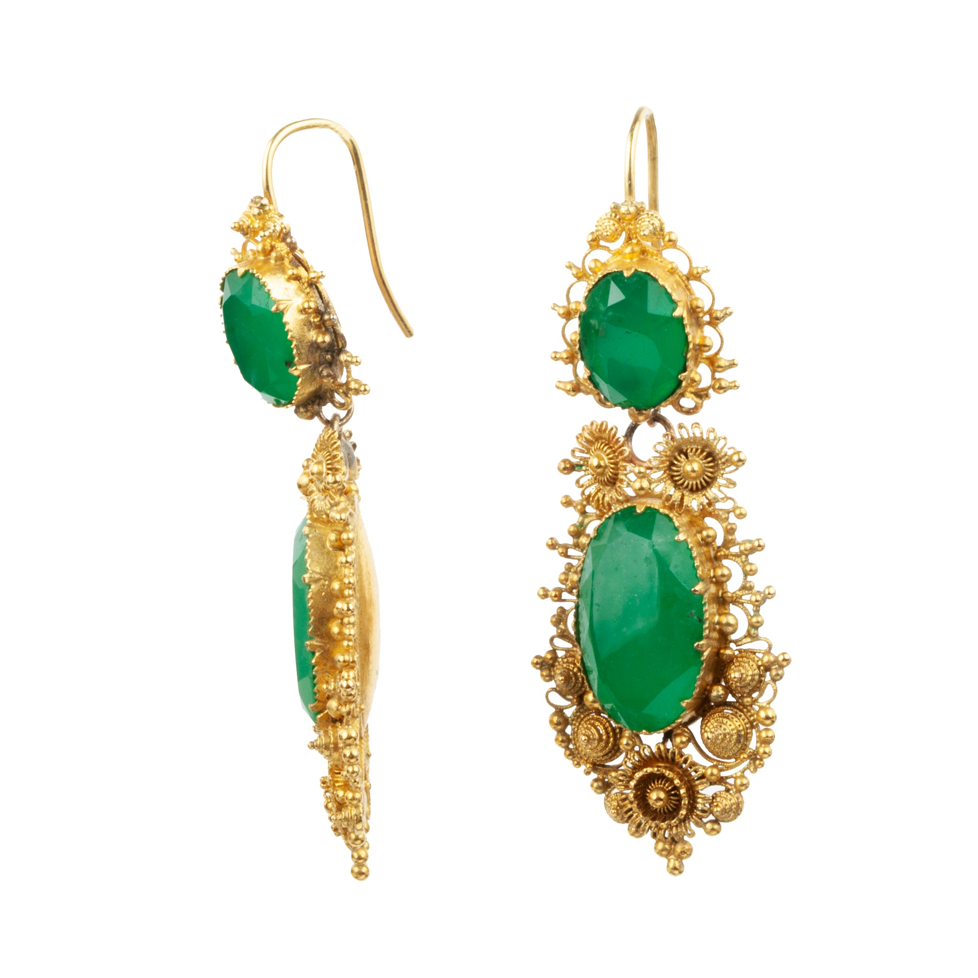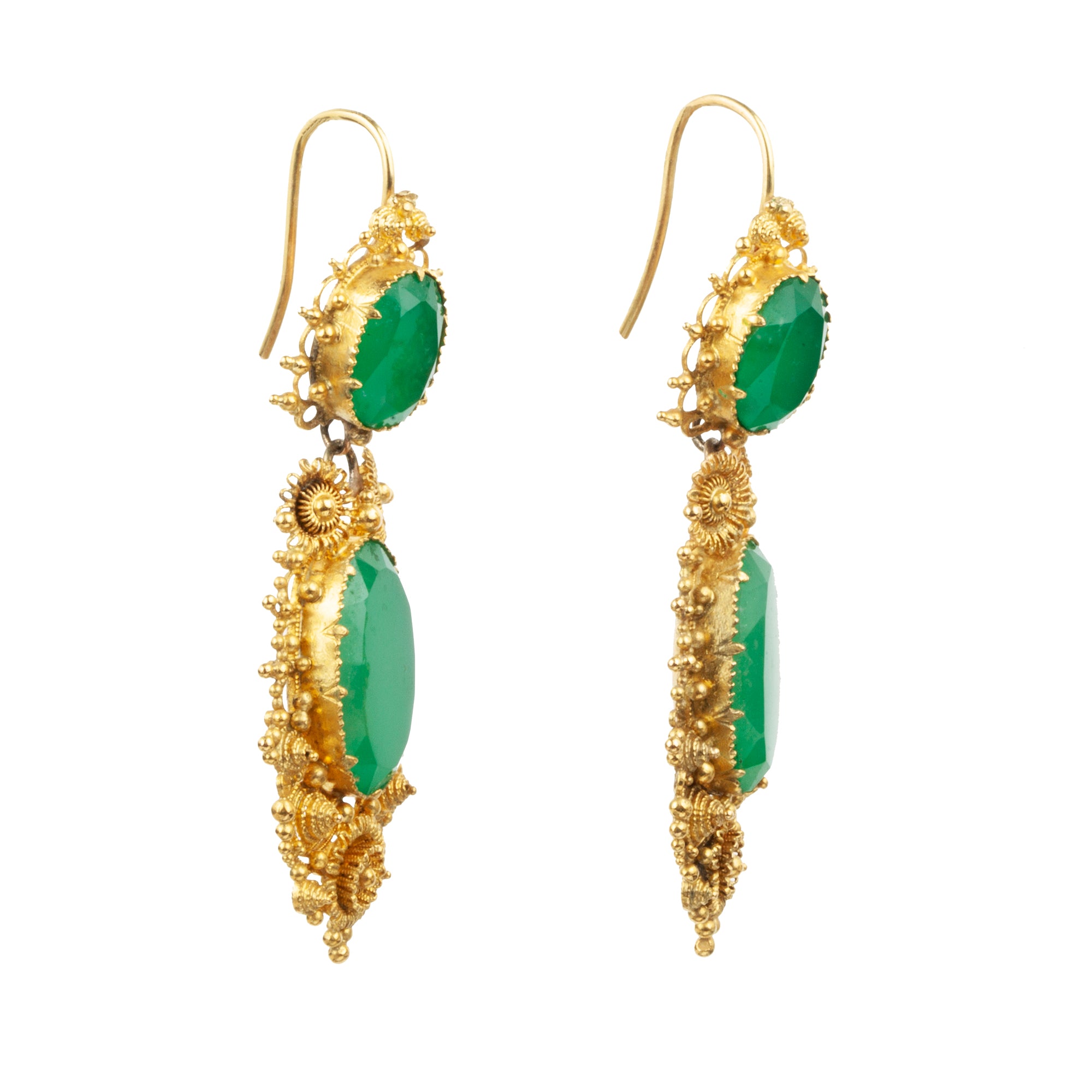 Bright apple green Chrysophrase gemstone earrings, set in intricate 18k gold cannetille settings. English in origin. Circa 1830.