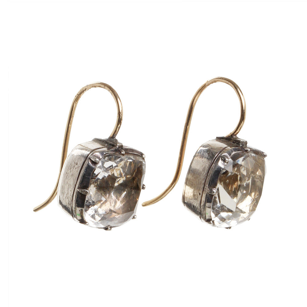 Georgian era cushion white paste earrings. Bright white paste stones are set in foiled back silver settings on 18k gold wires. What were once beautiful Georgian era buttons or cufflinks are now perfect everyday earrings. English in origin. Circa 1810.