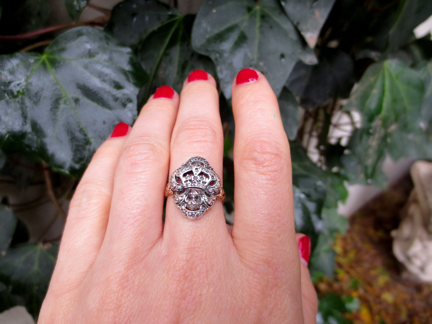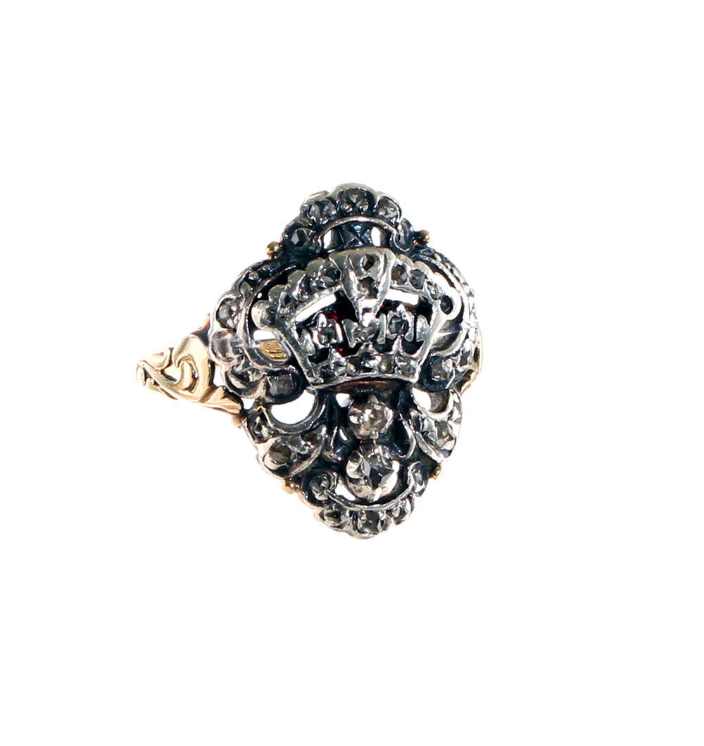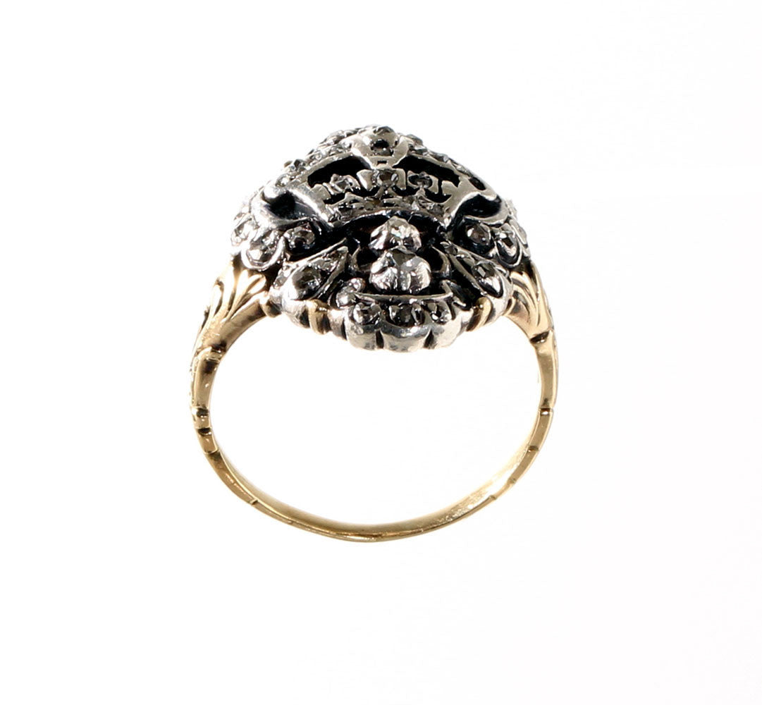 Early Georgian era ring. In silver on gold with rose cut diamonds. In the form of a crown on a crest or shield. Beautiful closed back with reeded details. Circa 1750.