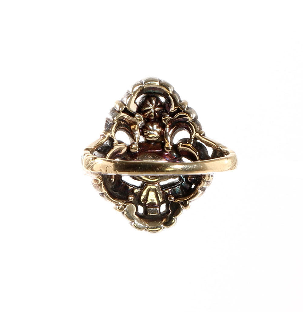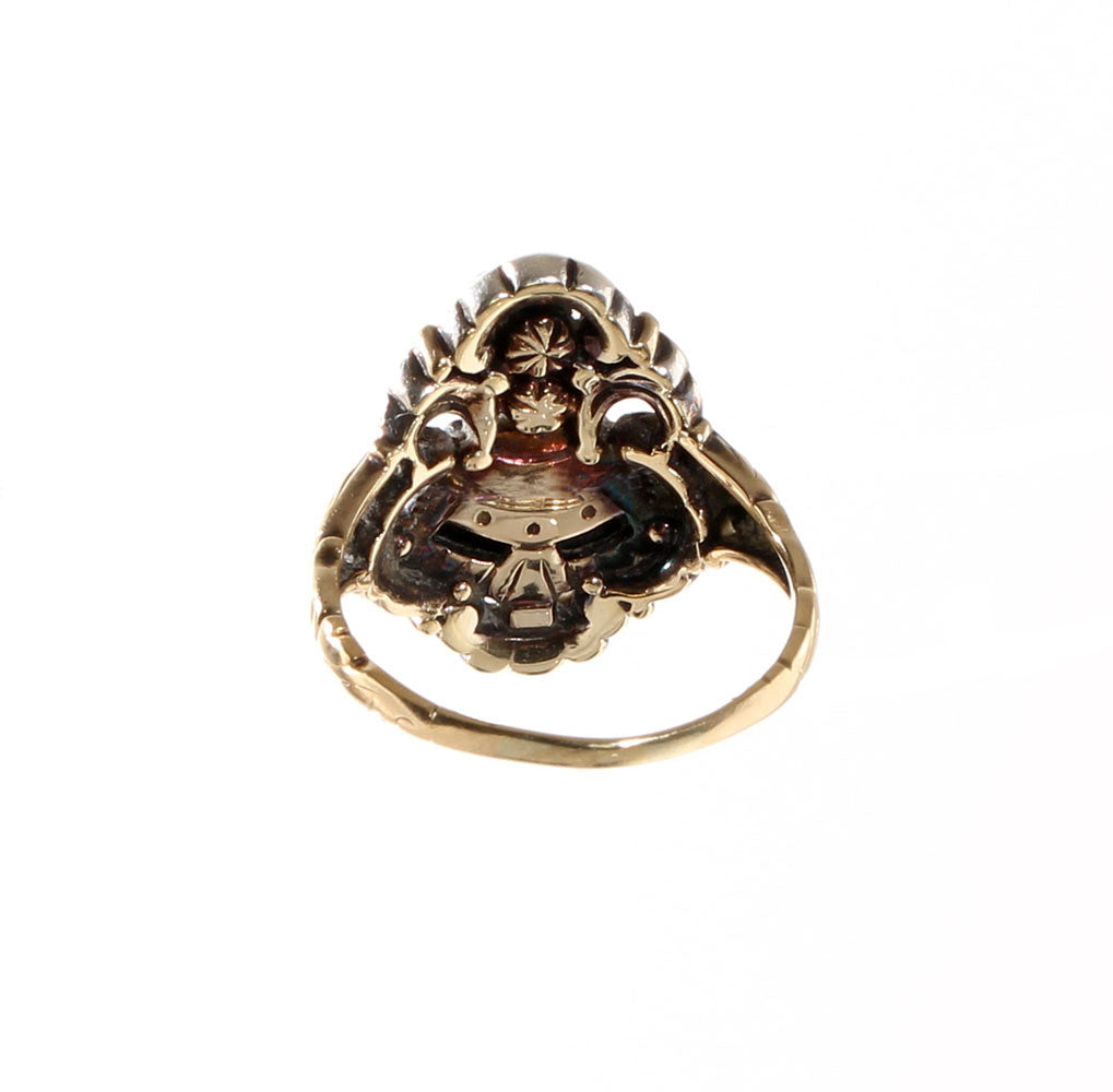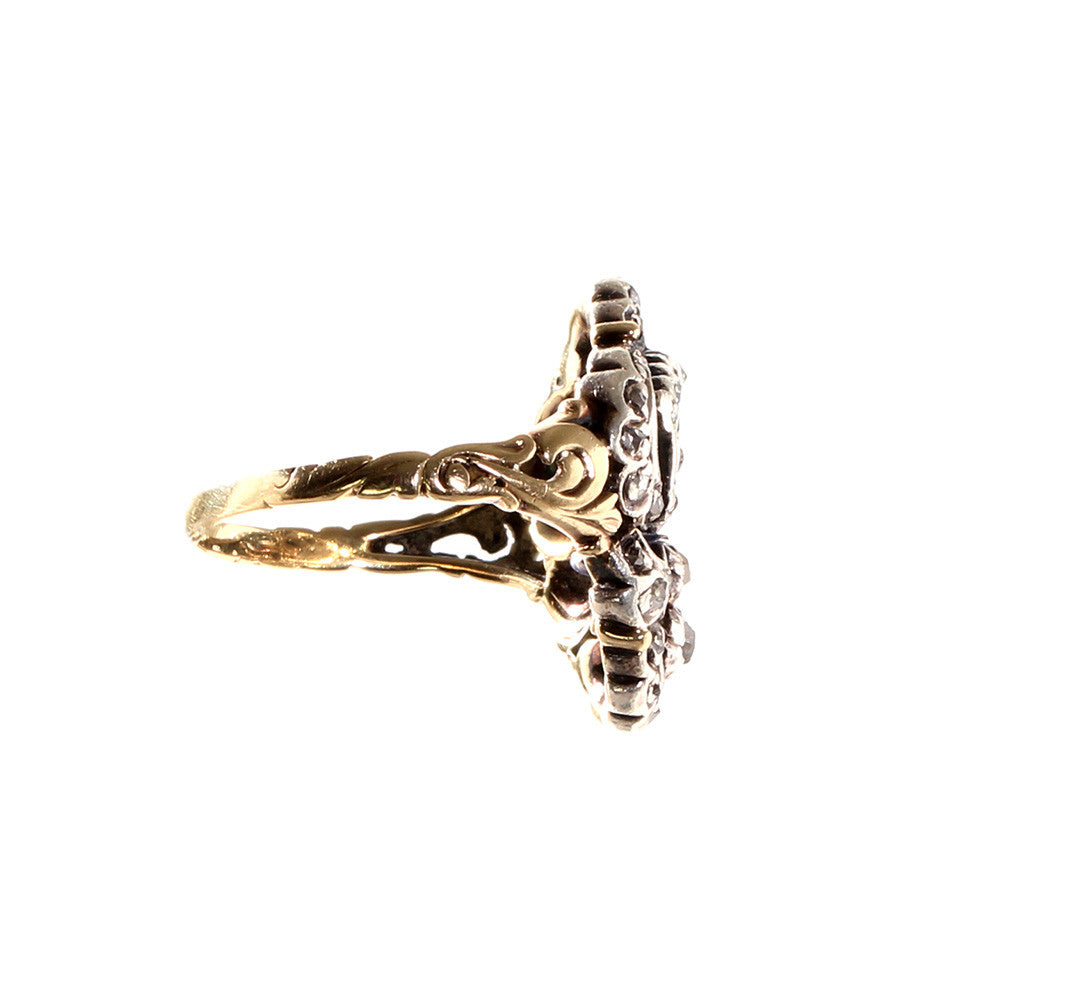 Early Georgian era ring. In silver on gold with rose cut diamonds. In the form of a crown on a crest or shield. Beautiful closed back with reeded details. Circa 1750.