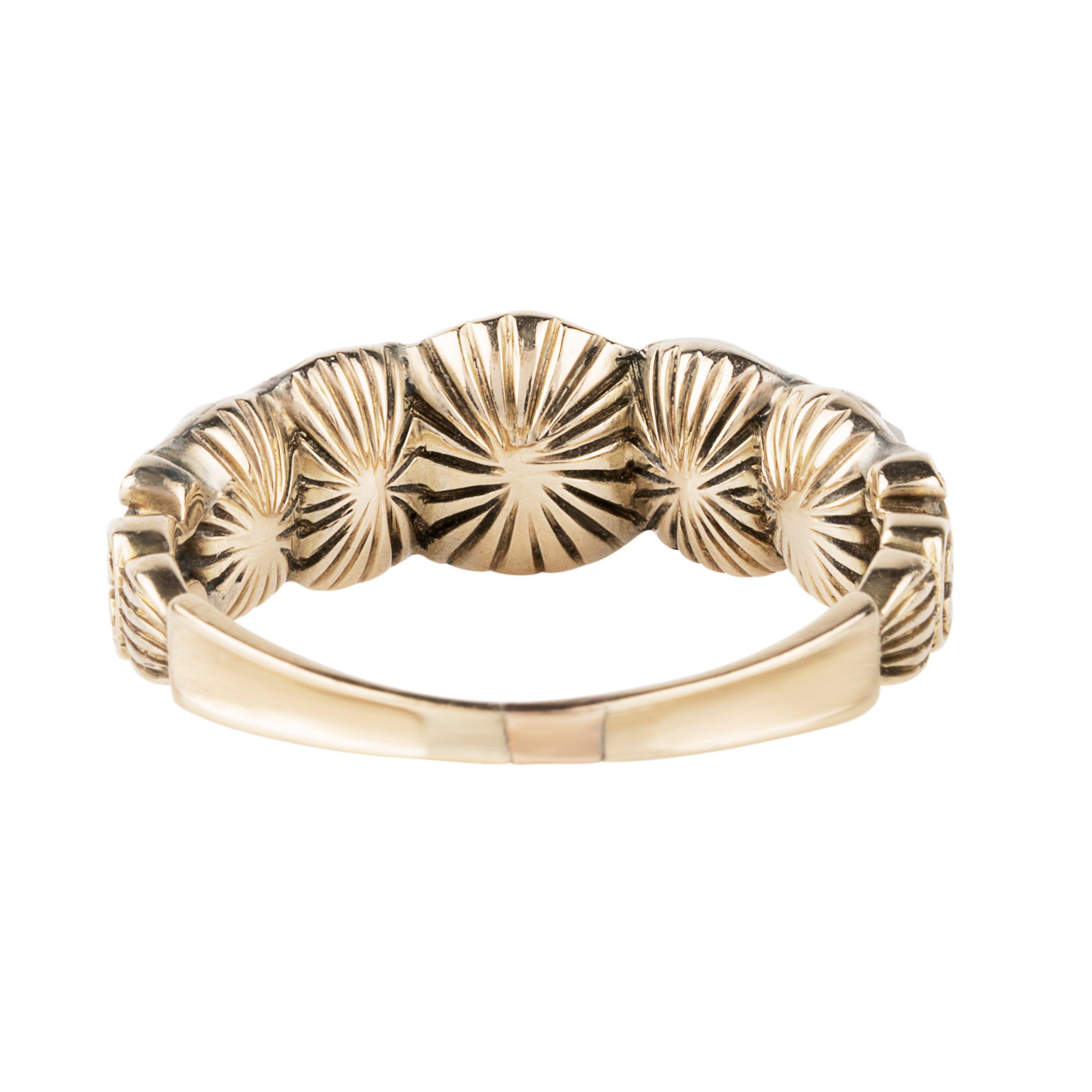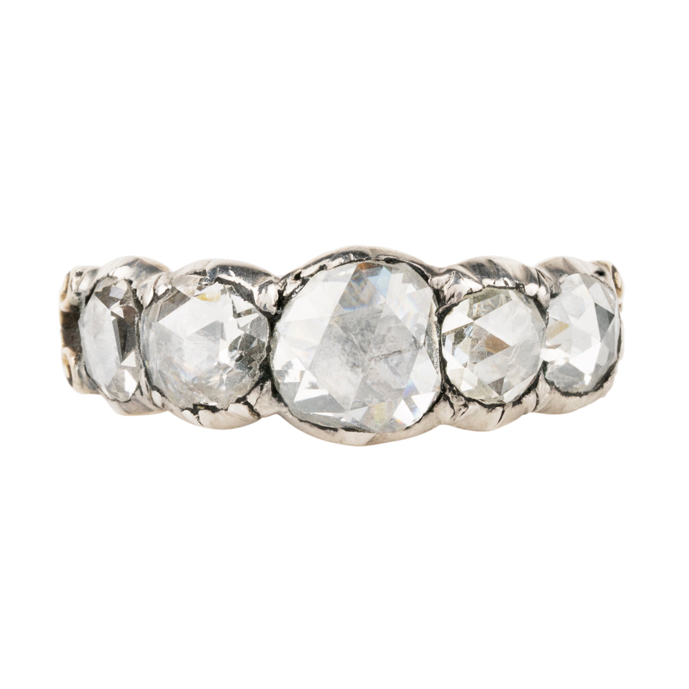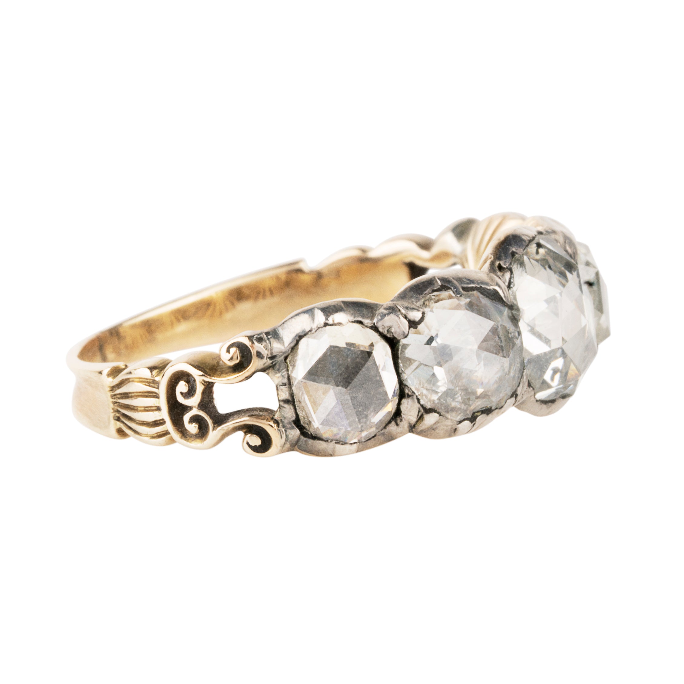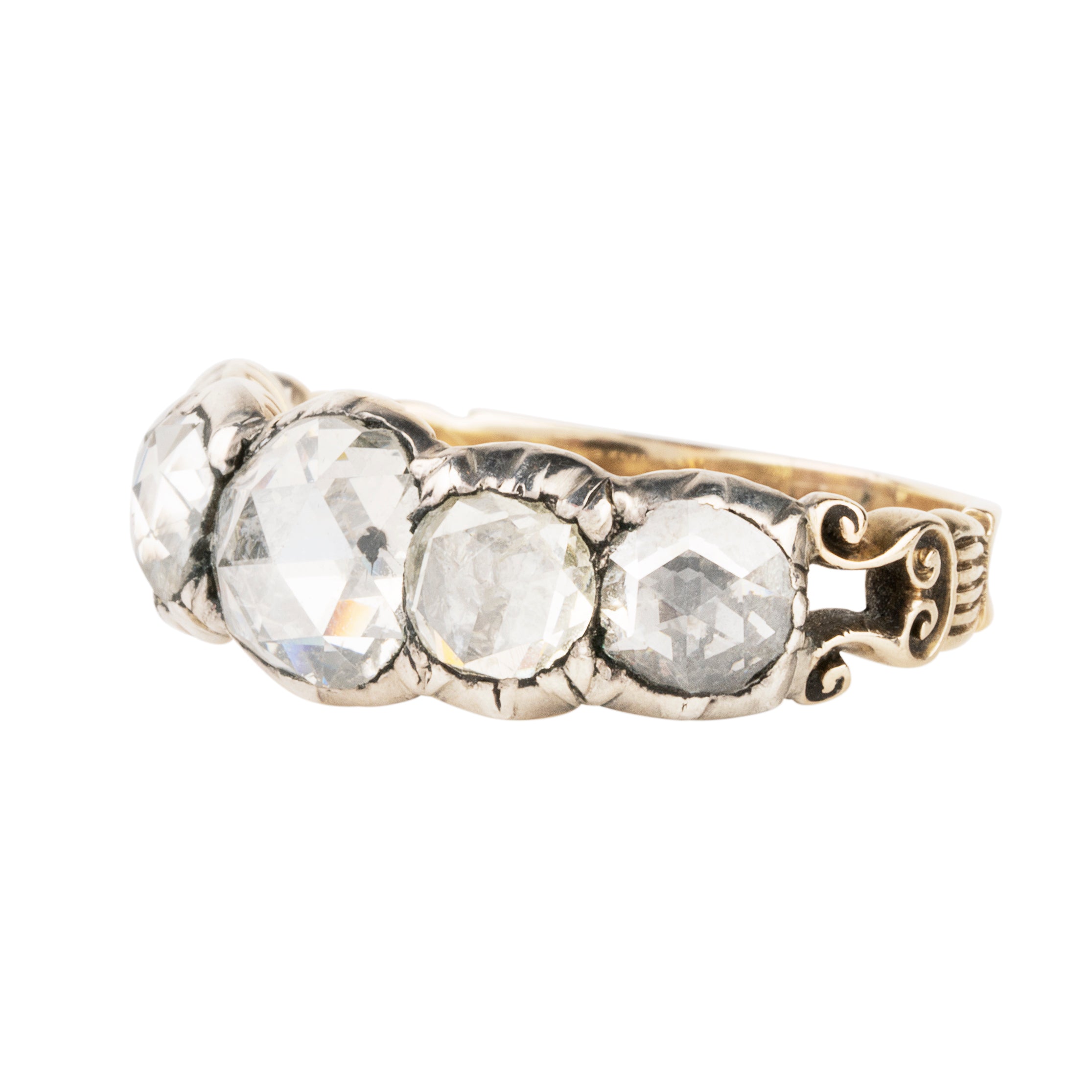 Georgian era five stone rose-cut diamond ring. In a closed back silver topped gold setting with lyre detail on the shoulders. England. Circa 1800.
