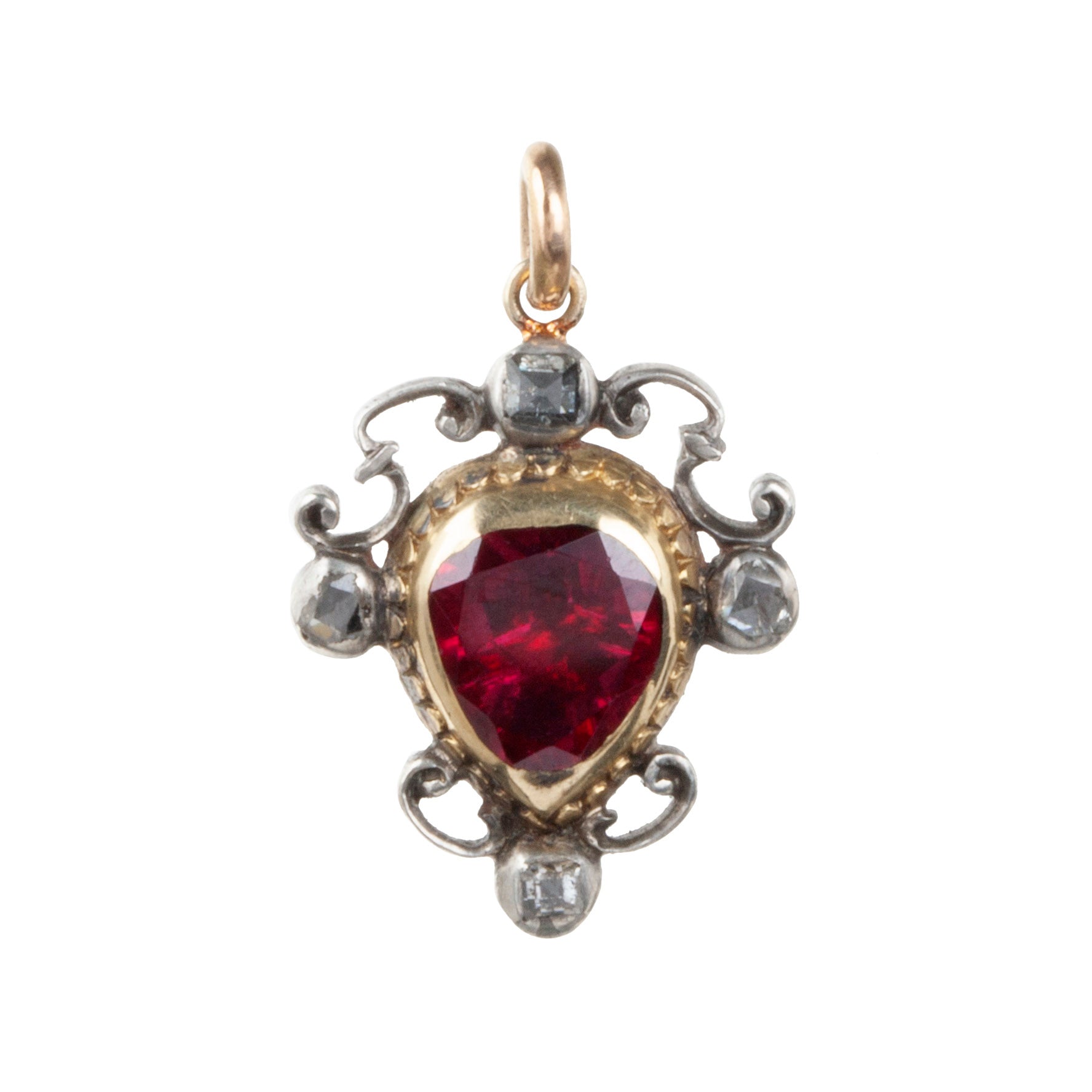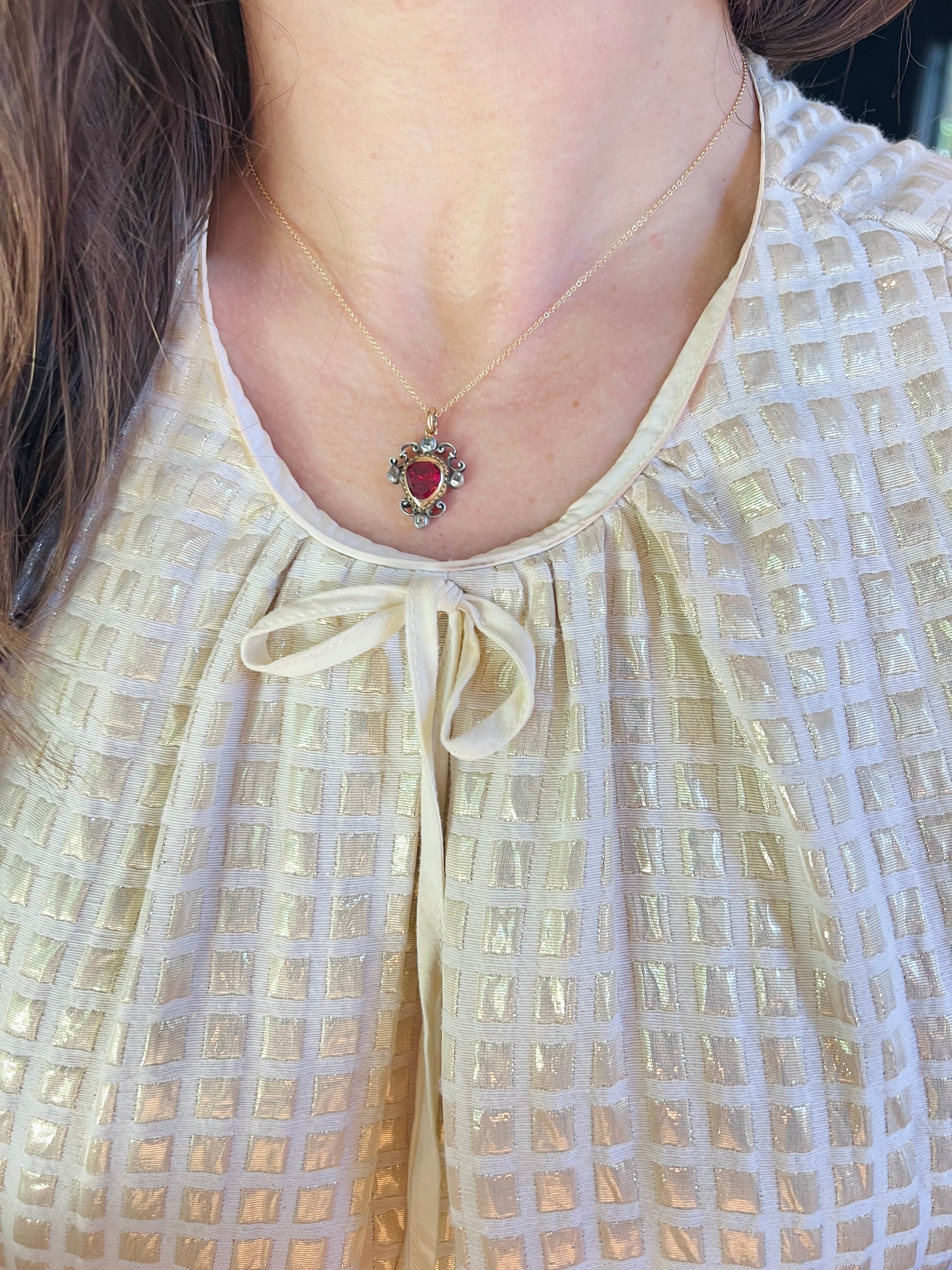 Georgian era garnet and diamond crowned heart pendant, in silver and gold. Heart shaped Flat cut garnets set with four table-cut diamonds. The rose cut diamond crown illustrates the sovereignty of love. English in origin. Circa 1760.