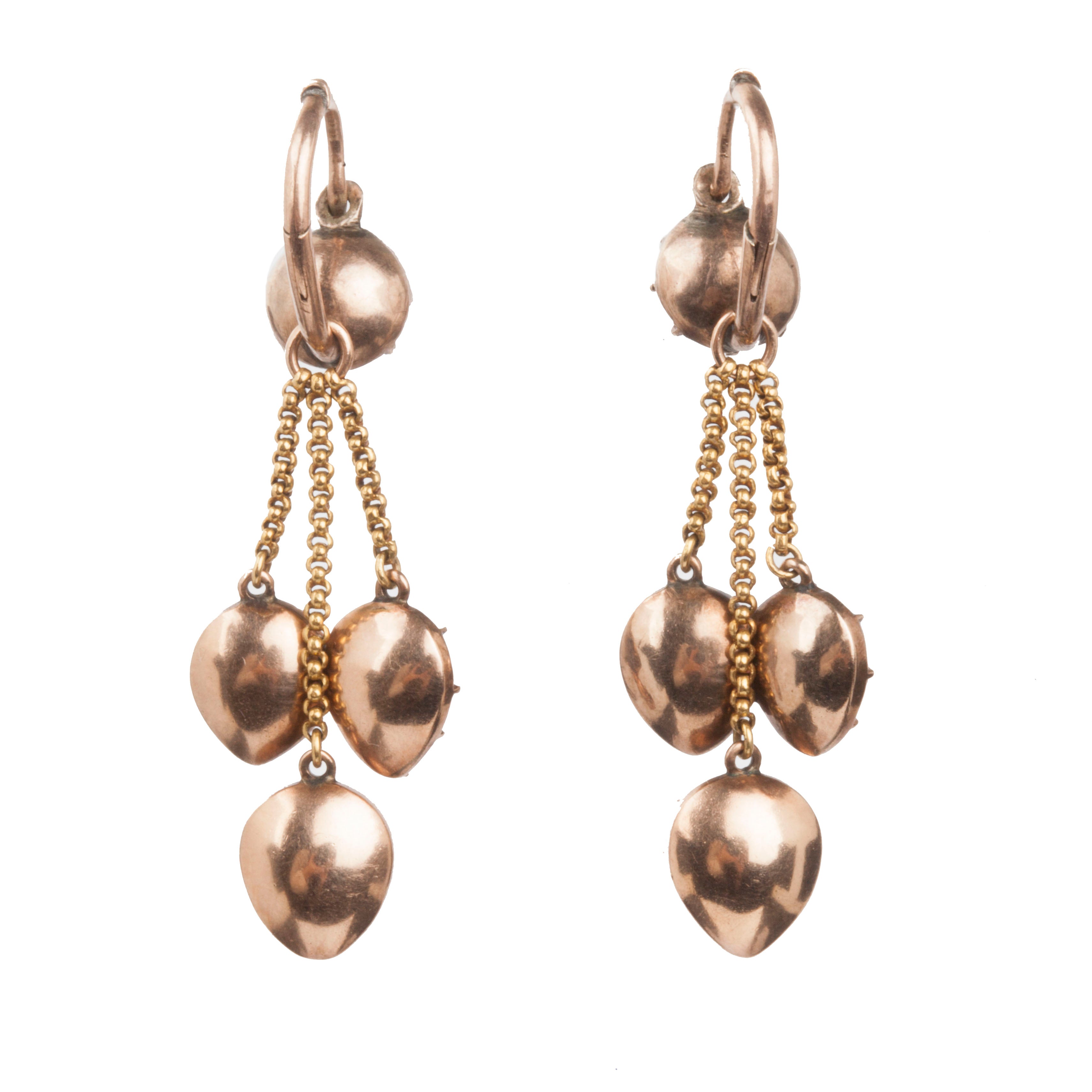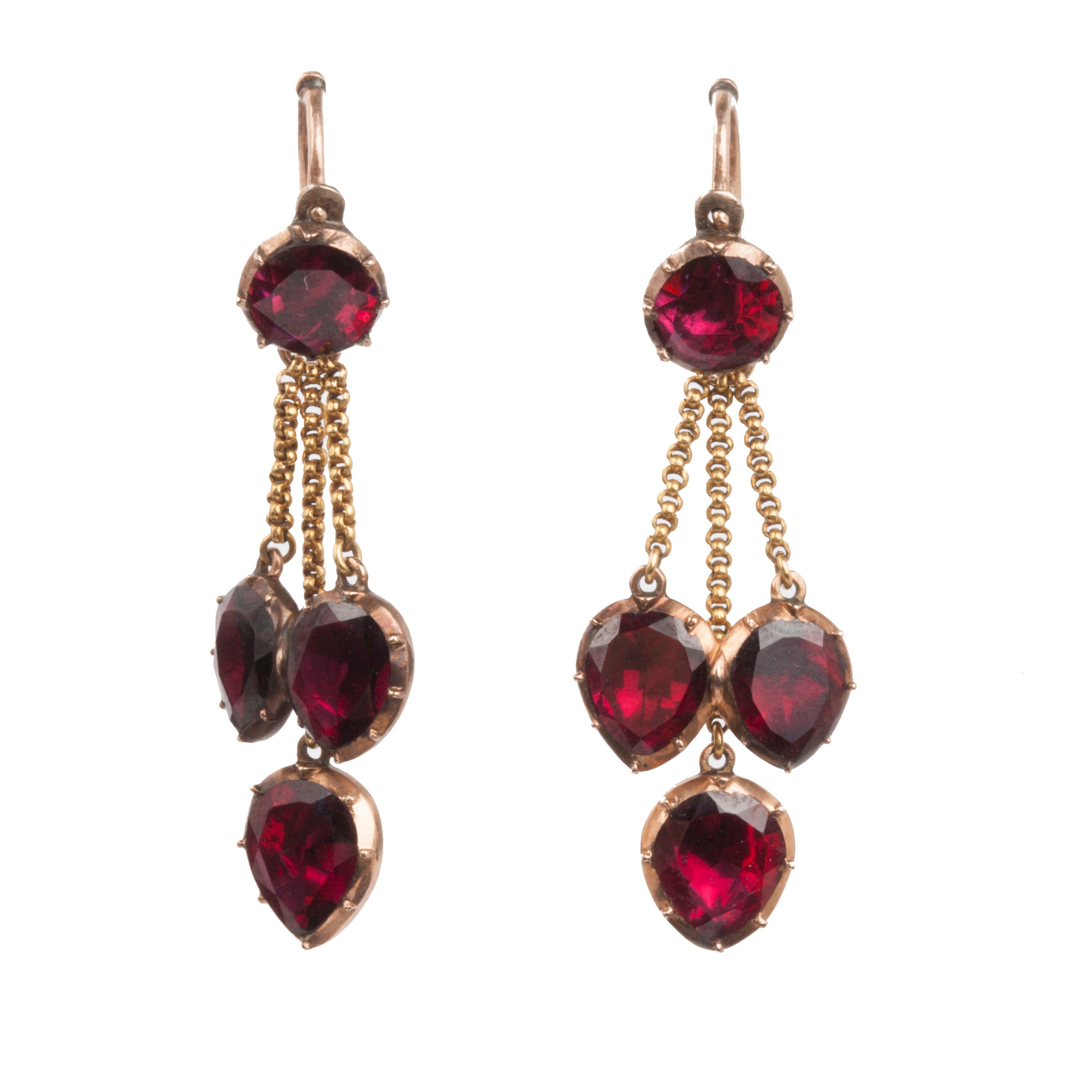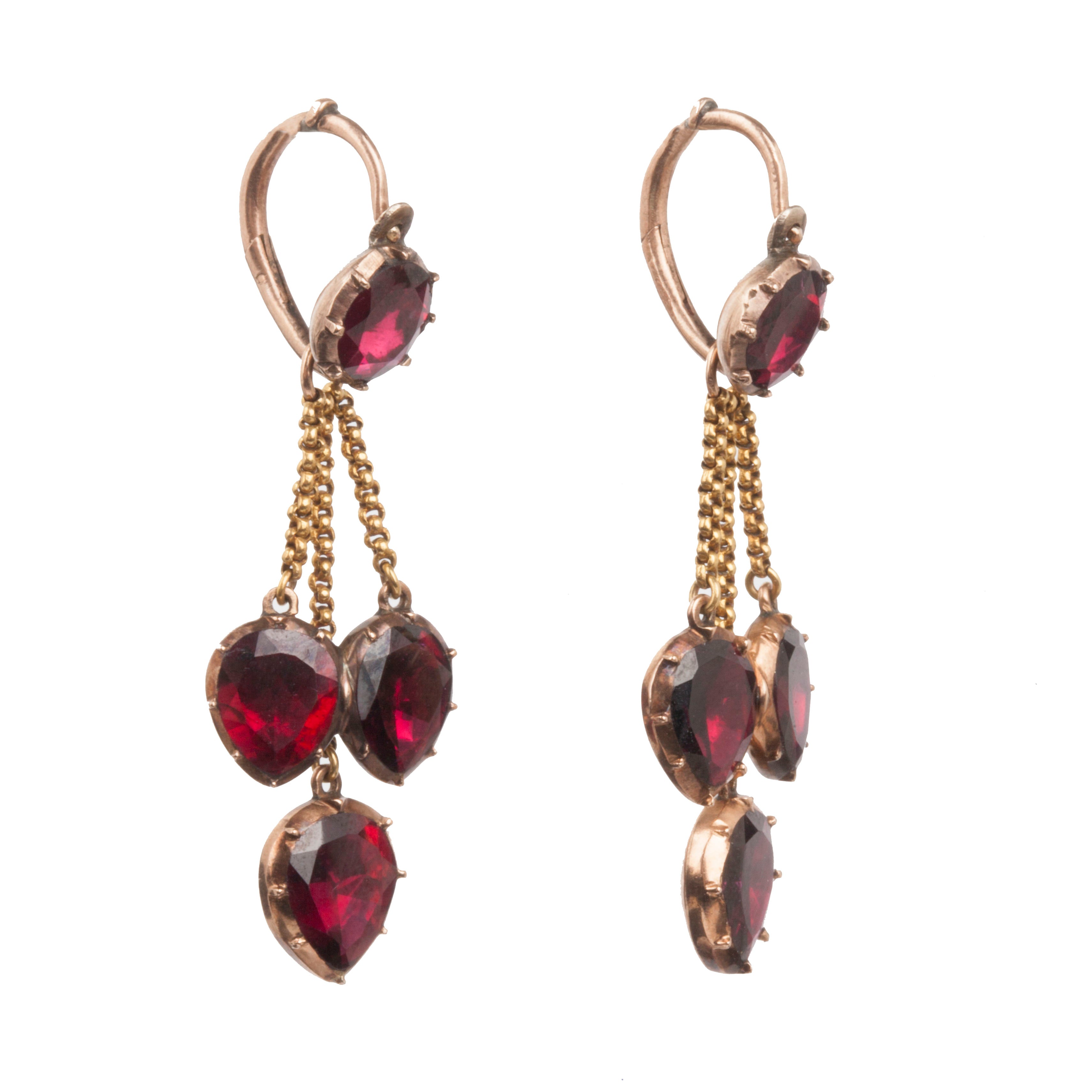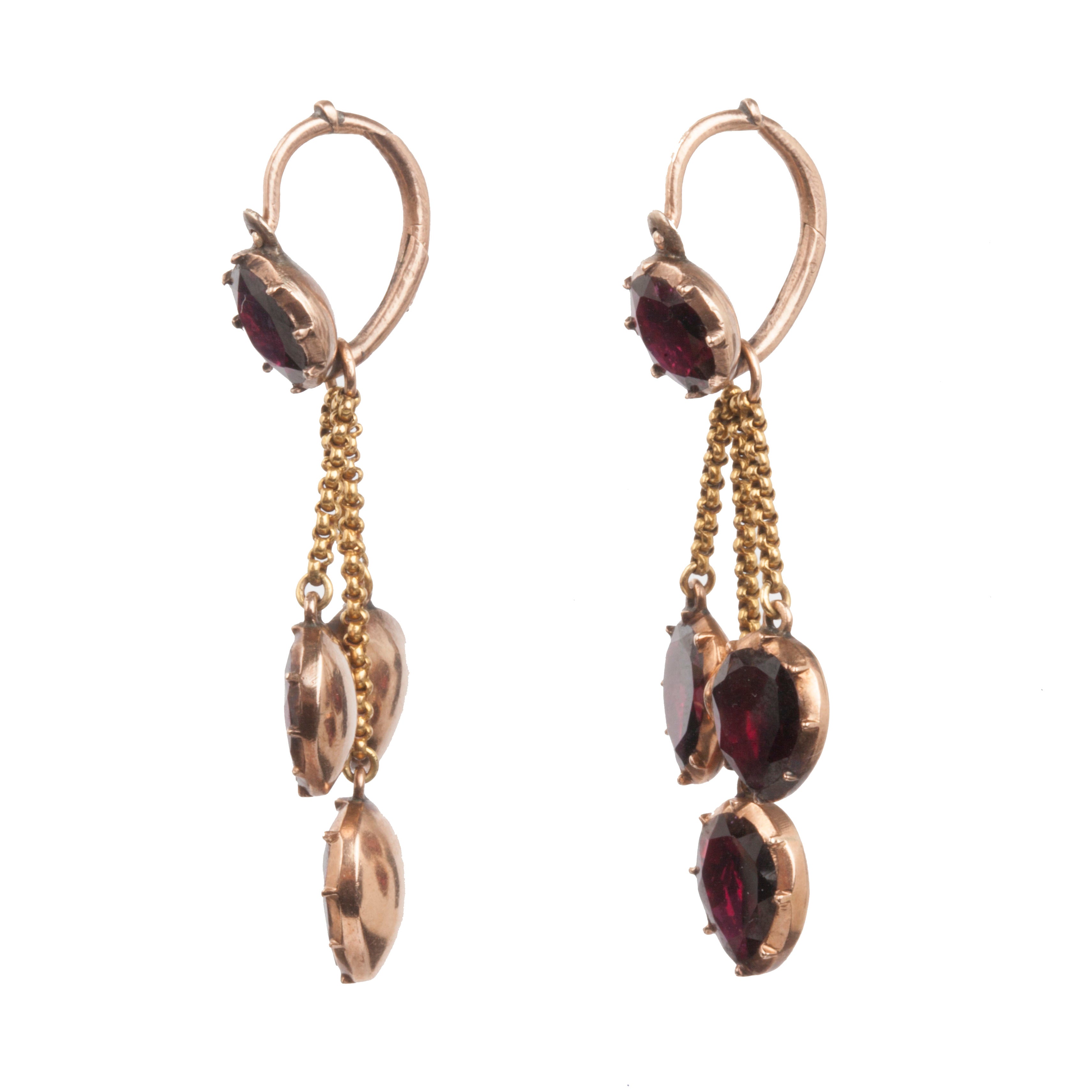 Georgian era garnet triple tear drop earrings day and night earrings, on 18k gold chains. With tradition back to front leveling earring hooks. Circa 1800. English in Origin.