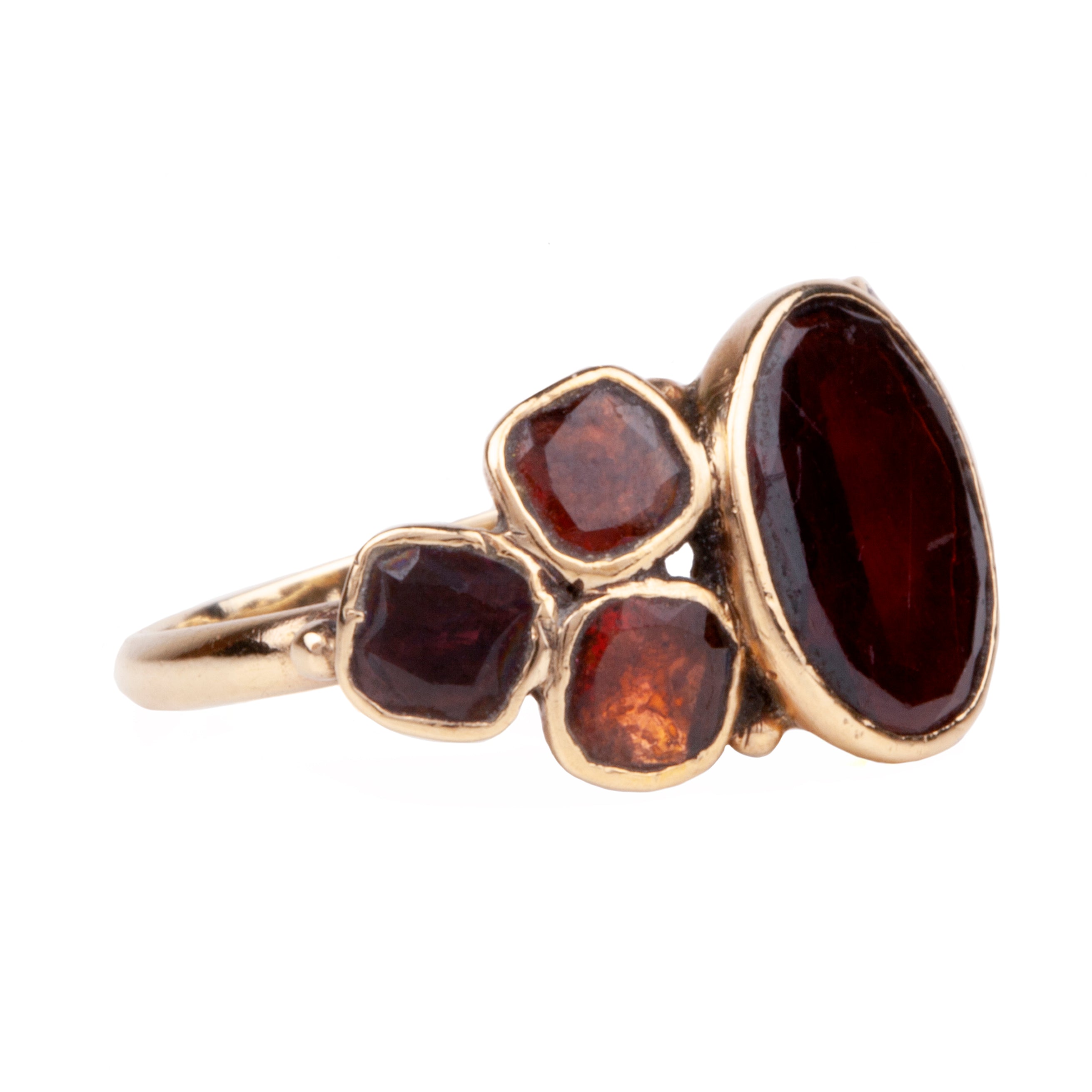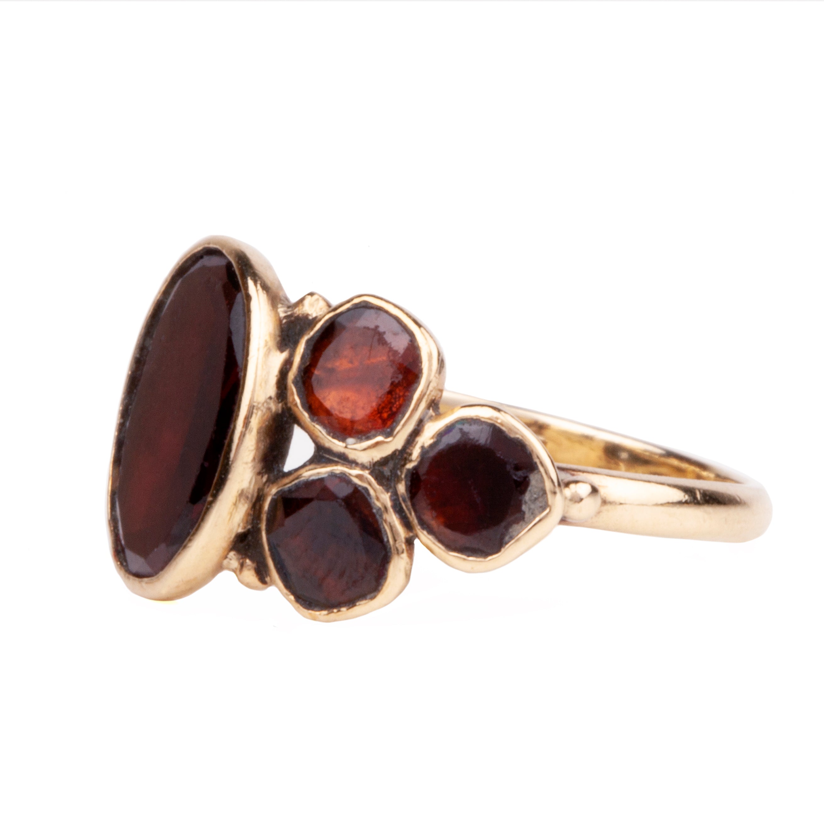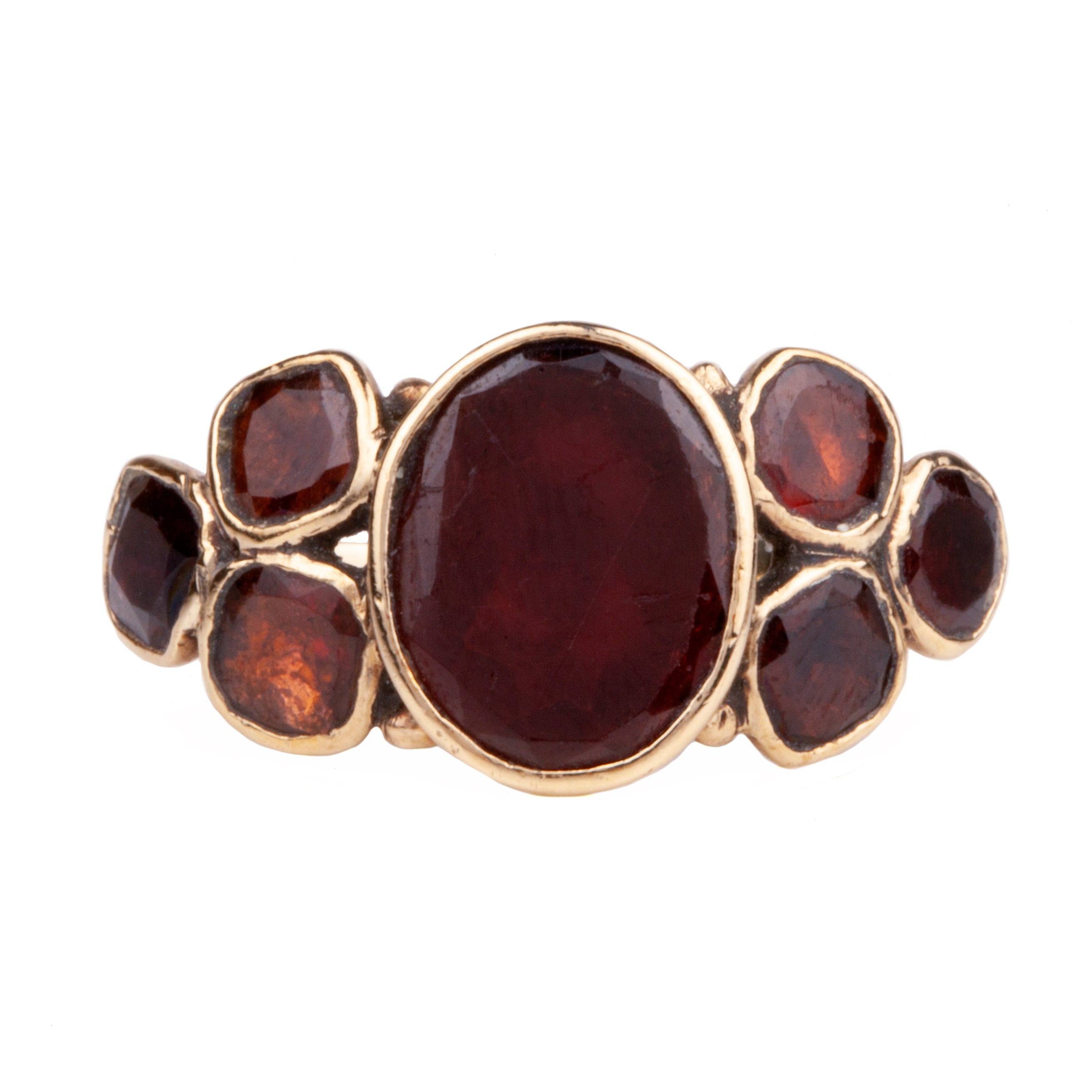 Georgian era garnet seven stone ring, set in gold. Old beautiful flat cut garnets set in closed back setting. English in Origin. Circa 1820.