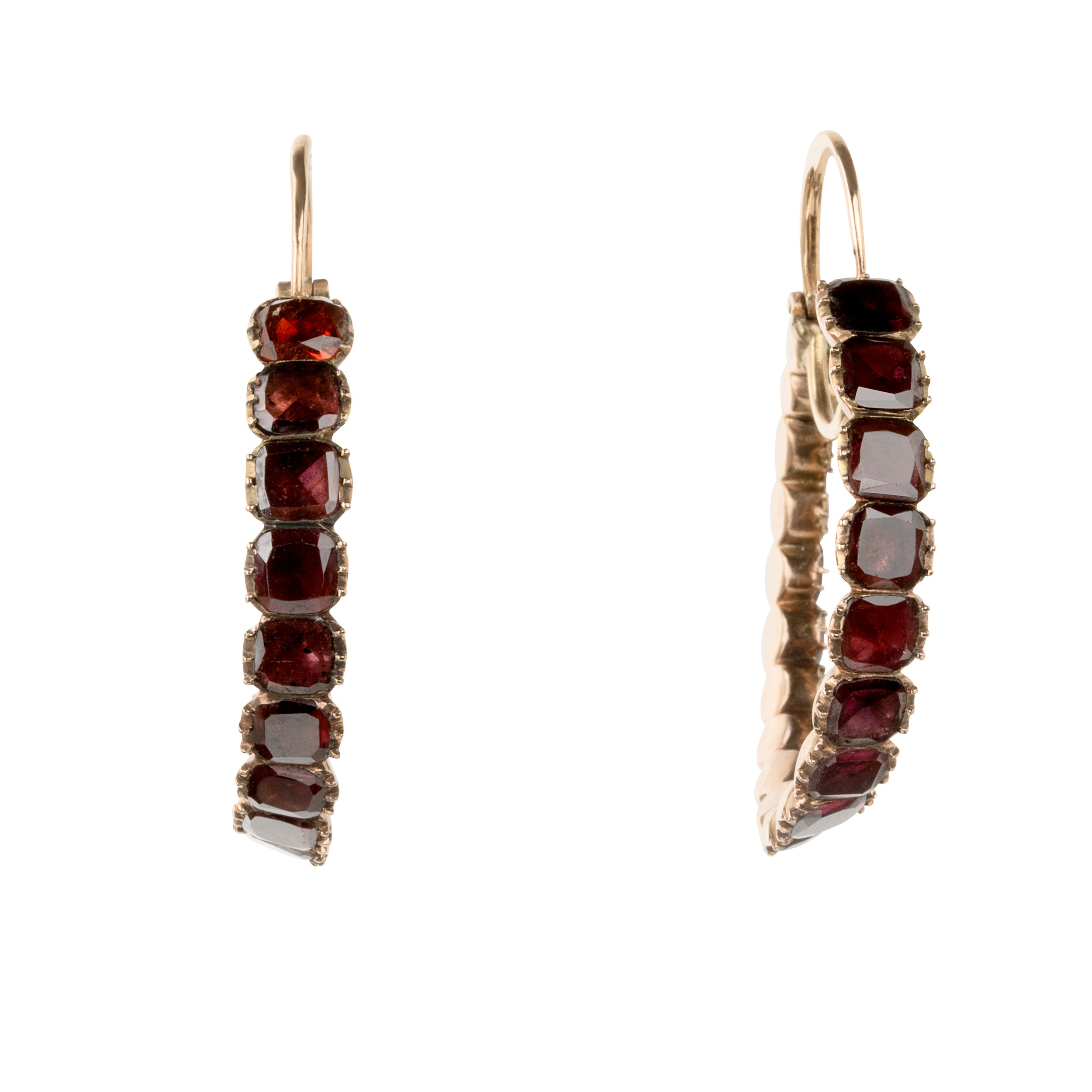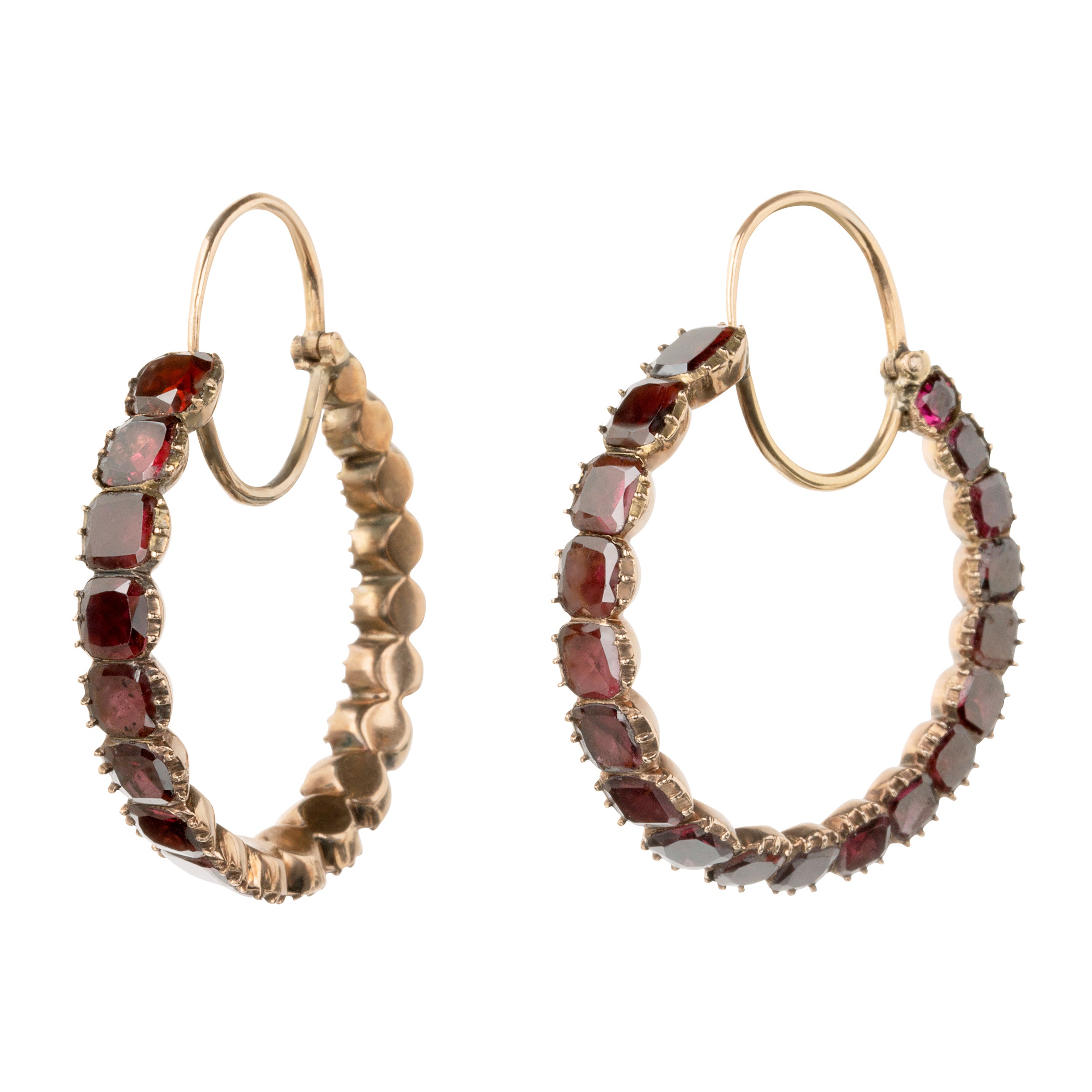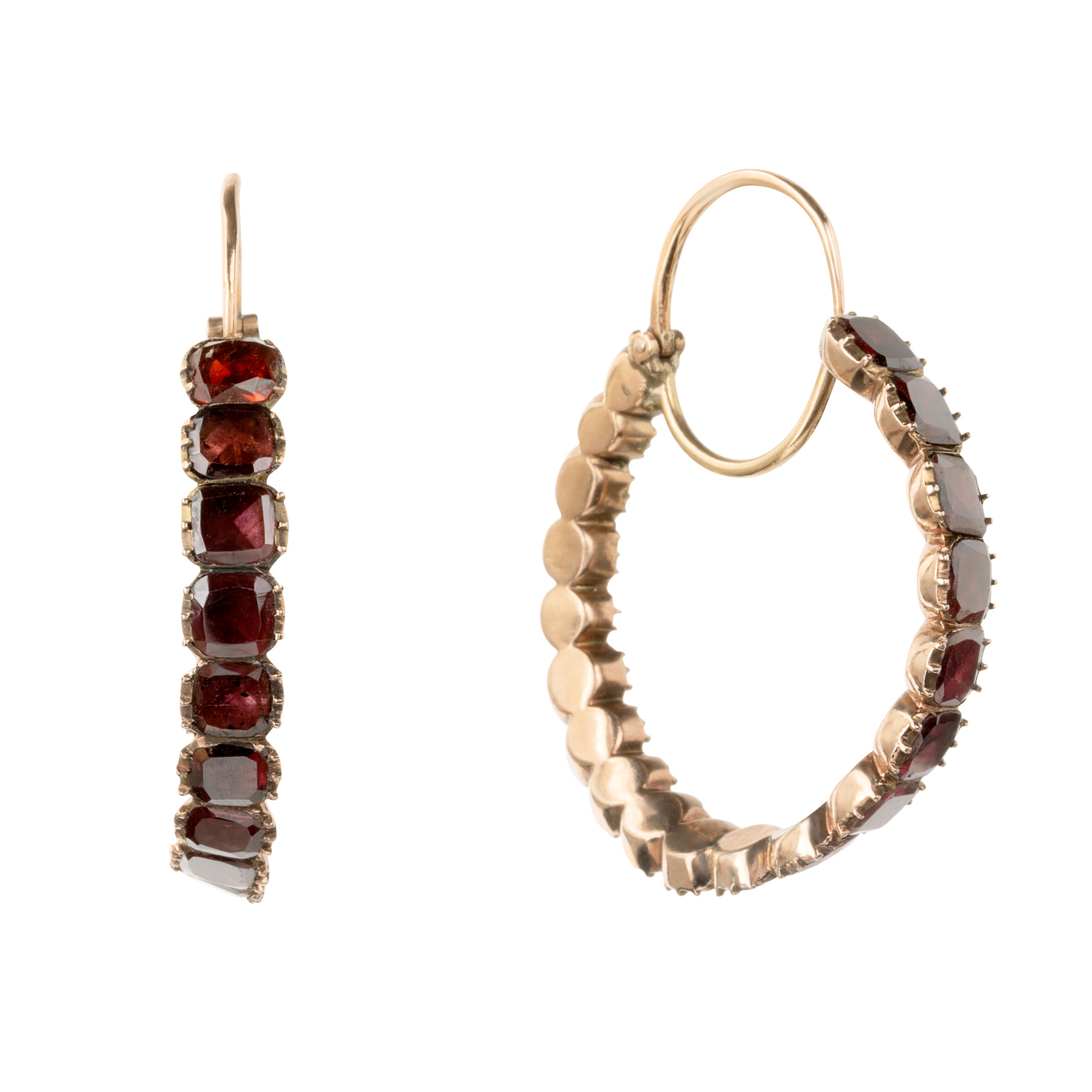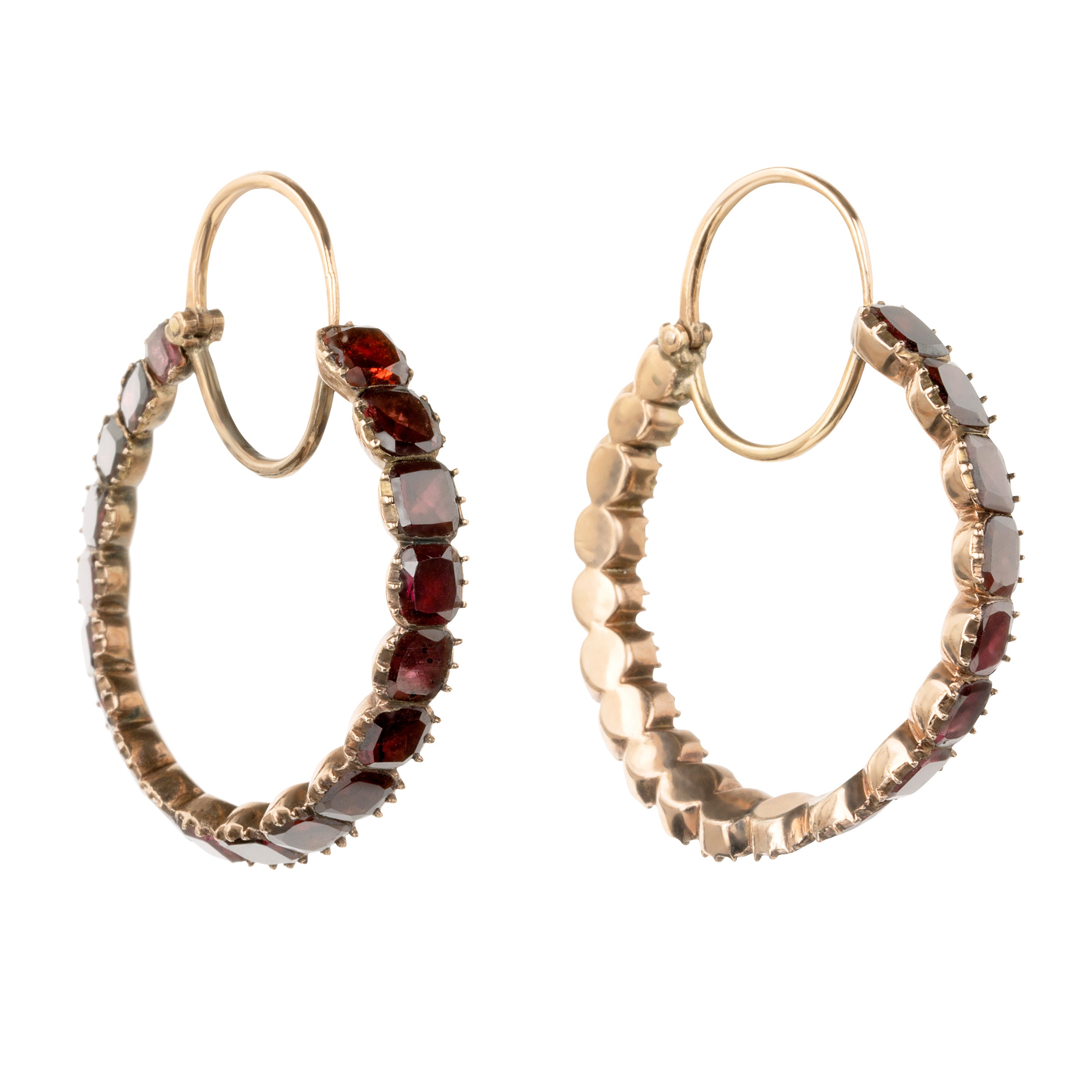 A rare example of a Georgian era hoop earrings. Flat cut garnets are set in gold cutaway settings. The unusual form is similar to French poissarde earring designs. Twisted detail reveals the garnets all the way around. The foil-backed settings have a beautiful dark patina. These light and delicate earrings are typical of the period, with back-to-front fittings. Europe, Circa 1800.