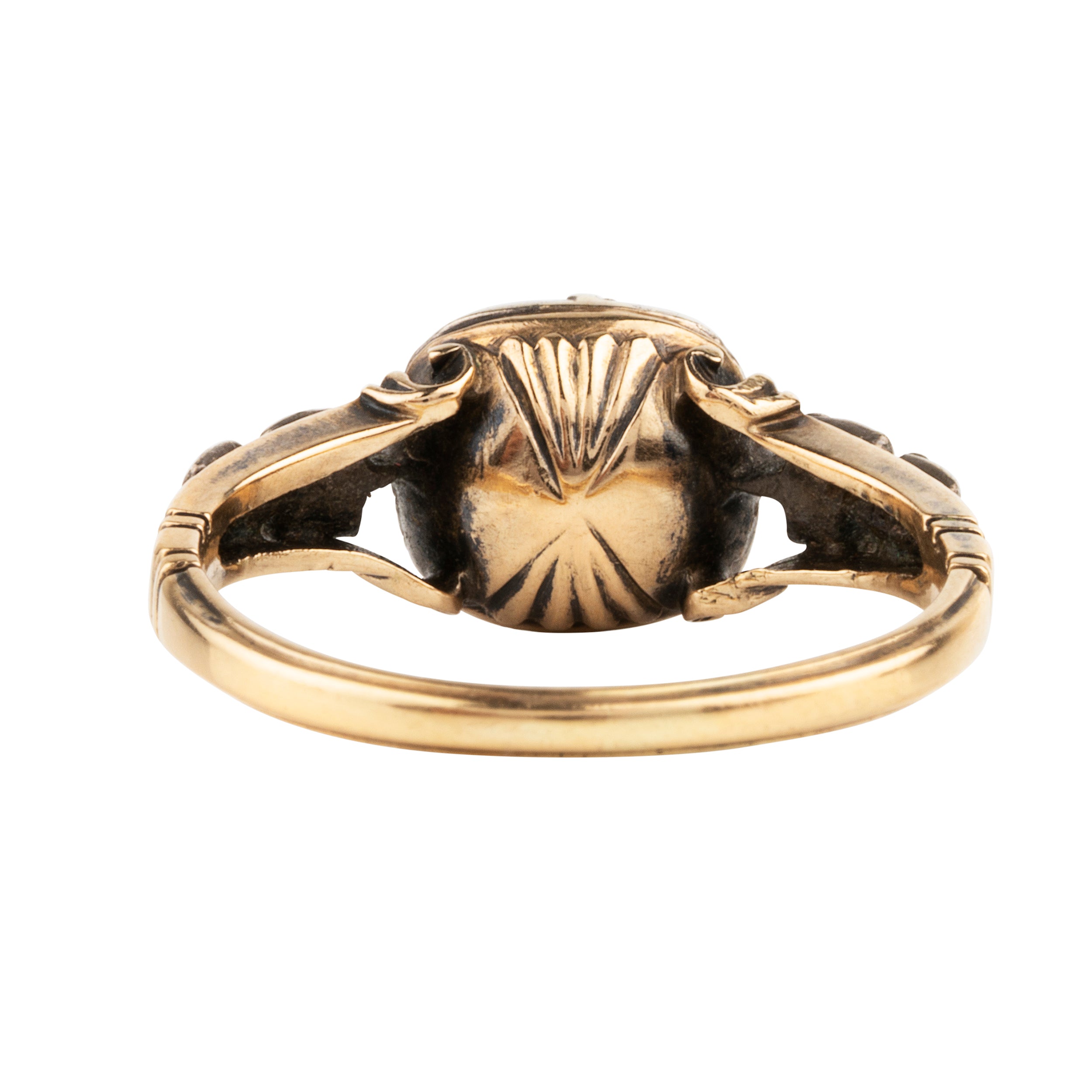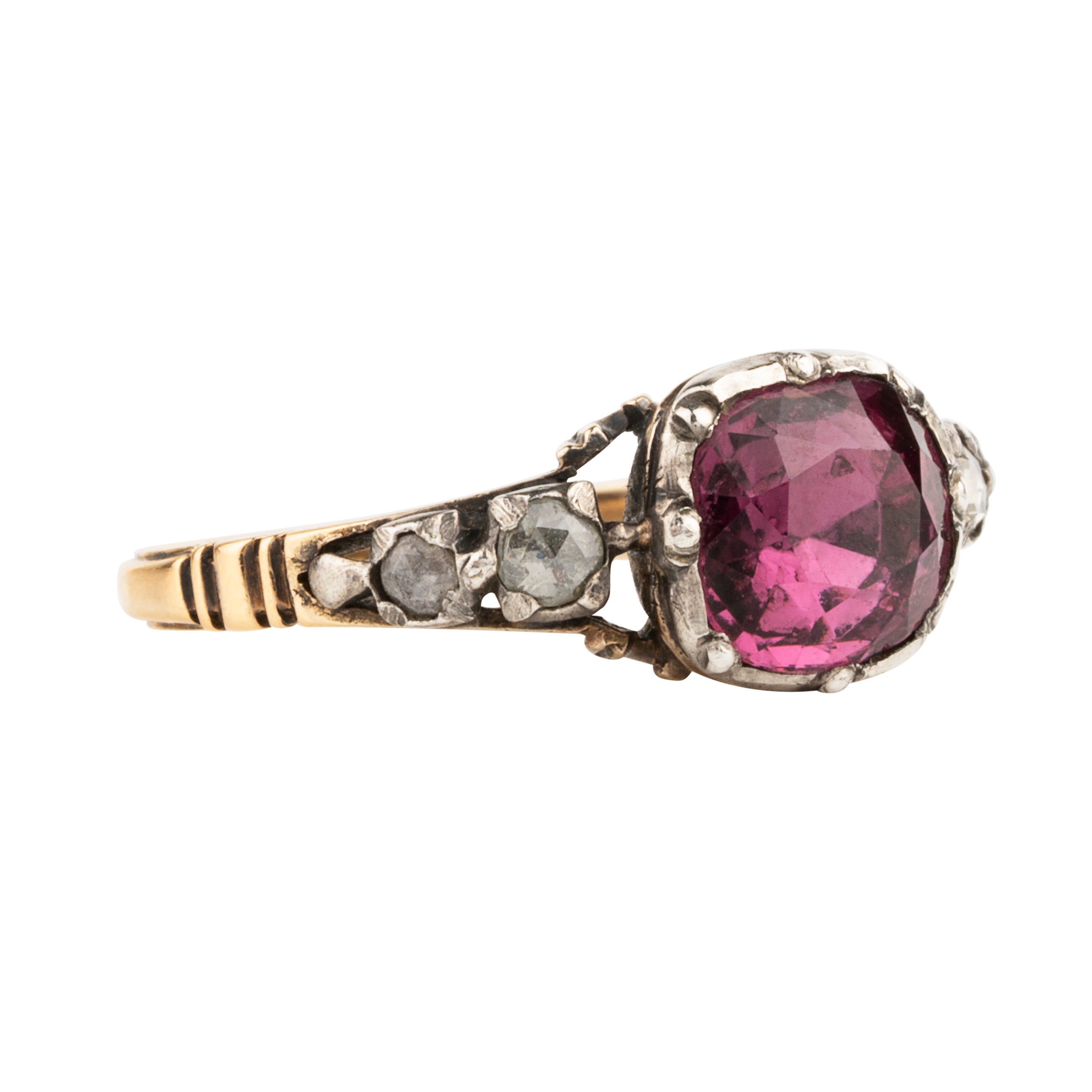 A classic form from the early 19th-Century. Four rose cut diamonds flank a richly colored garnet set in silver on gold. The main stone is close-backed with intricate reeded details.
