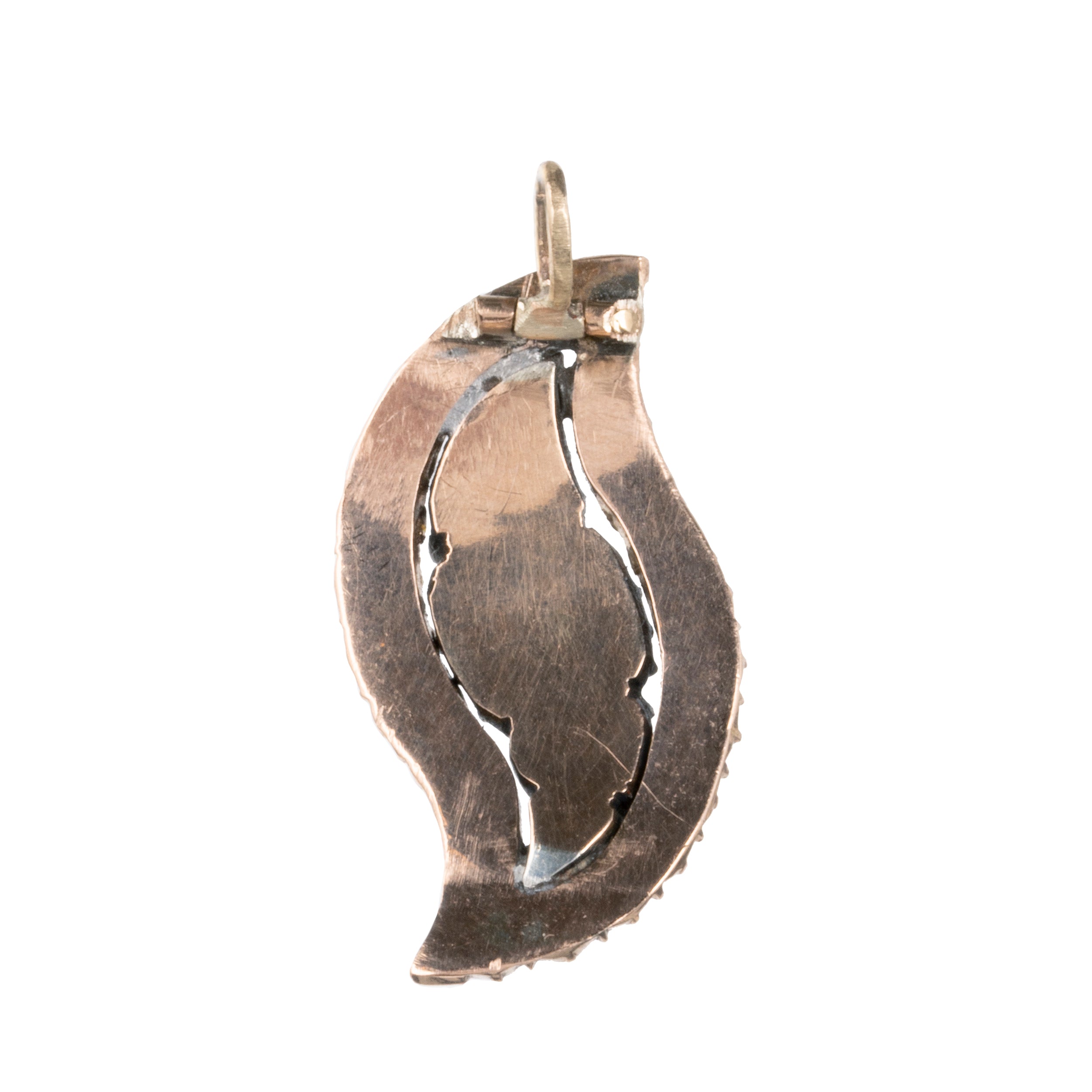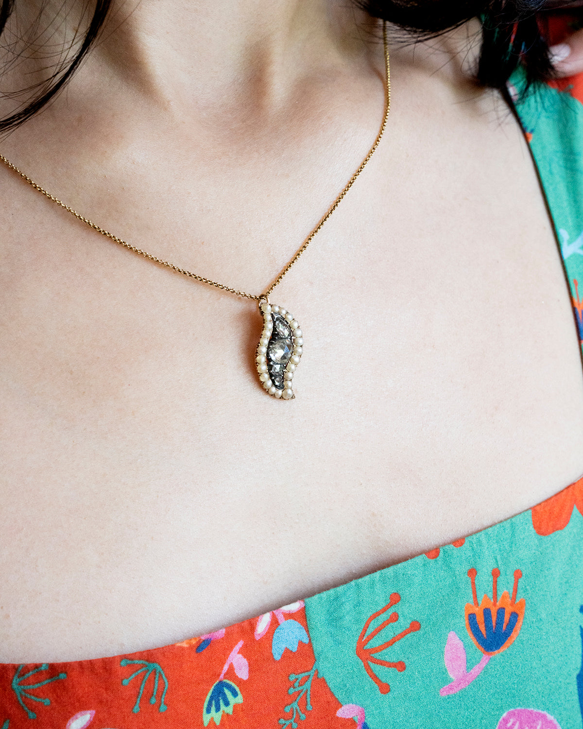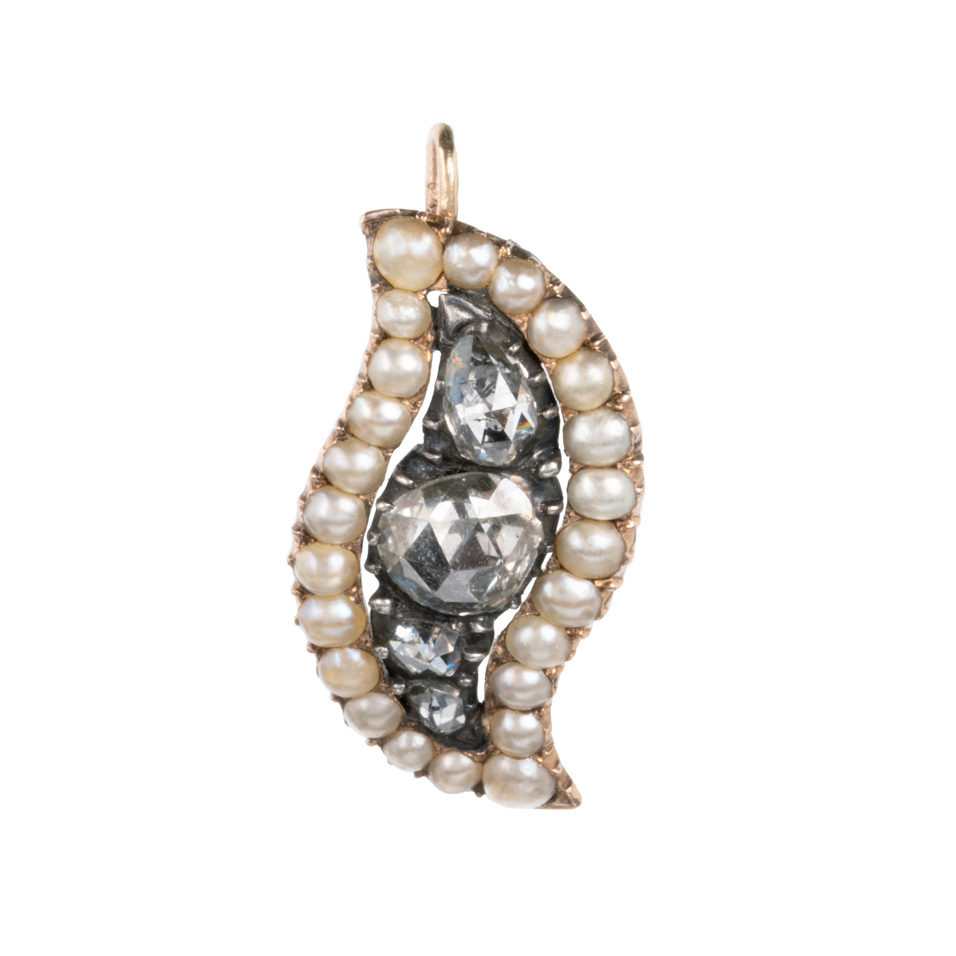 A beautifully sentimental object, the tear is formed in natural seed pearls and four rose-cut diamonds. Originally a small brooch, it was later converted into a pendant. Tears were a common 18th and 19th century mourning emblem. English in origin, circa 1810.