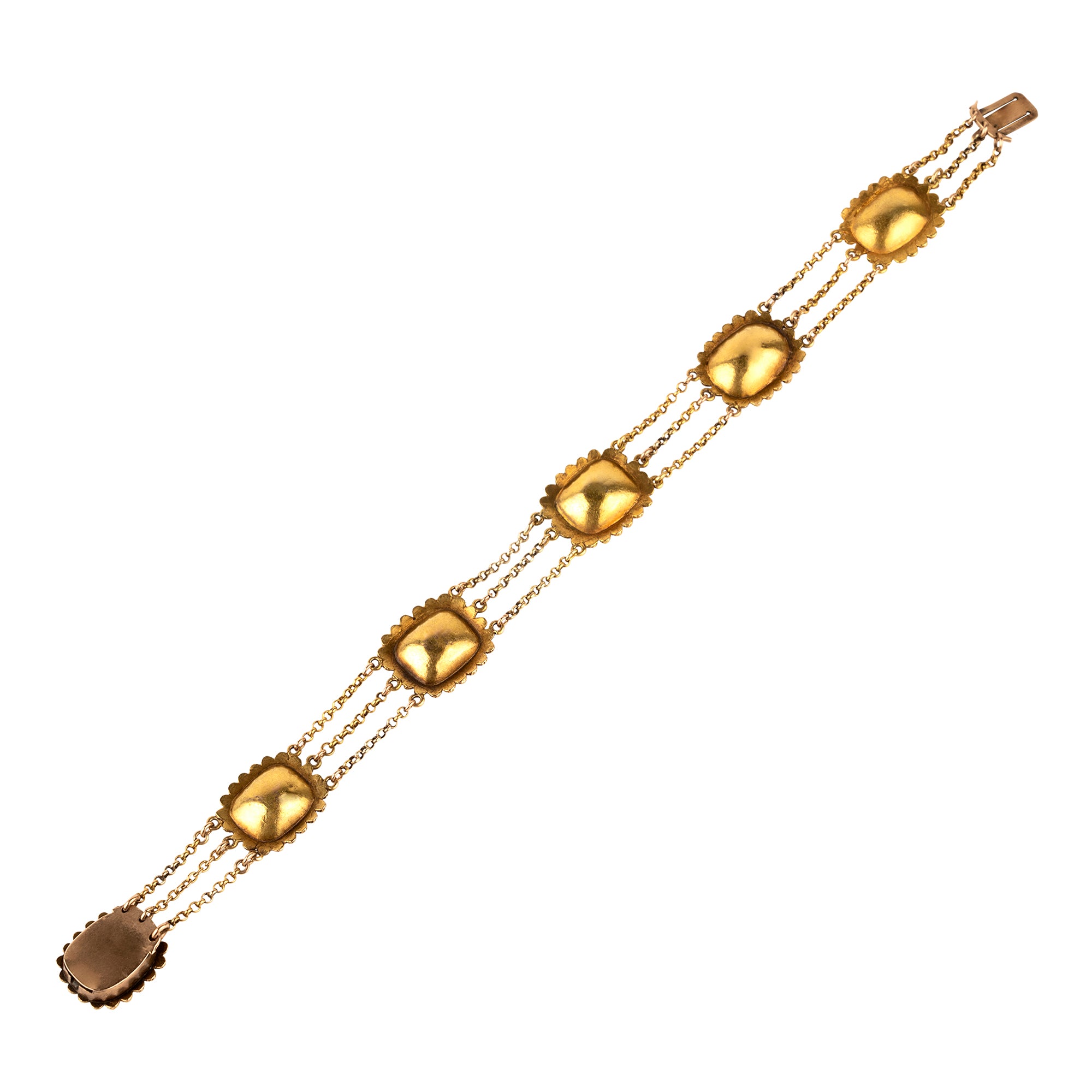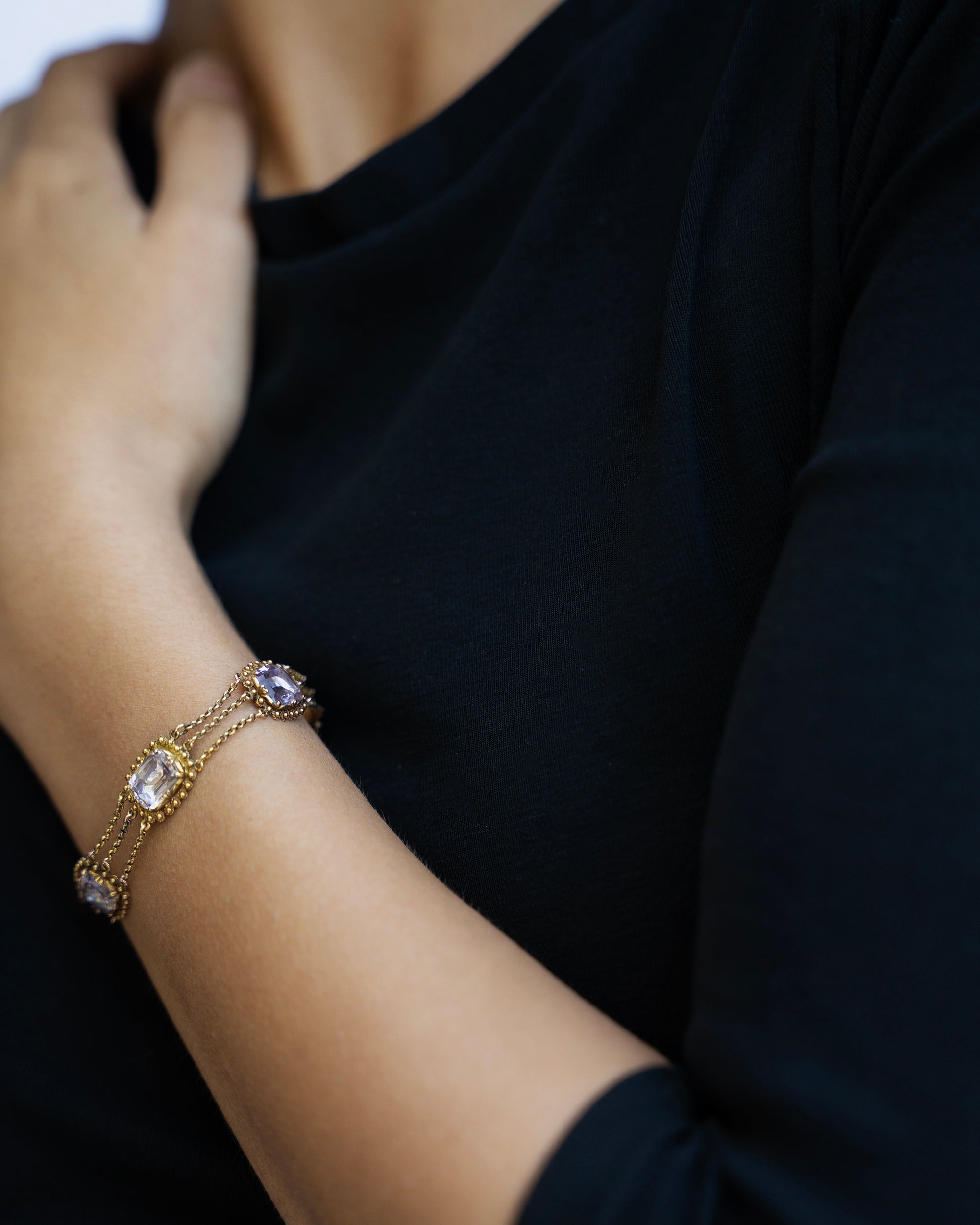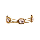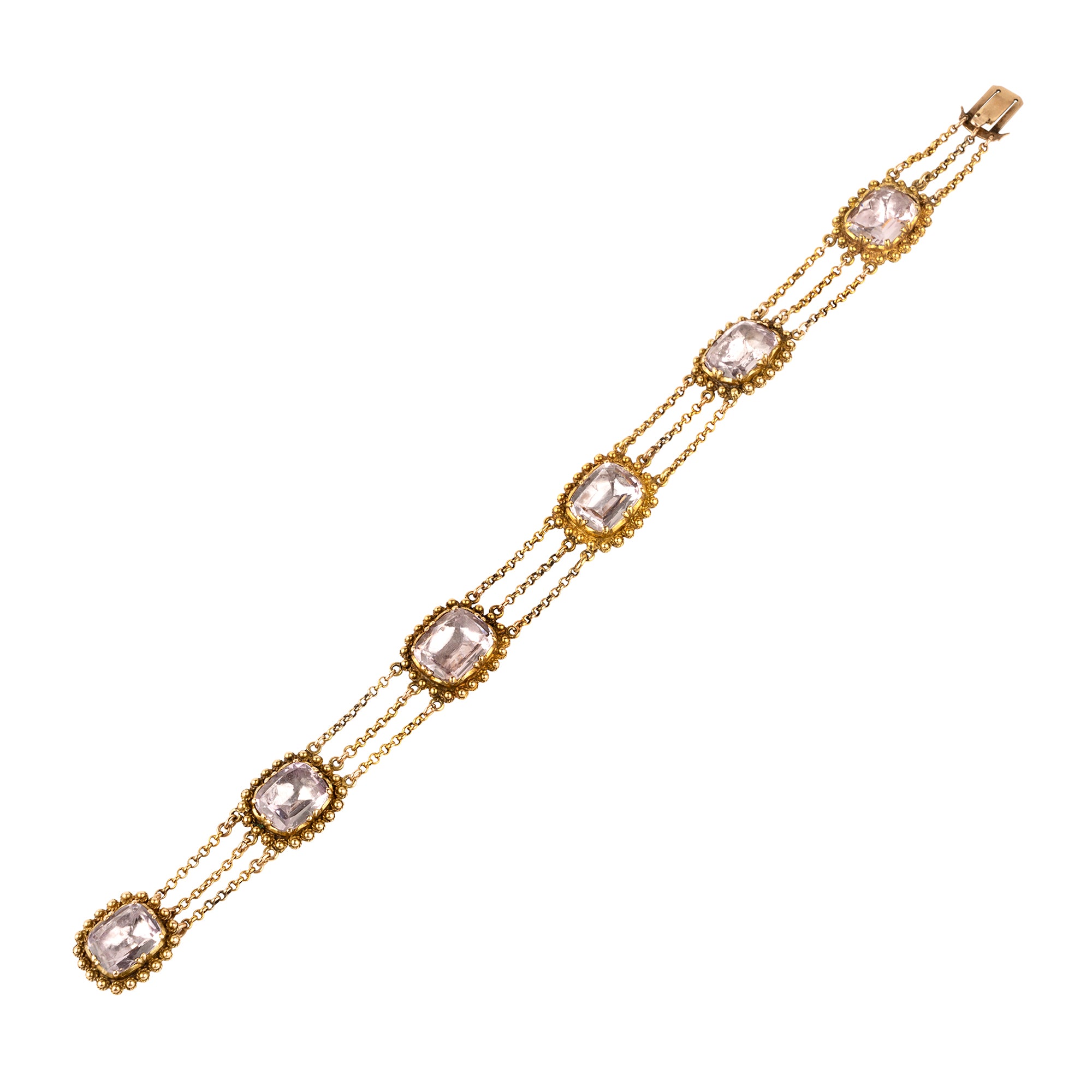 Multiple strands of micro belcher chains with six foiled pink rock-crystal stones set in delicate 18k gold. The stone's color is enhanced by colored foil beneath each setting. Beautiful cannetille gold details surrounding each stone.