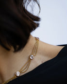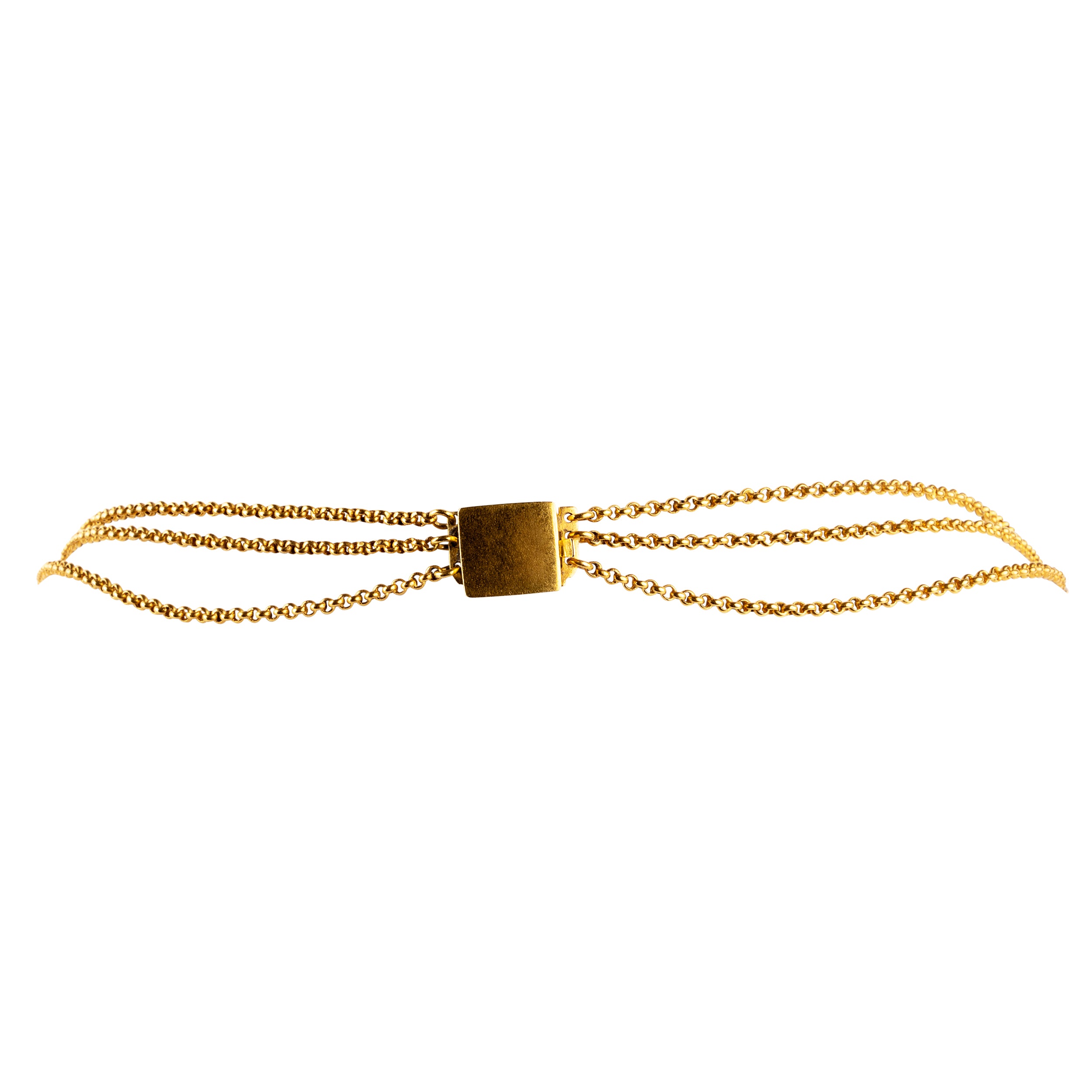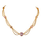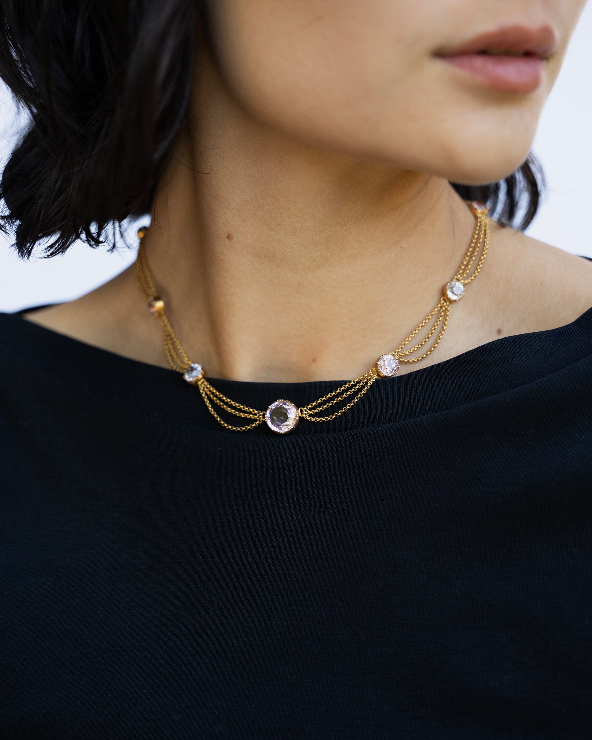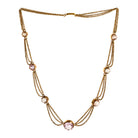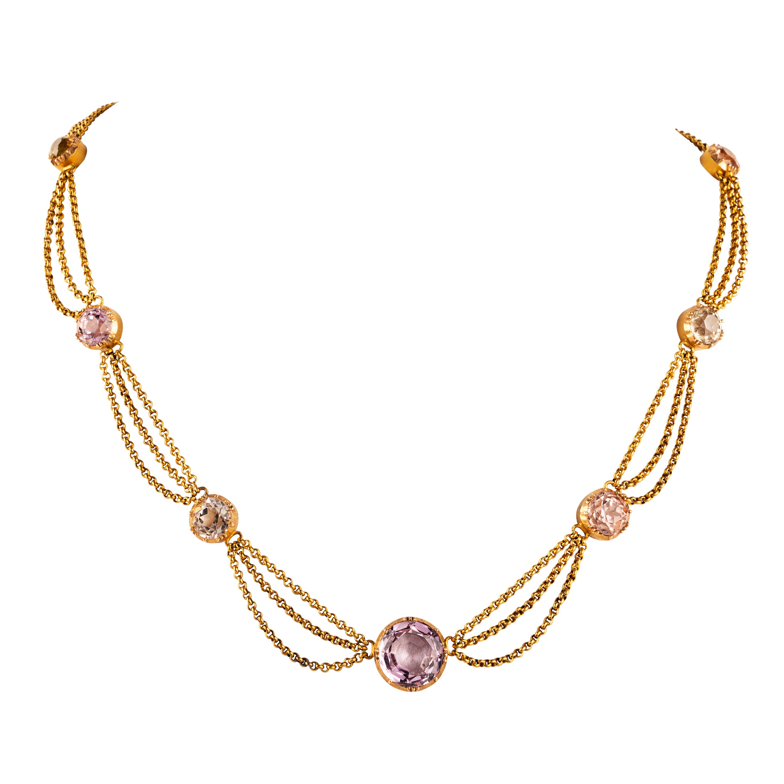 Micro belcher chains with six graduated pink and white topaz stones set in 18k gold. England.