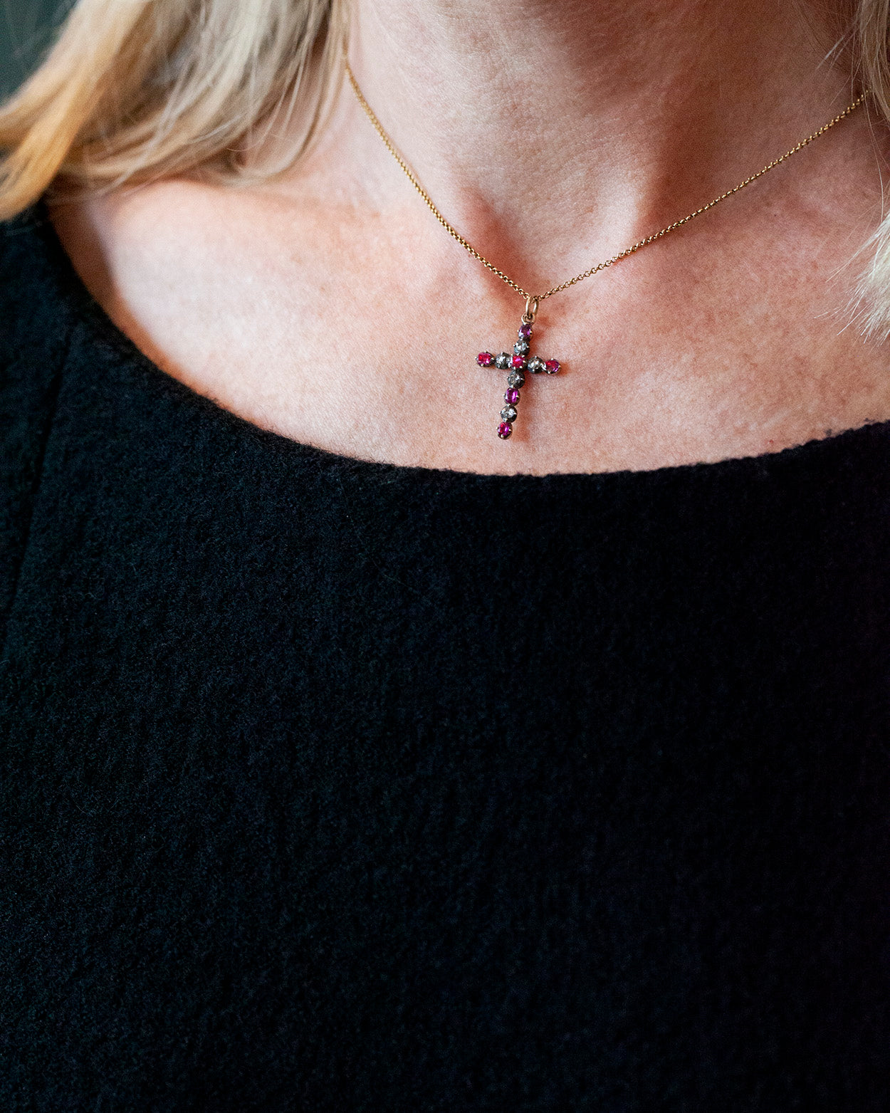 Diminutive Early 19th century cross pendant with bright rose cut diamonds and deep red rubies. Set in silver topped gold cut-down settings. English in Origin, Circa 1820