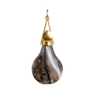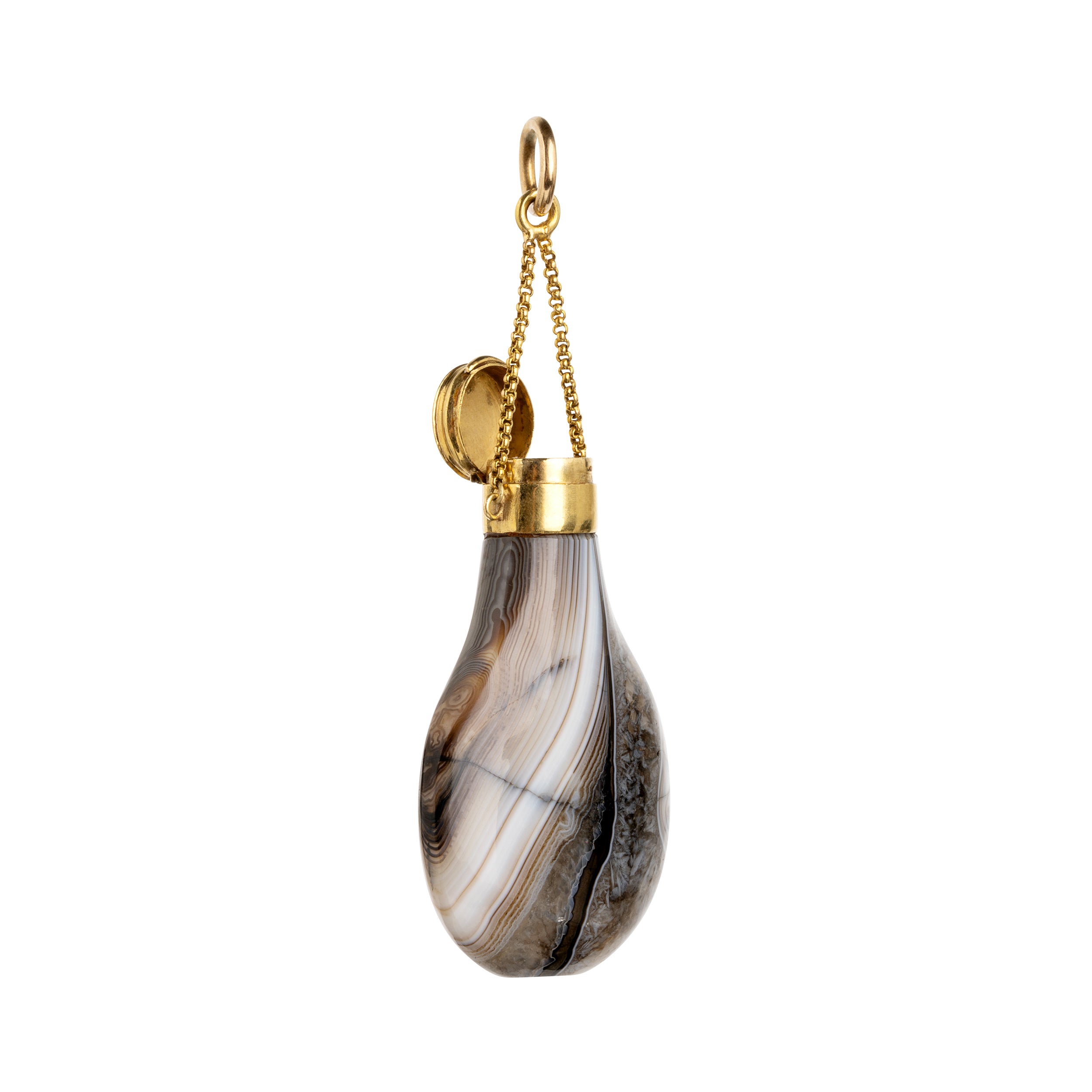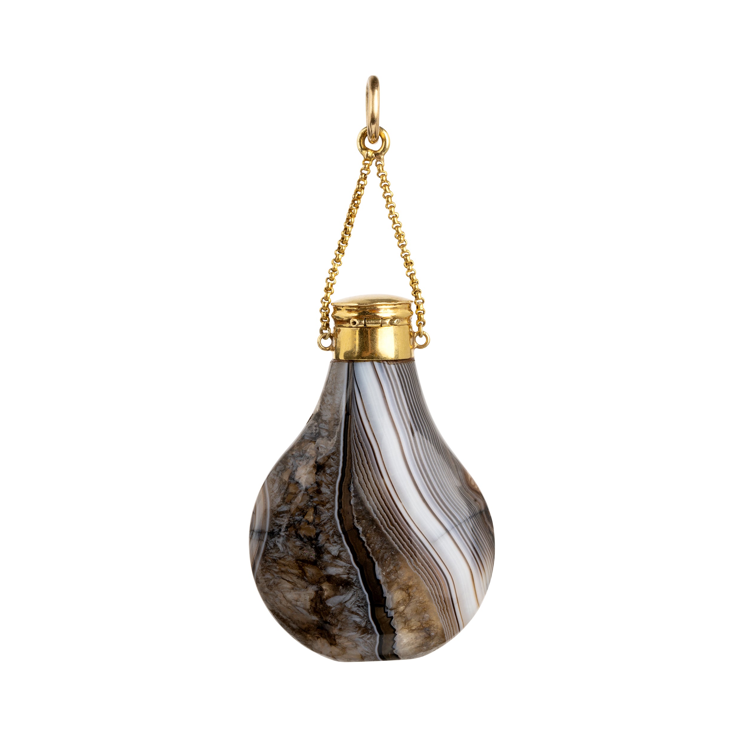 A compact vessel is carved from a single piece of agate with 18k gold fittings.  A delightful way to carry your favorite scent.