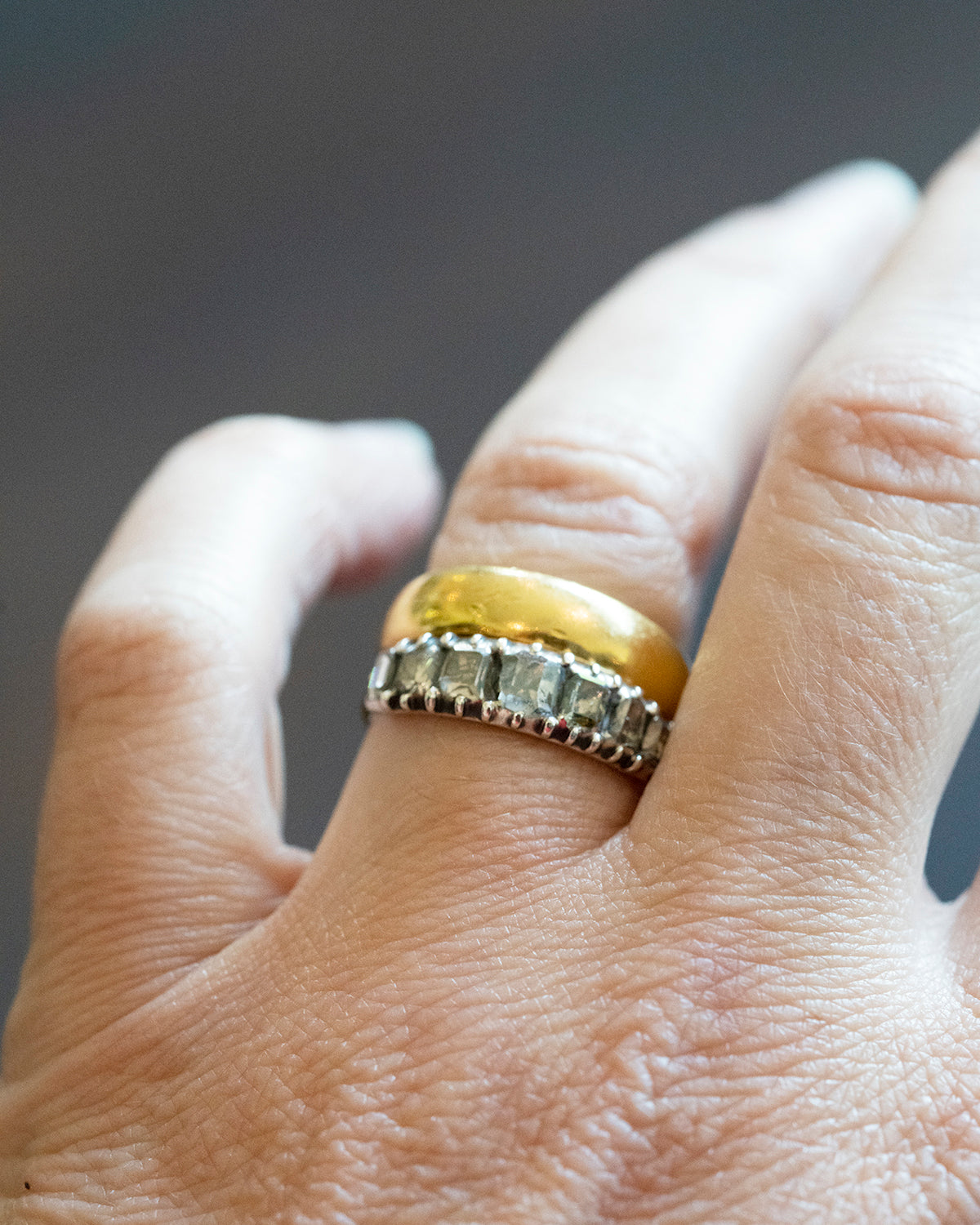 Georgian Era Table cut diamond half hoop band. 7 Table cut diamonds set in a silver closed back setting on a gold band. English in origin, found in London. Circa 1810.