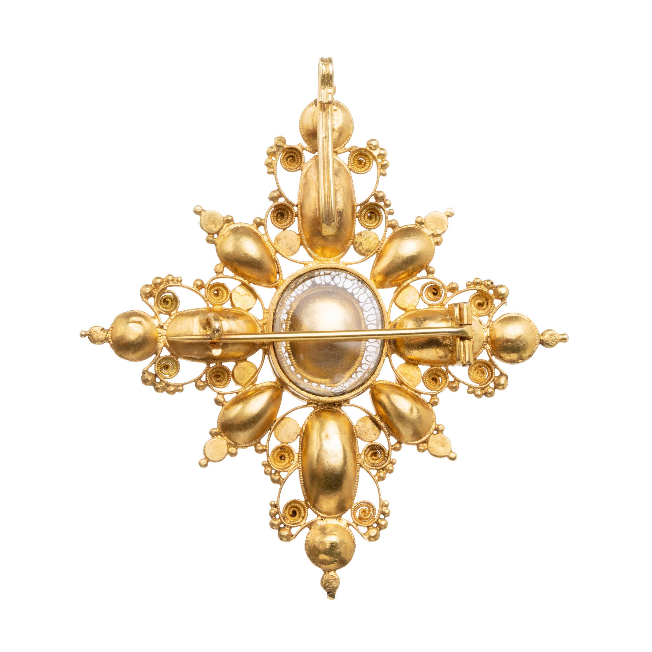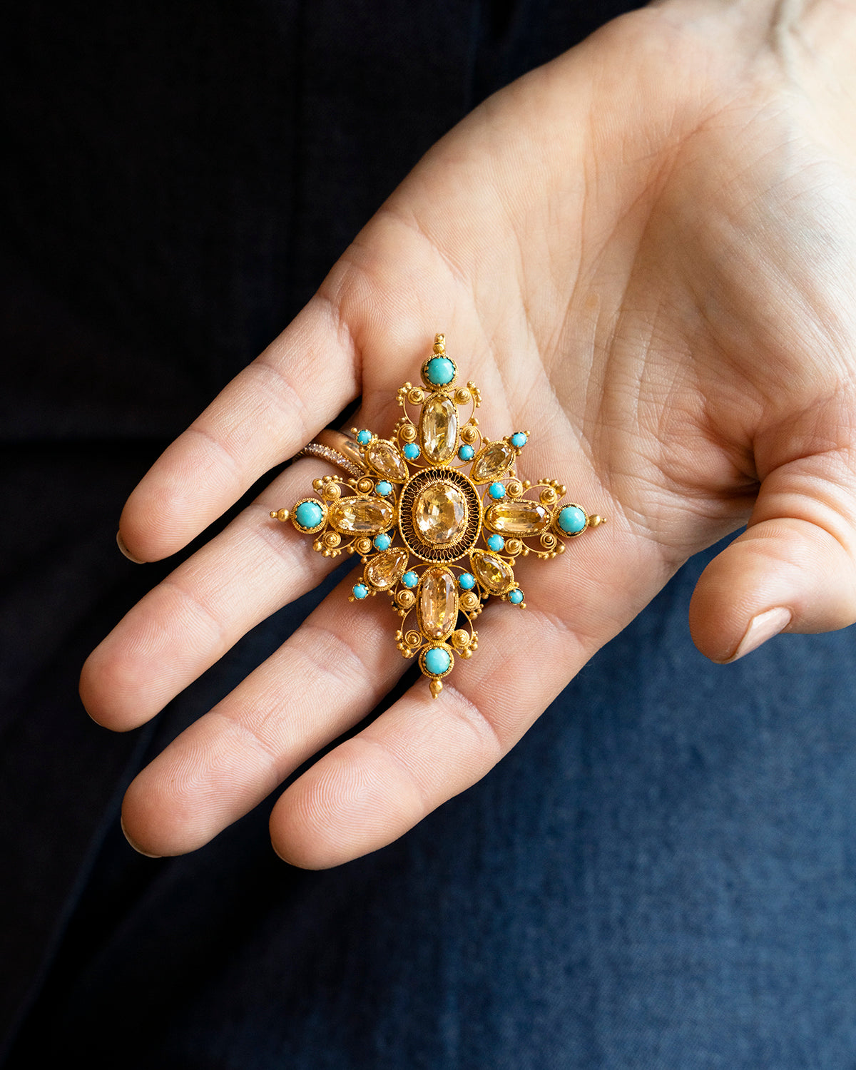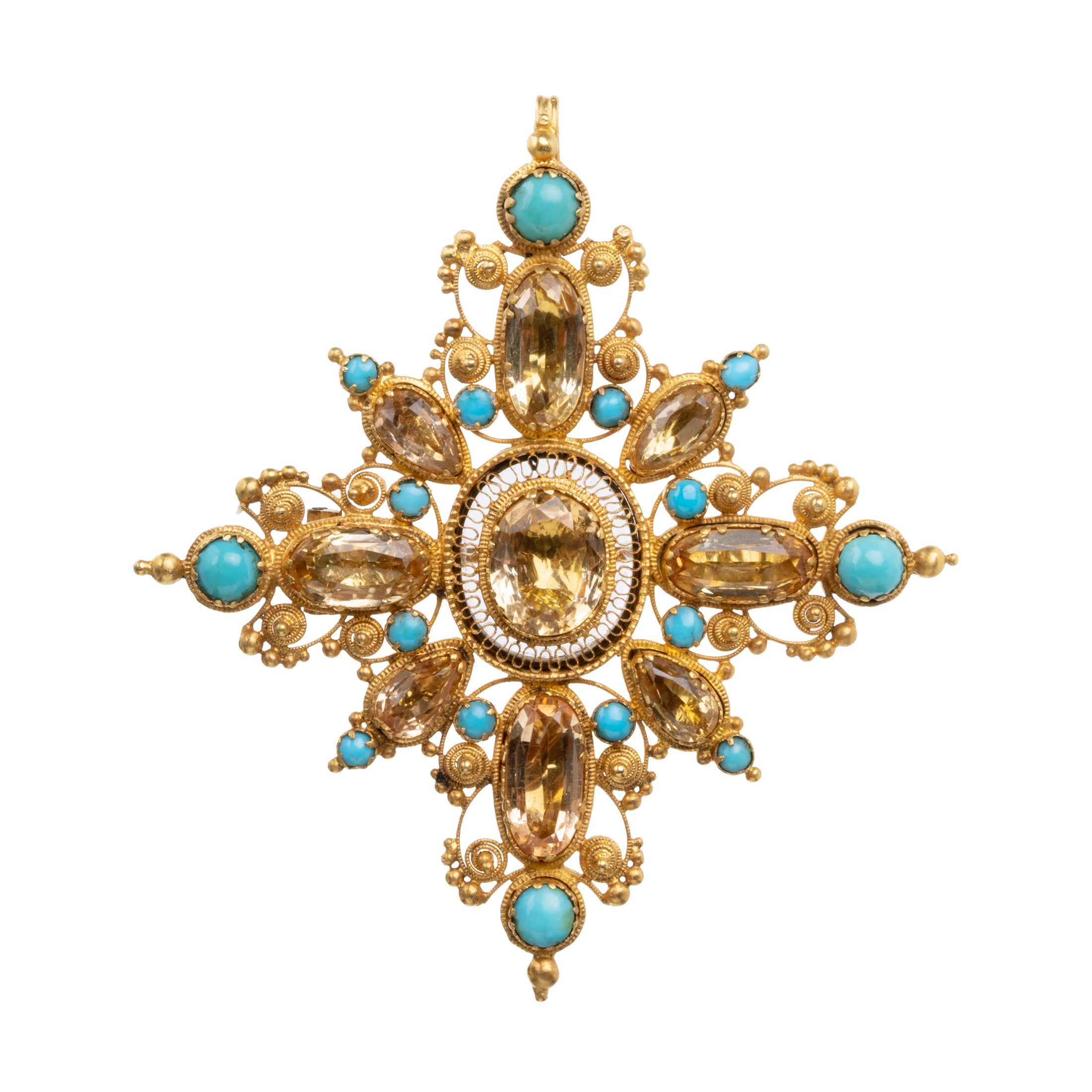 Beautiful cruciform pendant with bright topaz and turquoise stones. Intricate gold work in high carat gold. Convertible from a pendant into a brooch. English in origin. Circa 1830. Glass locket compartment is intact but not easily accessible.